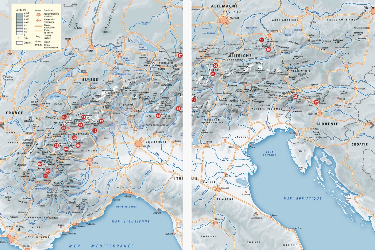 En complément, des indications sur l’équipement nécessaire, les transports en commun à emprunter, où se ravitailler et dormir, ainsi que la meilleure saison pour se lancer, s’avèrent utiles pour bien s’organiser avant de claquer la porte. Les parcours empruntent parfois des chemins détournés ou délaissés, comme celui qui passe par le pas la Rosse pour atteindre le refuge du Pelvoux. Parfois en pointillés son indiqués des circuits alternatifs, qui pour gravir un sommet en aller-retour, qui pour jouir d’un col peu emprunté.