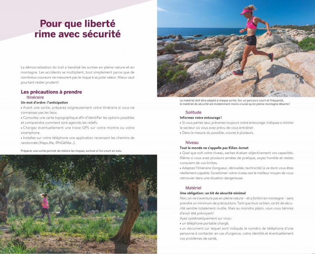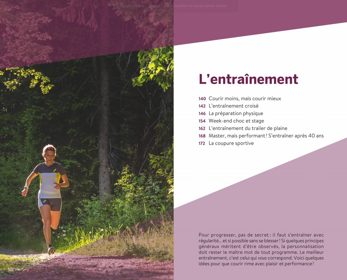 Découpé en 11 grandes parties, le guide aborde de manière progressive les techniques, les matériels, la nutrition, la préparation mentale, ainsi que l’entraînement et la compétition. L’on pourrait même parler d’exhaustivité tant l’autrice, Marie Paturel, entre savamment dans les détails : de la composition des chaussettes aux manchons de compression du mollet en passant par des informations sur les glucides et le stock de glycogène, les étirements passifs, les bonnes techniques de course en montée, etc., rien n’est laissé au hasard. De nombreux encadrés sur fond violet parsèment chaque chapitre pour que le coureur ne passe pas à côté d’informations primordiale sur l’équilibre acido-basique, l’autonomie, les compléments alimentaires, les effets de l’altitude, etc. Un chapitre est également consacré au trail au féminin et notamment au fait de courir tout en étant enceinte, à la condition bien évidemment de respecter quelques règles de base. L’ouvrage se termine par la présentation de 10 séances poussées d’entrainement (Myo Cross Max, Gimenez, VMA en côte, etc.) afin que tou novice qui débute ses premières foulées finissent pas devenir trailer accompli !