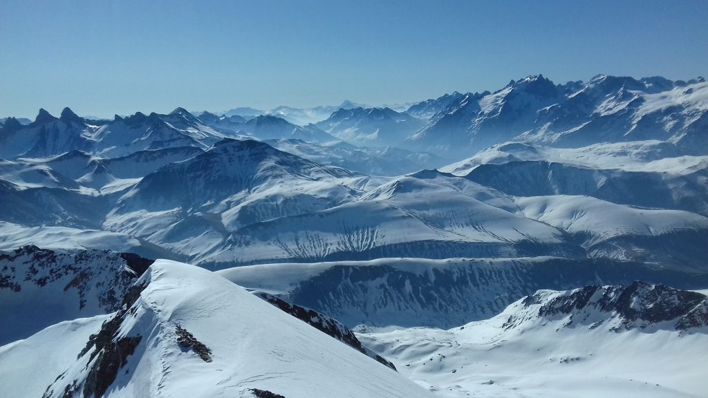 J’arrive en tête au sommet suivi d’Olivier. Nous attendons les filles qui ont été obligées de déchausser pour se hisser à leur tour à notre niveau avec leurs grosses chaussures de ski, certainement moins pratiques que des bonnes « grosses » de montagne ! Congratulations et selfies obligatoires, d’autant que le panorama est exceptionnel. La redescente s’effectue par le même itinéraire. Les pentes qui nous paraissaient raides à la montée ont été rapidement dévalées en crampons, tant la texture de la neige était encore acceptable. Elles nous ont rejoints bien après puis nous ont rapidement distancées. Il n’empêche que gravir un sommet en raquettes puis crampons ne prend pas forcément plus de temps qu’en ski de rando. La dernière partie de notre balade fut en revanche longue, très longue… Plusieurs kilomètres avec arrêt au col Nord des Lacs pour nous restaurer puis plongée vers Saint-Sorlin-d’Arves sur les pistes de ski damée, empêchant ainsi de trop nous enfoncer. Arrivés à la voiture, nous avons pris la direction de Bonneval-sur-Arc pour de nouvelles aventures !