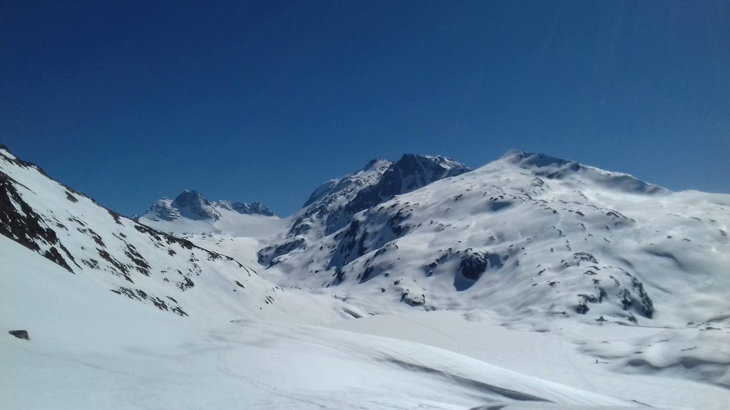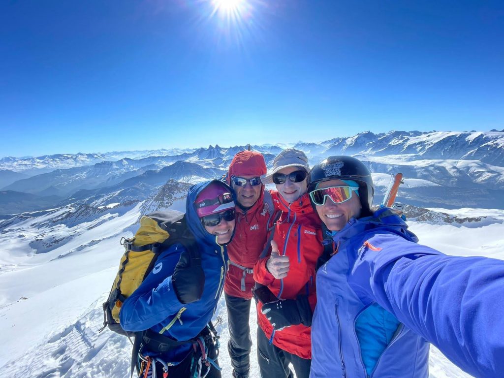 J’arrive en tête au sommet suivi d’Olivier. Nous attendons les filles qui ont été obligées de déchausser pour se hisser à leur tour à notre niveau avec leurs grosses chaussures de ski, certainement moins pratiques que des bonnes « grosses » de montagne ! Congratulations et selfies obligatoires, d’autant que le panorama est exceptionnel. La redescente s’effectue par le même itinéraire. Les pentes qui nous paraissaient raides à la montée ont été rapidement dévalées en crampons, tant la texture de la neige était encore acceptable. Elles nous ont rejoints bien après puis nous ont rapidement distancées. Il n’empêche que gravir un sommet en raquettes puis crampons ne prend pas forcément plus de temps qu’en ski de rando. La dernière partie de notre balade fut en revanche longue, très longue… Plusieurs kilomètres avec arrêt au col Nord des Lacs pour nous restaurer puis plongée vers Saint-Sorlin-d’Arves sur les pistes de ski damée, empêchant ainsi de trop nous enfoncer. Arrivés à la voiture, nous avons pris la direction de Bonneval-sur-Arc pour de nouvelles aventures !