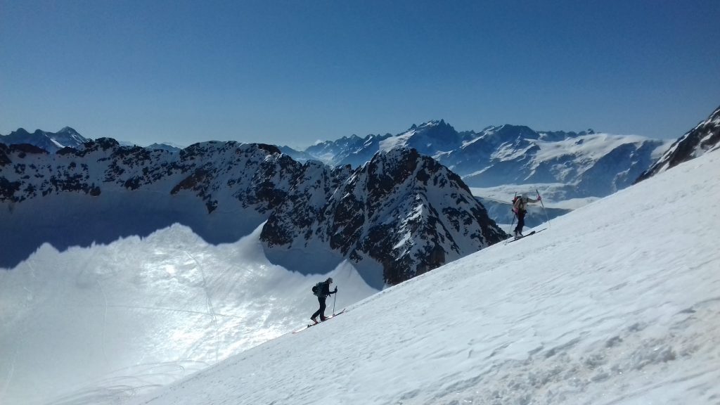 Apparaissent les premières pentes sur un glacier totalement bouché et en voie certaine de disparition selon les derniers relevés affichés dans le refuge. Il nous reste à gravir environ 800 m de dénivelé sur des pentes qui finissent par se relever sur la seconde partie de l’itinéraire. Alors que les skieuses effectuent de larges zigzags, nous nous élevons face à la pente ou en effectuant de petits virages. Les raquettes font ici merveille. Puis la dénivelée s’accentue et nous les troquons contre nos crampons. Le piolet est aussi le bienvenu à l’approche du sommet dont les dernières longueurs s’effectuent dans un terrain en mixte que nous apprécions particulièrement.