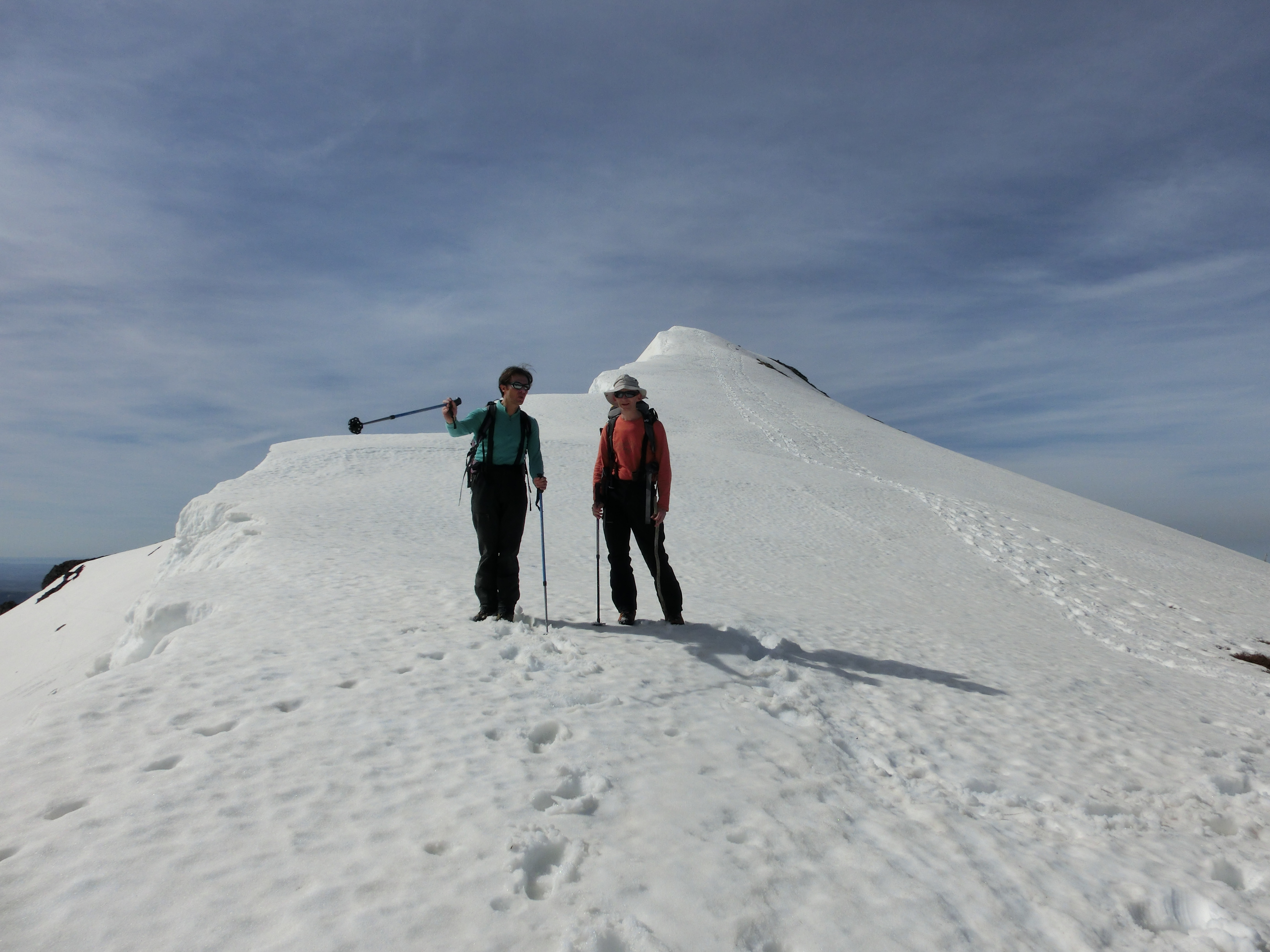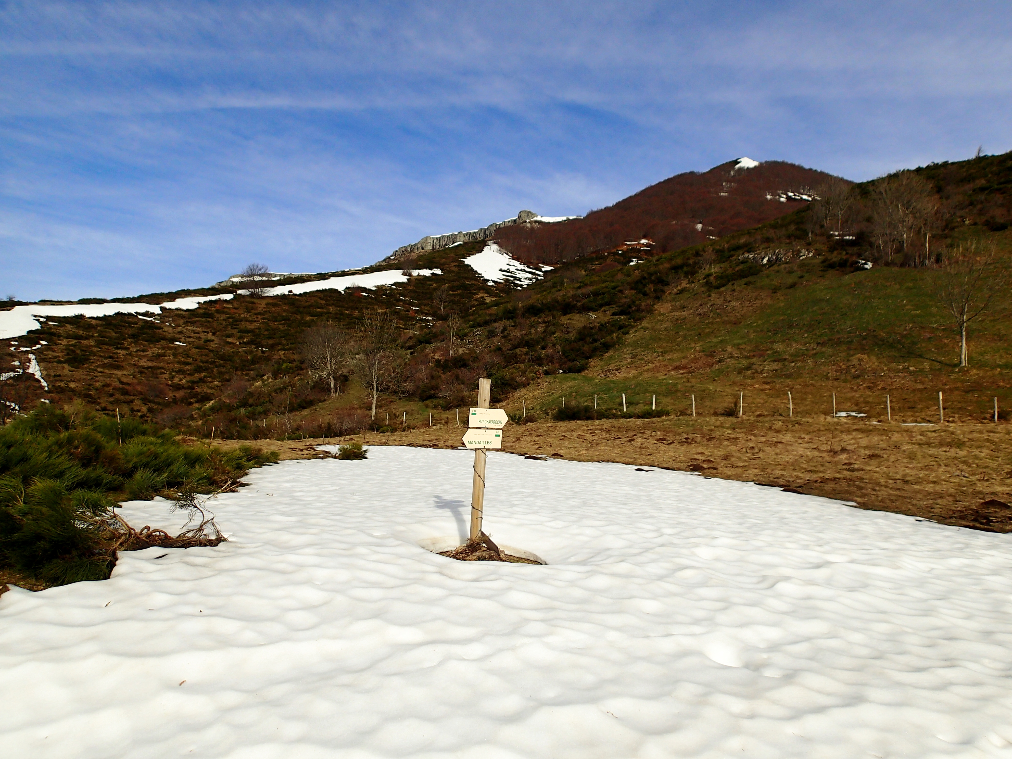 IMAG0192A tel point qu’à 2 heures du matin, nous nous réveillions de concert, frais et dispo et sans dyspepsie aucune, déjà prêts à entamer au pas de charge la montée au premier Puy à la frontale. Mais il était beaucoup trop tôt pour lever l’ancre et qui plus est, nous avions besoin d’engranger des calories. Nous avons donc fini par nous rendormir à contre-cœur, jusqu’à l’heure du ptit déj relativement copieux, lui. Puis notre départ pour le puy de Piquet s’effectua vers 9 h sous un ciel bleu légèrement voilé. Le chemin, bien balisé, nous a vite fait croiser nos premiers névés. Nous avions pris la précaution d’emporter piolets et crampons, Guiguite ne sachant pas très bien quelle quantité de neige il demeurerait en cette saison sur les crêtes. Le chemin, continuant en sous-bois et ayant tendance à piquer du nez, nous avons décidé de le quitter pour attaquer la pente plus ou moins en direct, et ainsi parvenir assez rapidement à découvert, à l’attaque de la première crête menant à la cime.