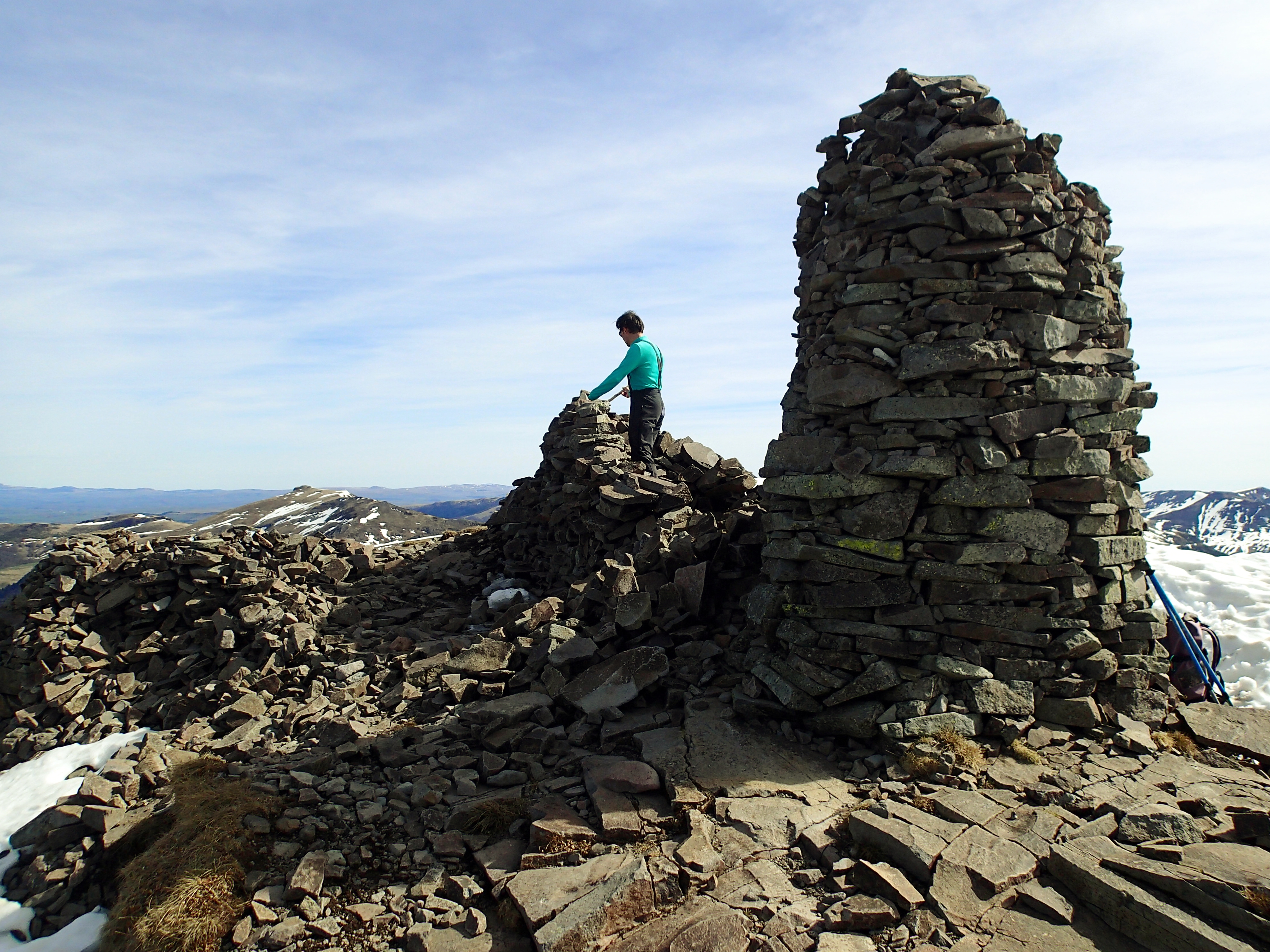 Voilà une sorte de long terre-plein rectangulaire affublé d’un « homme de pierre », menhir façonné au fil du temps, les randonneurs y déposant un bout de roche supplémentaire afin d’immortaliser leur passage en ces lieux. Nous avons été récompensés par un beau point de vue du haut duquel nous apercevions la chaîne du Sancy, encore bien enneigée en cette période de l’année. Après une pause Pom’Pote et Eat Natural (merci Christophe !), nous avons pris la direction de la star de ces lieux : puy Mary. Mais avant d’y poser les pieds, nous devions impérativement passer sous la Chapeloune, autre sommet situé au-dessus du col de Redondet, mais dont les pentes enneigées s’avéraient peu engageantes. Et voilà qu’un randonneur à ski parvient au col au moment même où nous l’atteignons, un gars du coin qui nous suggère de l’escalader, ou du moins le contourner au plus-près afin d’éviter de nous engager dans la pente. Je suis de près Olivier et bien vite nous nous apercevons que la neige s’en est allée pour laisser place à un vague chemin un peu aérien mais qui, finalement, constituera la meilleure option de passer l’obstacle formé par cette Chapeloune rocheuse.