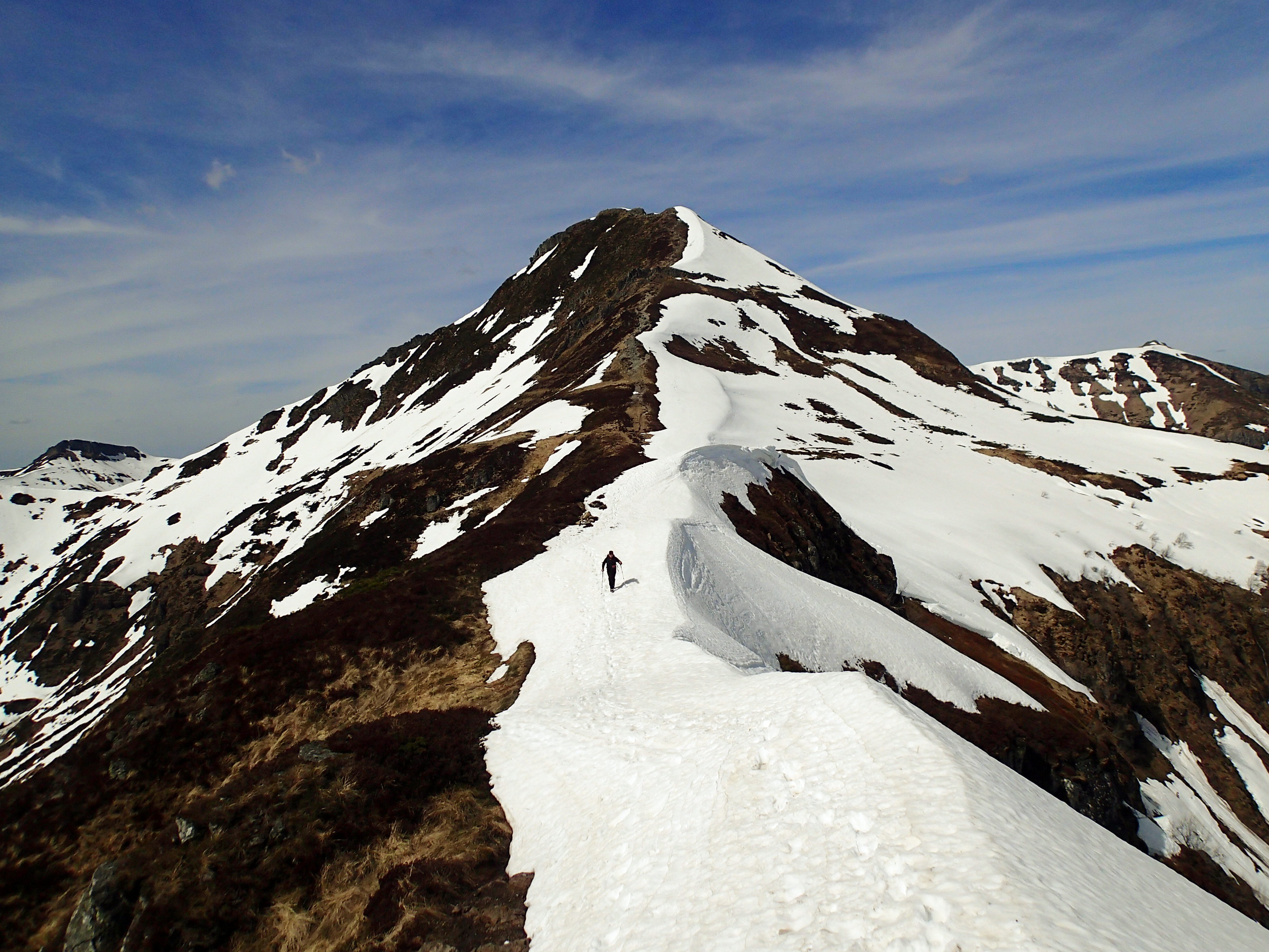 OLYMPUS DIGITAL CAMERAChouette cheminement que cette douce arête que je gravis rapidement pour me retrouver bon premier au sommet du puy. Si Olivier n’avait pas eu un souci à régler en urgence au téléphone ce jour-là, je ne pense pas que j’y serai arrivé en tête ! De là-haut, une vue imprenable sur la vallée de Mandailles et vers le Sud nous attendait. Et déjà la suite se profilait sous nos yeux : une longue redescente avant l’attaque du puy Chavaroche, puis redescente à nouveau avant de nous diriger vers puy Mary et sa merveilleuse arête Sud-Est. Après une première halte, nous avons repris le chemin vers Chavaroche et l’avons approché la plupart du temps dans une neige molle de printemps, sans toutefois trop nous enfoncer. Fort heureusement d’ailleurs étant donné que nous avions laissé les raquettes dans le coffre de la voiture. Nous n’avons pas tardé à rejoindre son sommet culminant à 1739 m d’altitude.