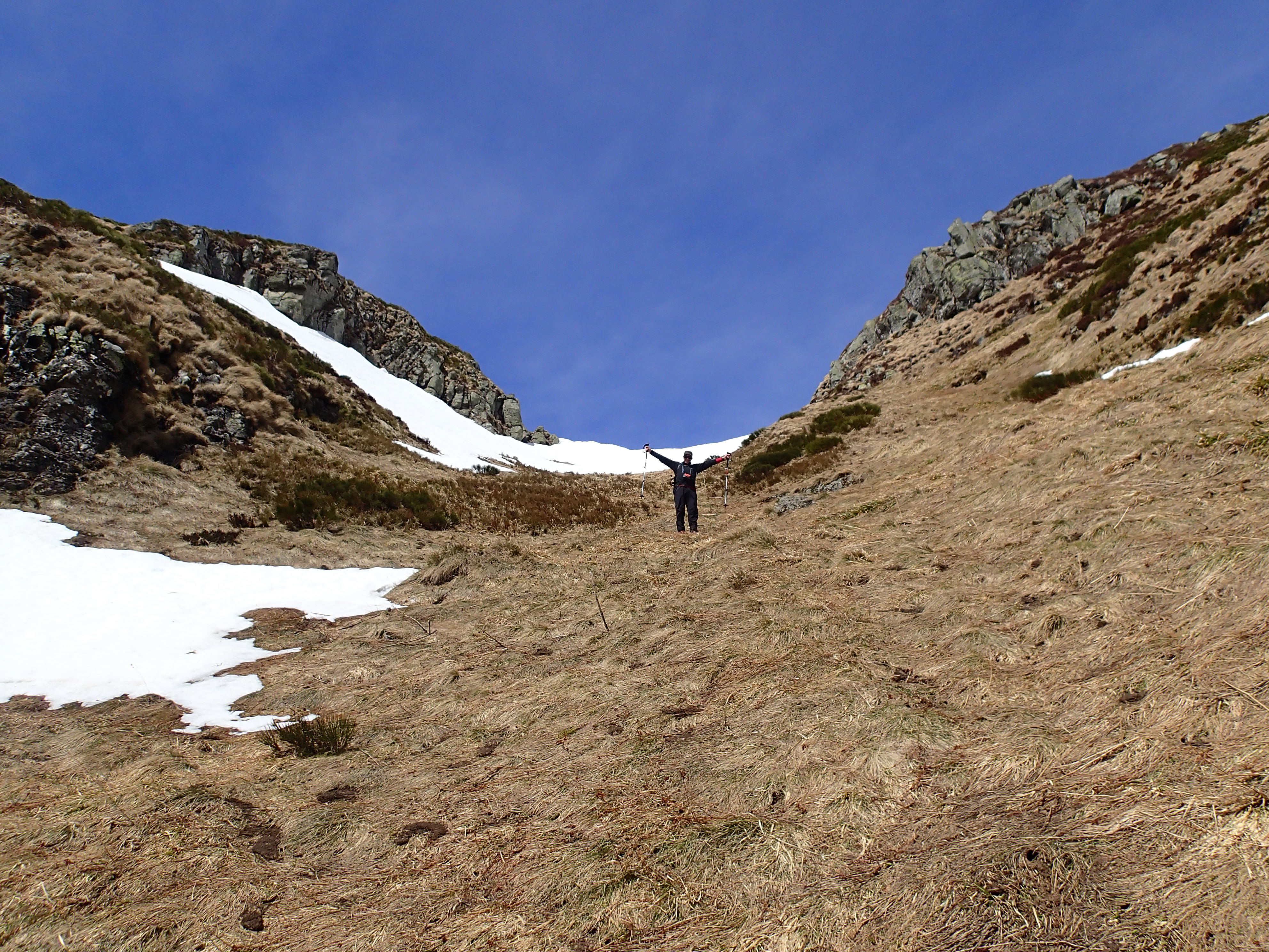 Plusieurs mètres de neige la recouvre, si bien qu’il serait aisé de la traverser. Ce sera pour une autre fois. L’heure tournant et le fait de devoir remonter sur Paris le soir même nous incite à mettre ici un terme à notre chevauchée. Mais nous reviendrons ! Pour attaquer ces belles crêtes en sens inverse du puy Griou au puy de Peyre Arse jusqu’au puy Mary et au-delà. Olivier s’engage en tâtant le terrain. Après une courte descente sur rocher, il prend facilement pied sur la neige directement en contrebas de la brèche.