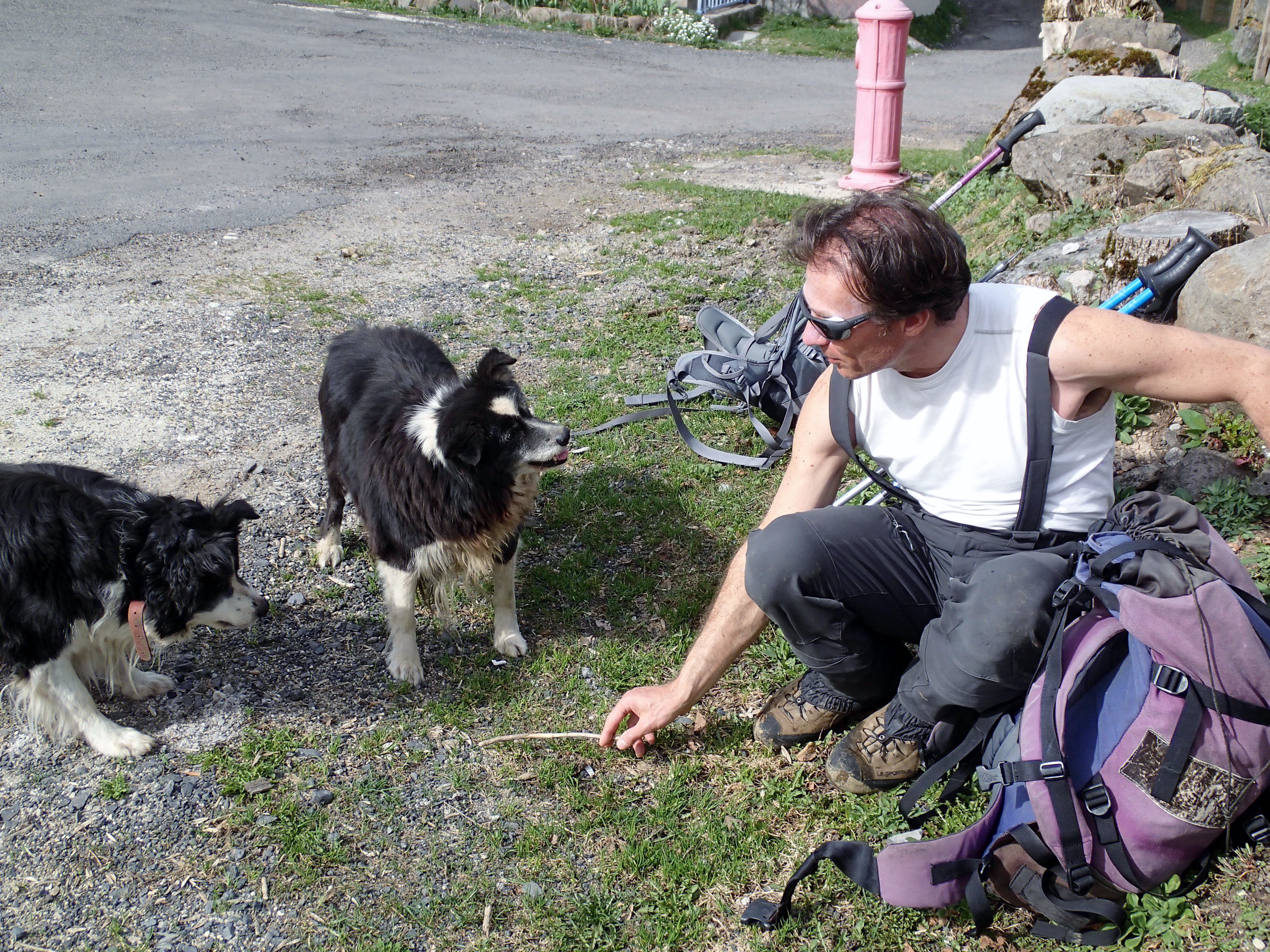 Christophe et moi le suivons précautionneusement puis tout trois redescendons facilement cette belle montagne jusqu’à la route déserte et enneigée. Elle nous mène à un parking où nous stoppons histoire d’avaler à nouveau quelques barres et Pom’Pote. Le retour est enchanteur puisque, grâce à un chemin assez mal balisé, nous plongeons au cœur de la vallée de la Jordanne dans une forêt demeurée assez sauvage, jusqu’à la rivière à fort débit. Puis, peu à peu la pente se fait plus douce et la forêt laisse place à une campagne ponctuée de petits hameaux. Nous nous arrêtons à Liadouze. C’est à cet endroit que, bravant sa peur, Olivier saisit un bâton au nez et à la barbe de deux chiens férocement enragés pour le lancer au loin et se débarrasser de ces créatures des enfers !
