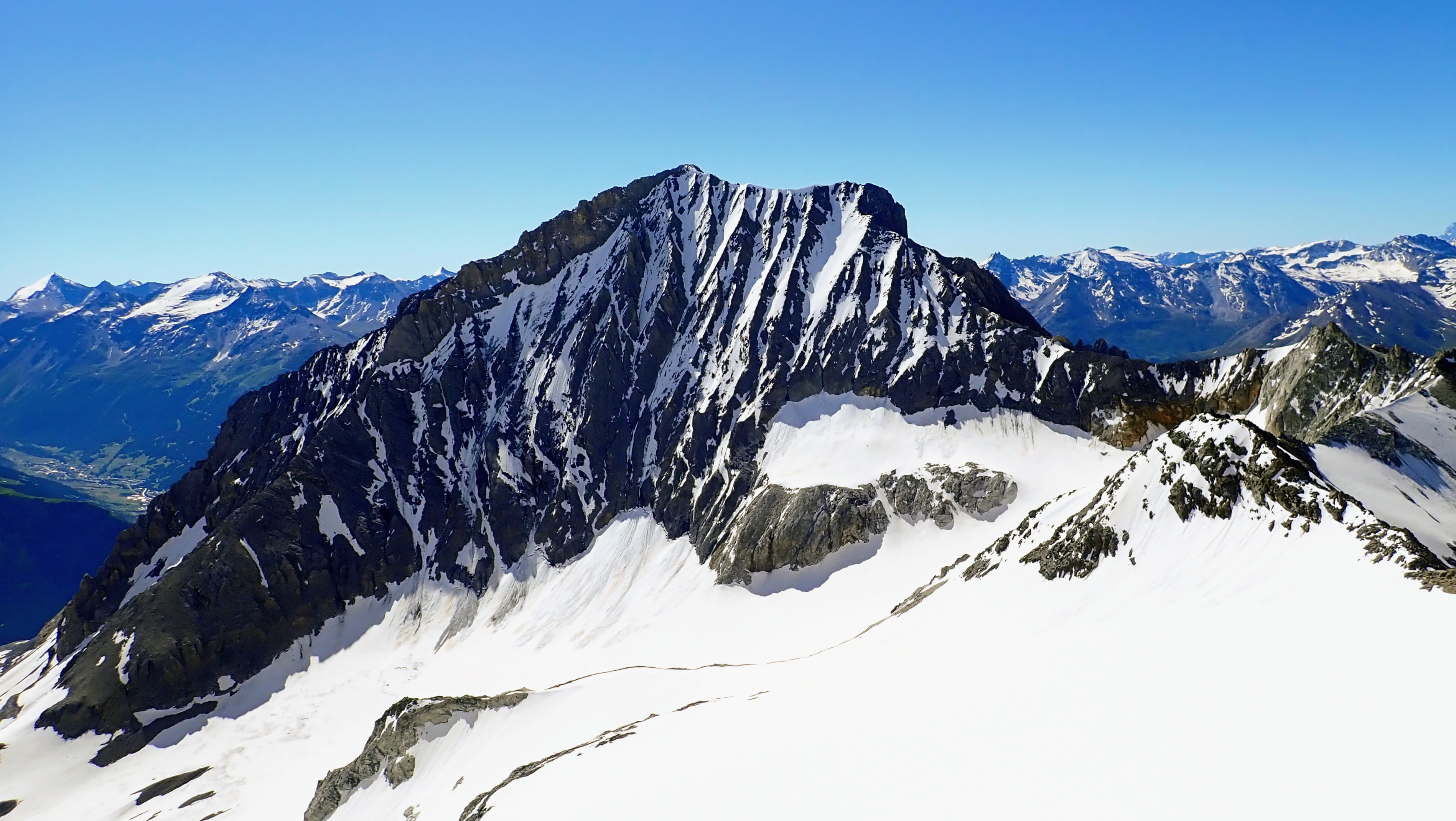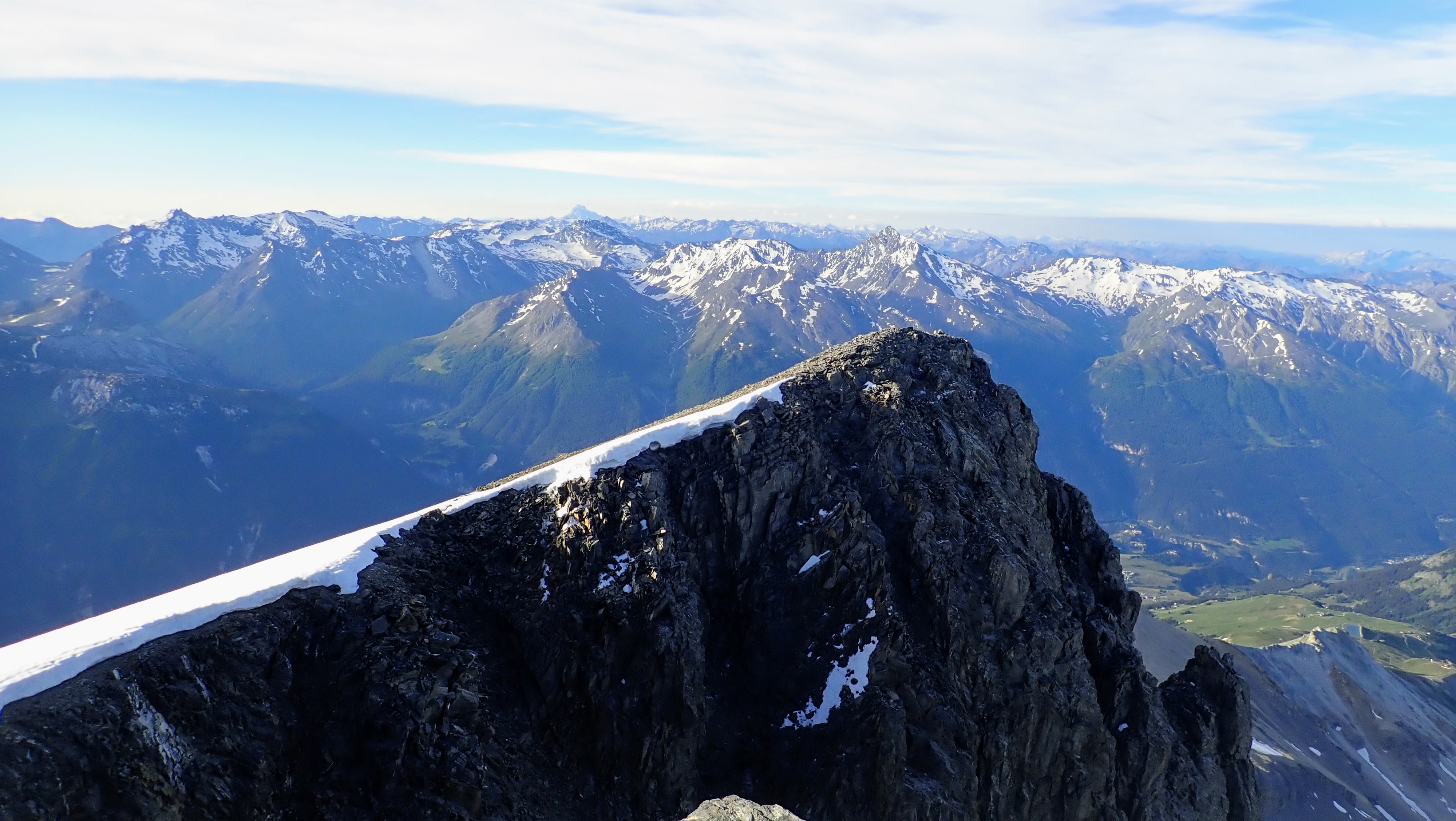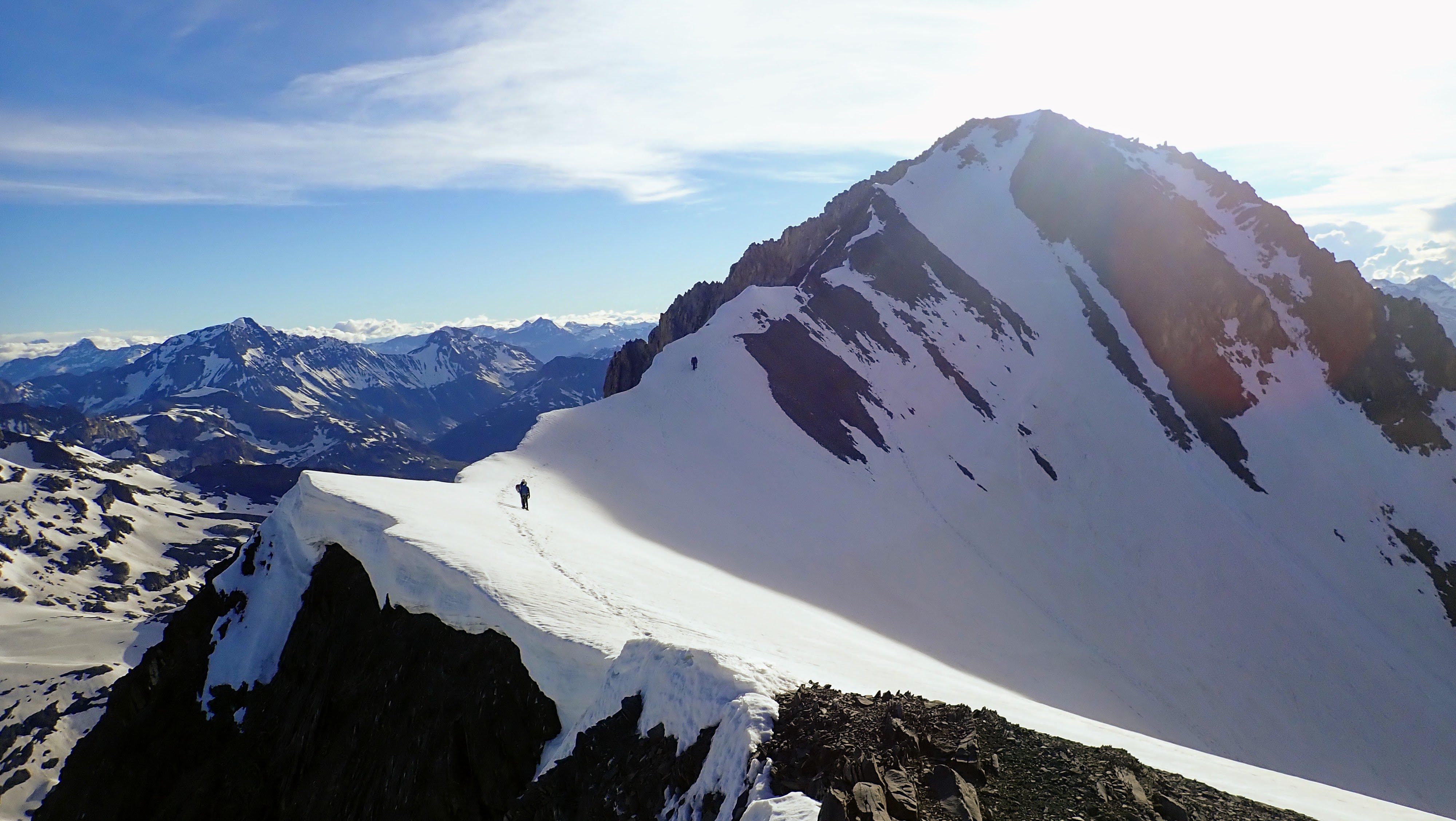 L’approche finale de la Parrachée flirte avec les abîmes lors de la remontée d’une arête en neige avant de basculer sur l’arête sommitale vêtue d’une belle corniche dont il valait mieux ne pas trop s’approcher. L’esthétique sommet s’atteint ensuite facilement. Nous n’étions pas les seuls ce jour là (https://youtu.be/4U93Pb1oA9M) mais déjà nous nous demandions comment nous allions redescendre. Je ne me voyais pas refaire le chemin inverse et passer un temps fou dans ce terrain délité. L’autre solution portait donc le nom de brèche de la Loza dont je me méfiais tout autant, ne souhaitant pas recevoir une callasse sur le casque ! Puis, en abordant les premières pentes, nous avons aperçu un guide et son client s’y diriger. Olivier me poussait à les suivre. Il faut dire qu’entre une belle déclivité facile en neige d’un côté et un terrain pourri de l’autre, la décision a vite été prise !