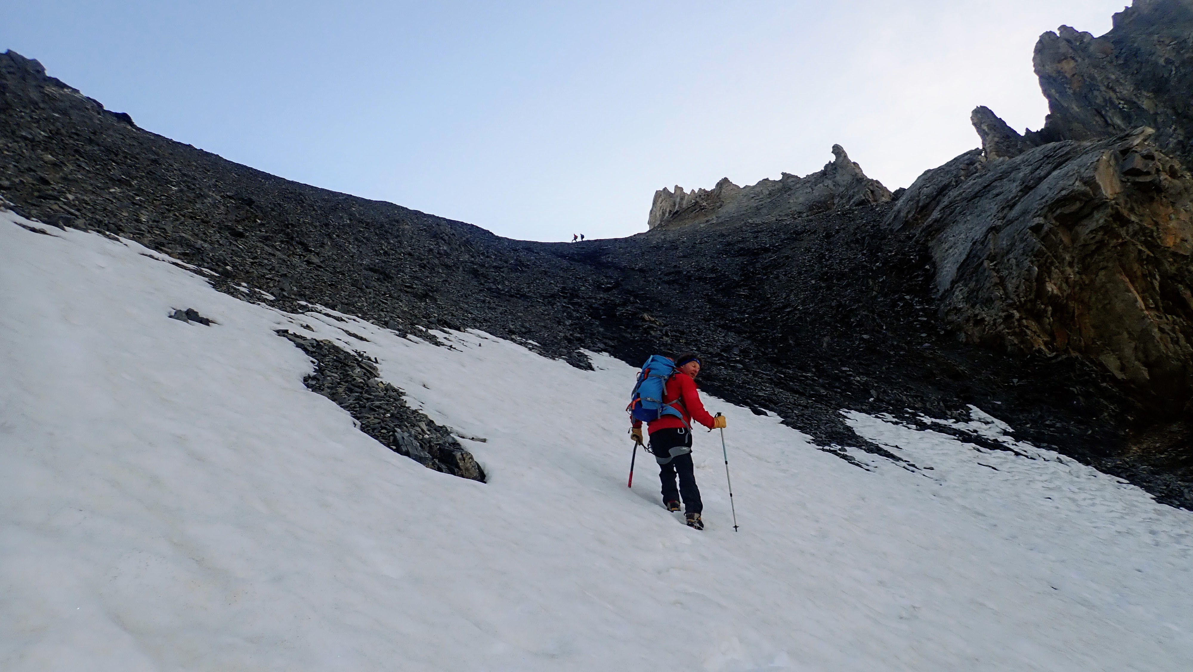 La marche d’approche jusqu’au bas du col de la Dent Parrachée ne pose aucun problème. Nous avions fait connaissance la veille sur les Arêtes du Soleil, de Thierry, guide de haute montagne, et de son client. C’est avec eux que nous nous sommes lancés dans l’aventure avant de les dépasser dans la pente de neige inaugurale. Première déconvenue, la neige avait disparu plusieurs dizaines de mètres sous le col. En lieu et place, un terrain abominable constitué d’éboulis, de pierrailles et gadoue qui glissait à chacun de nos pas. Pas vraiment une partie de plaisir sans compter la dépense d’énergie.