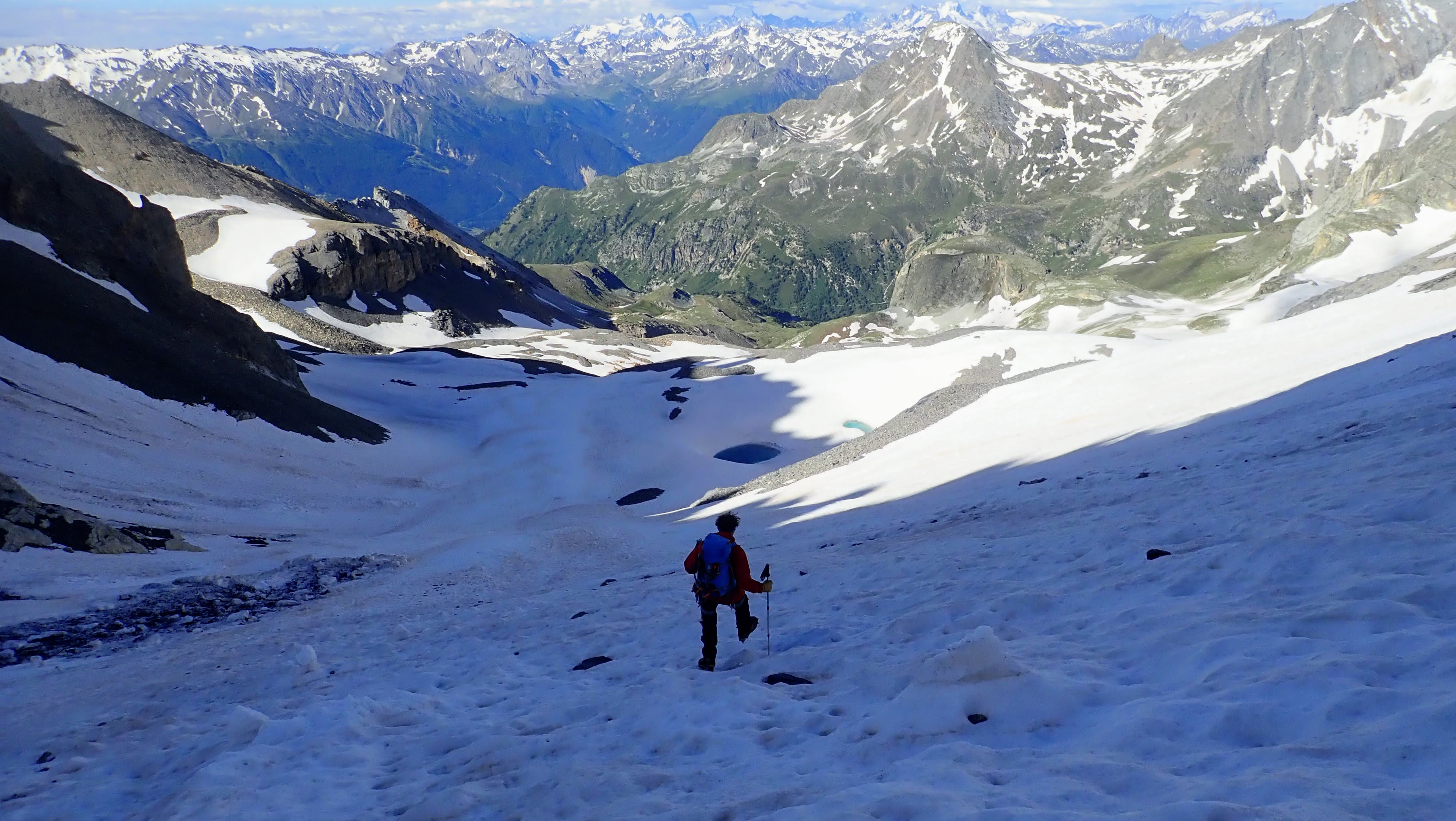 L’accès à la brèche et la brèche elle-même étaient effectivement tout en neige à travers un cheminement aisé. Il était encore tôt lorsque nous avons débuté la descente du couloir à 40° sans trop de difficulté grâce à d’énormes traces faites par la cordée qui nous précédait. Nous en sommes rapidement sortis puis avons continué dans le vallon de la Fournache.