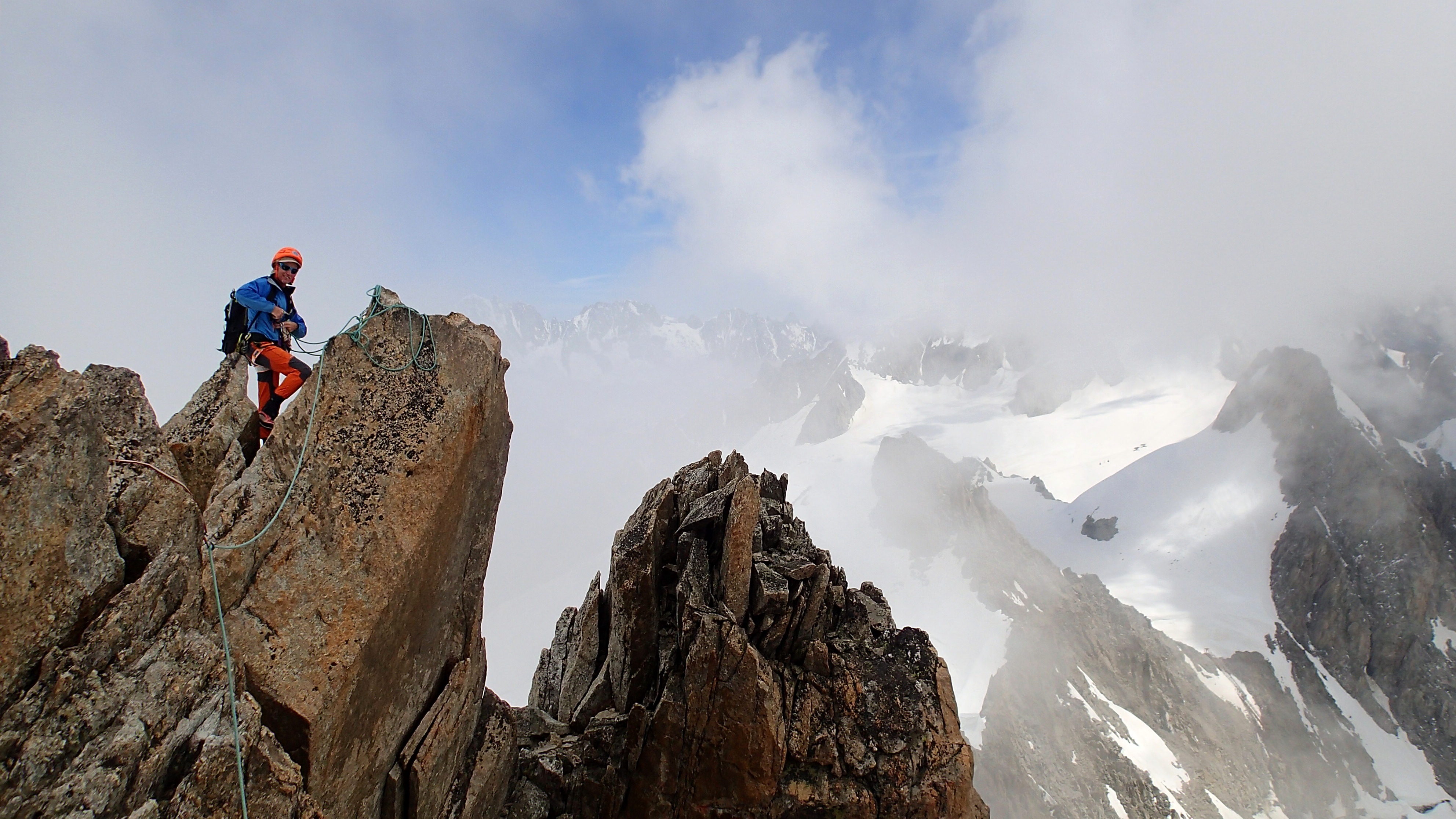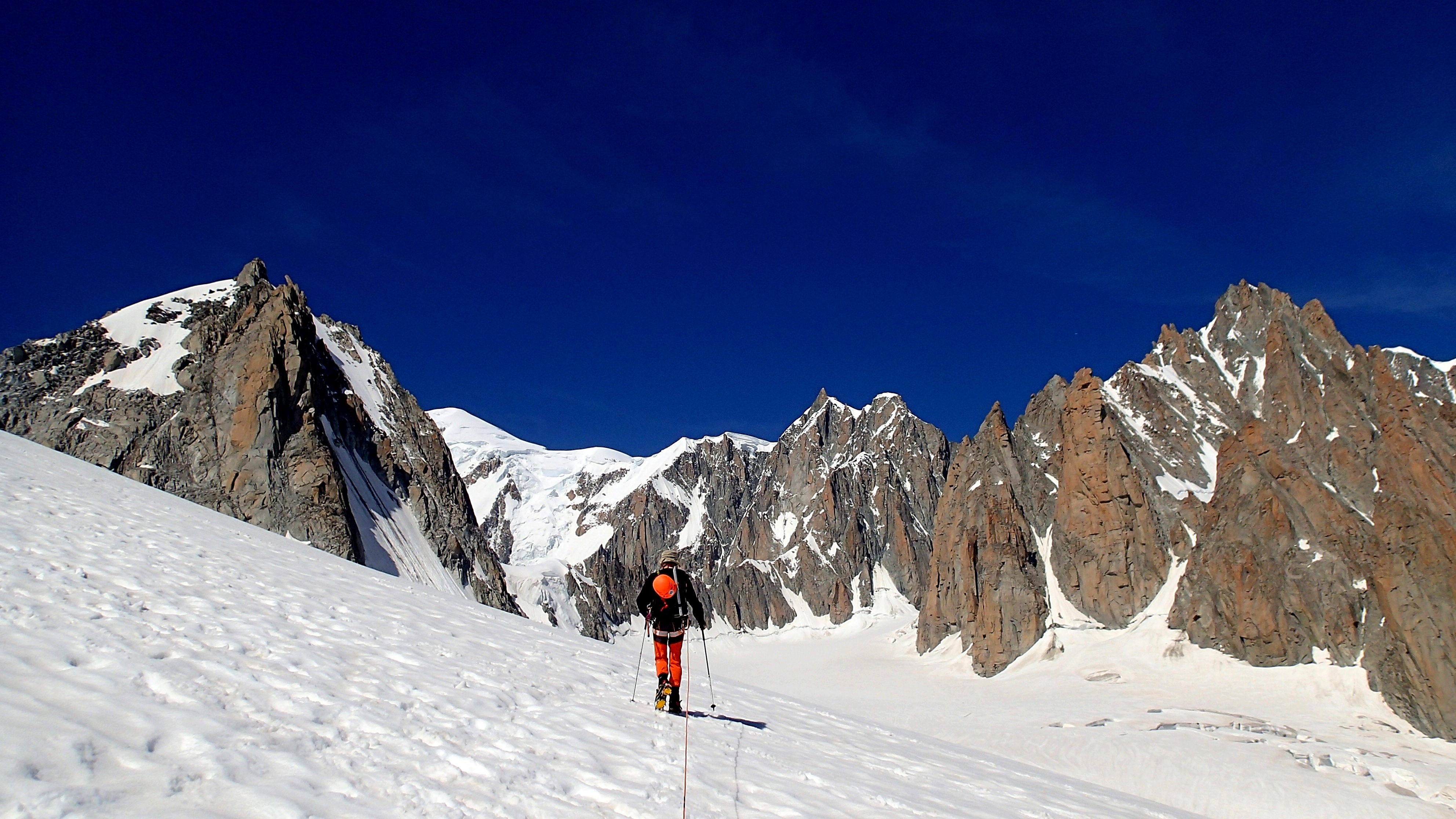Je découvrais pour la première fois le côté italien du Mont Blanc, soit un gigantesque désert blanc ondulant, avec une vue incroyable sur la dent du Géant et, au loin, l’aiguille du Midi et la majestueuse aiguille Verte. L’approche jusqu’au col est très plaisante et s’effectue en environ 1 h avec, comme paysage rêvé, la tour Ronde et le Grand Capucin, où des alpinistes avaient planté là leurs tentes en prévision de l’attaque tôt le lendemain. Auparavant, Gilles m’avait fait passer tout près d’une gigantesque crevasse où, il y a quelques années encore, se trouvait un téléski, avant que celui-ci ne finisse tout au fond, preuve une fois de plus du réchauffement climatique. Une fois arrivés au col d’Entrèves, nous sommes dans la ligne de mire du début de la course, soit un terrain en mixte s’élevant peu à peu, véritable invitation à une chevauchée menant à 3600 m d’altitude, la plupart du temps à corde tendue.