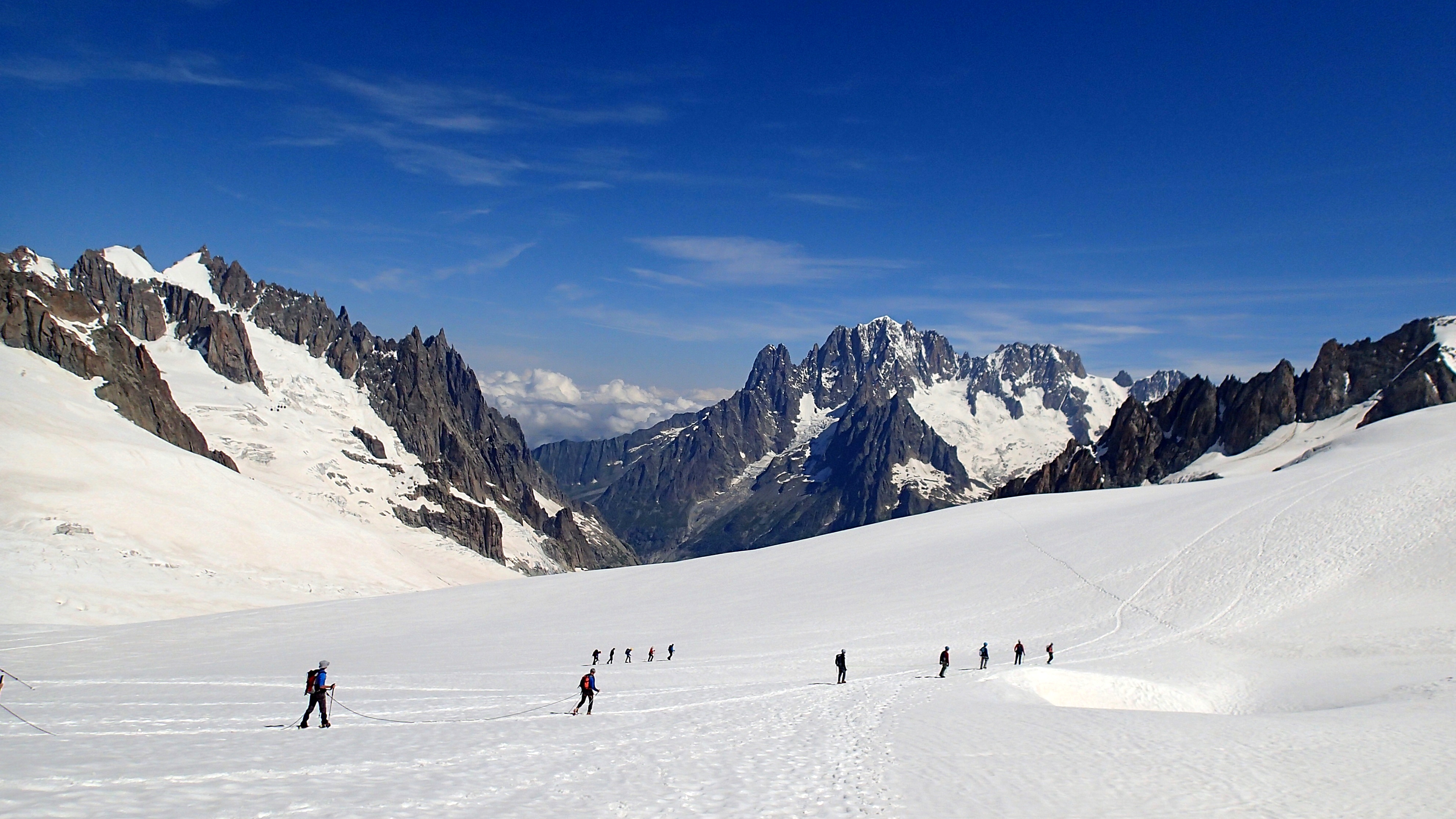 Après avoir gravi sans effort aucun et en quelques minutes seulement les quelques 2000 m de dénivelé séparant la vallée de la pointe Hellbronner grâce au tout nouveau téléphérique SkyWay Monte Bianco (http://goo.gl/6b5BP9) qui, comble du luxe, effectue des rotations lentes à 360° afin que les voyageurs ne perdent pas une miette du fabuleux panorama qu’offre cette monstrueuse face Sud Est, nous avons déposé nos effets superflus au refuge et sommes partis en direction du col d’Entrèves.