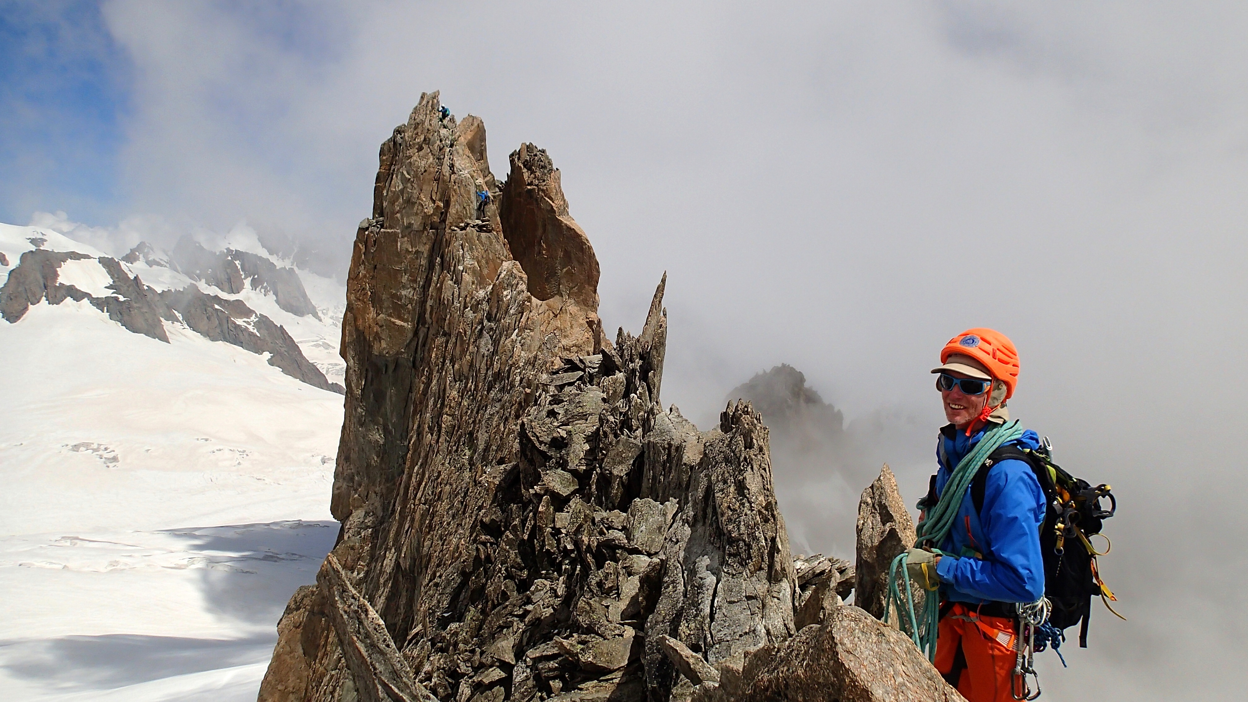 J’étais comme un gamin sous un arbre, bavant de plaisir à la pensée d’y grimper pour se retrouver au top ! J’ai suivi Gilles, à travers une progression facile. Le terrain est tout de suite aérien et s’élève lentement jusqu’à un passage ludique, soit une sorte de brèche menant à un surplomb pas bien compliqué à escalader, une fois les prises de pied repérées. La suite est un enchantement. Nous avançons sur le fil de l’arête, le vide pour seul compagnon, et toujours devant nous le déroulé des aiguilles, aériennes à souhait, d’une beauté parfaite.