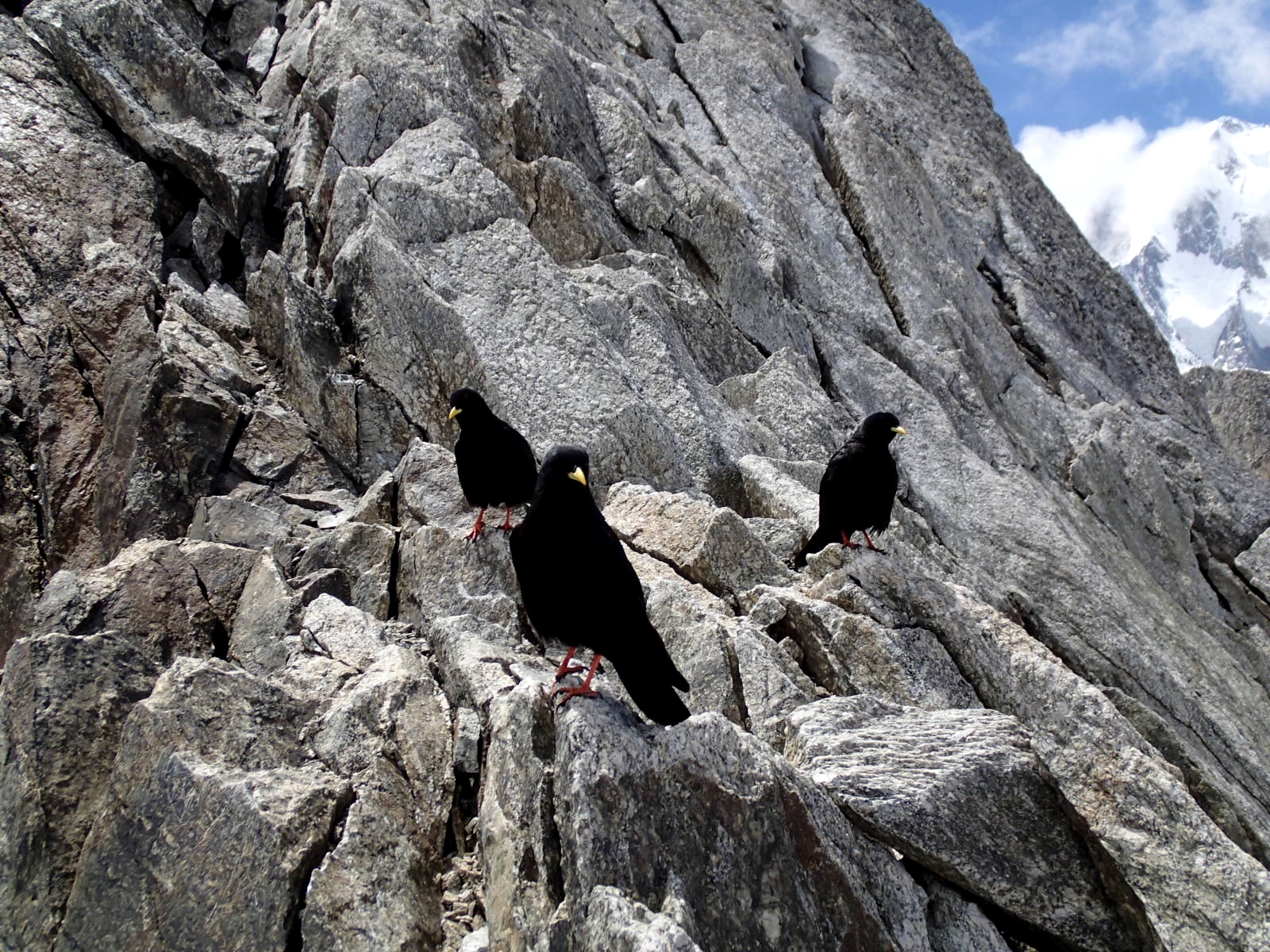 Le point clé de la chevauchée se situe un peu plus loin, un pas d’escalade précédant le sommet comportant peu de prises mais néanmoins facilement franchissable grâce à des sangles. Le point culminant est ensuite très vite atteint puis vient déjà la longue redescende, toujours sur le fil et jamais bien compliquée. Elle s’achève par un rappel et c’est ici que nous avons eu la visite de 3 chocards à bec jaune, aussitôt après nous être arrêtés un moment pour grignoter des barres. Pas farouches pour deux sous, ils étaient à moins de 1 mètre de nous. Nous leur avons lancés quelques friandises qu’ils récupéraient aisément en vol, d’un simple coup d’aile !