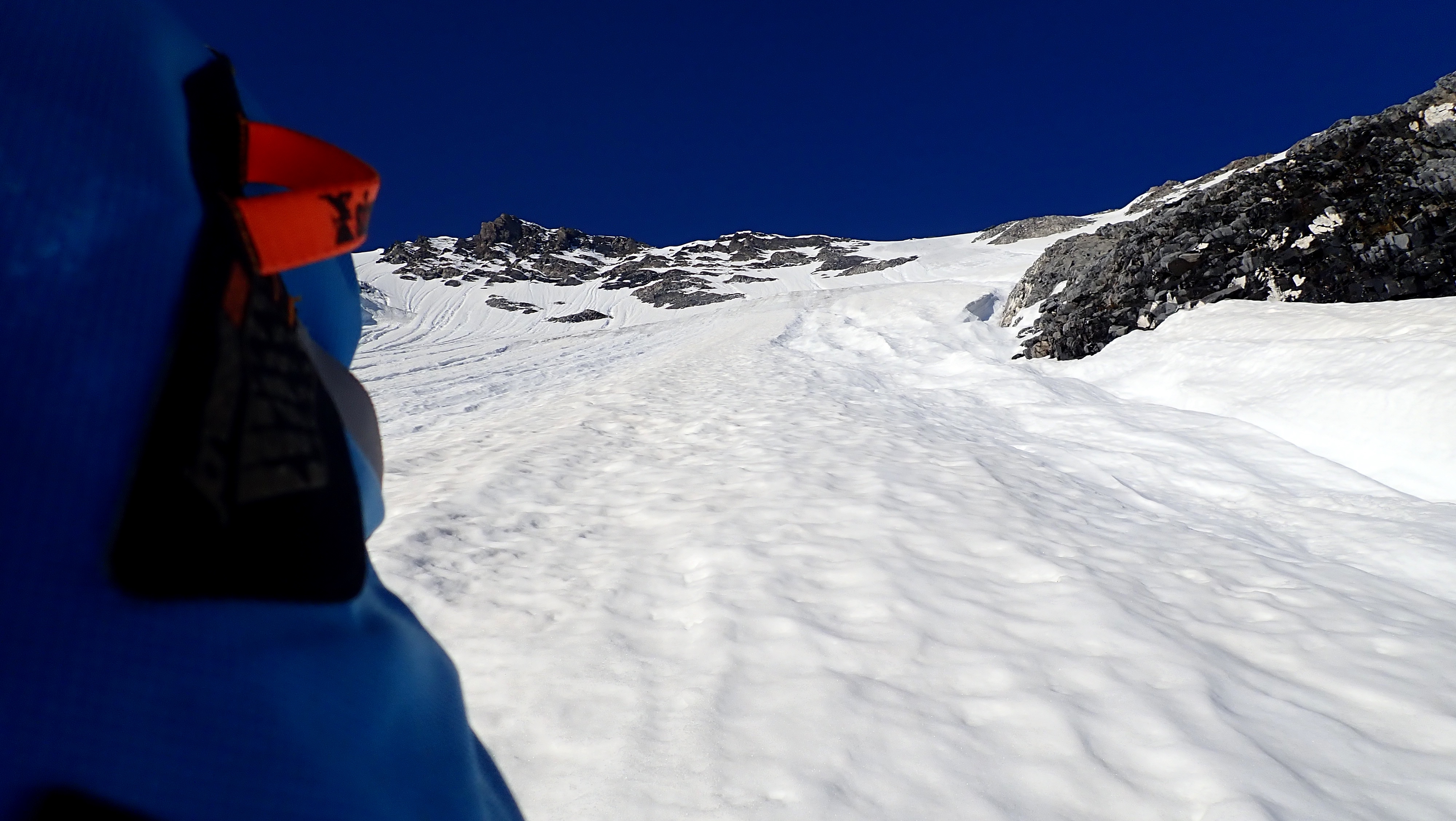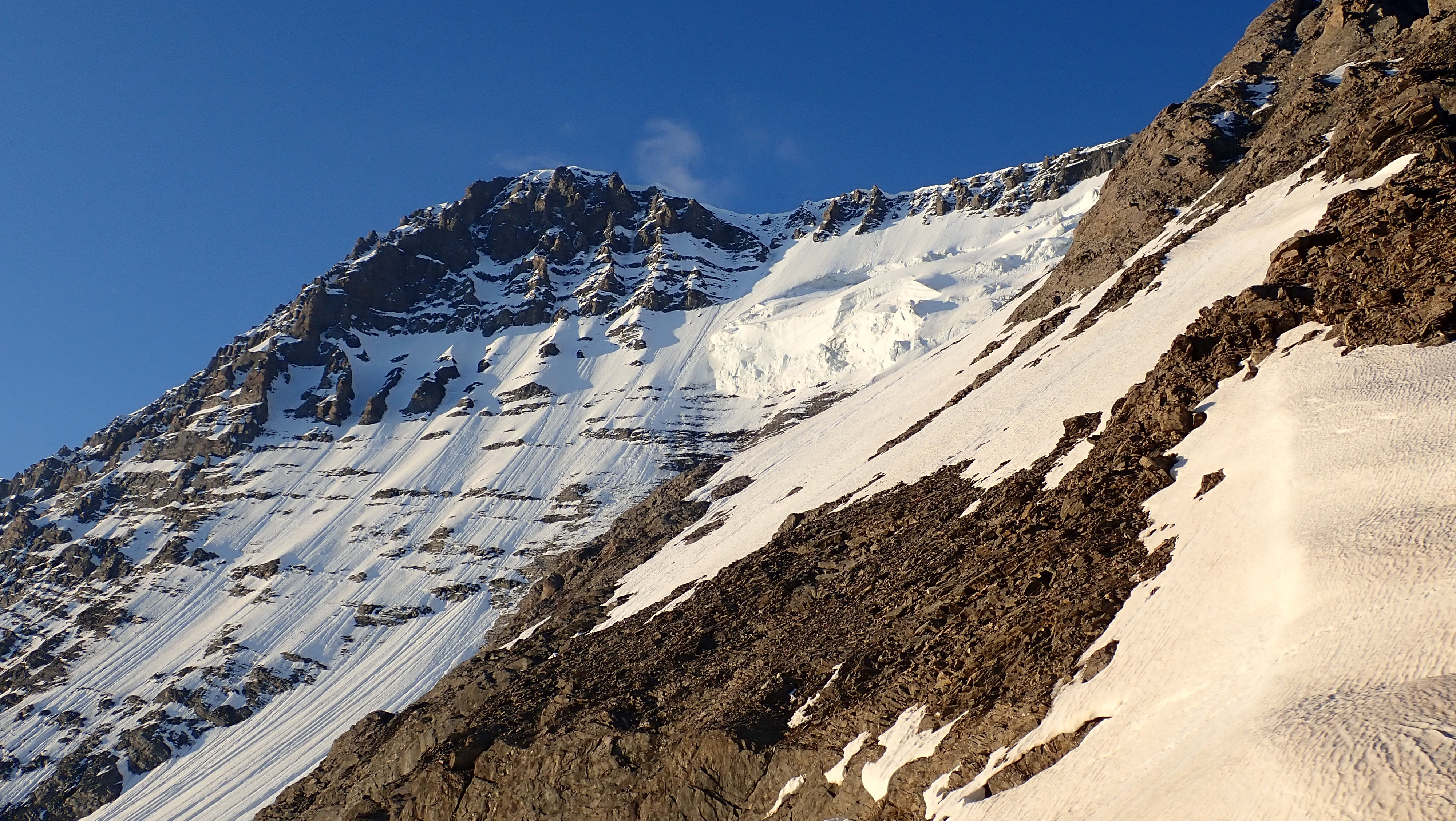 Nous voilà donc repartis en direction du col de la Grande Casse tout en bénéficiant encore de vastes étendues neigeuses sur lesquelles l’on se déplace bien plus facilement que dans les infâmes éboulis de l’été. Arrivés au col, le soleil a pointé le bout de son nez, révélant la majestueuse face Nord, son sérac central, sa crête sommitale, la blancheur encore immaculée du couloir. Nous nous sommes préparés, crampons-piolet et nous voilà à l’attaque de cette longue pente, soit un couloir de neige d’environ 600 m de dénivelé à 40°, voire 45-50° dans sa partie finale.