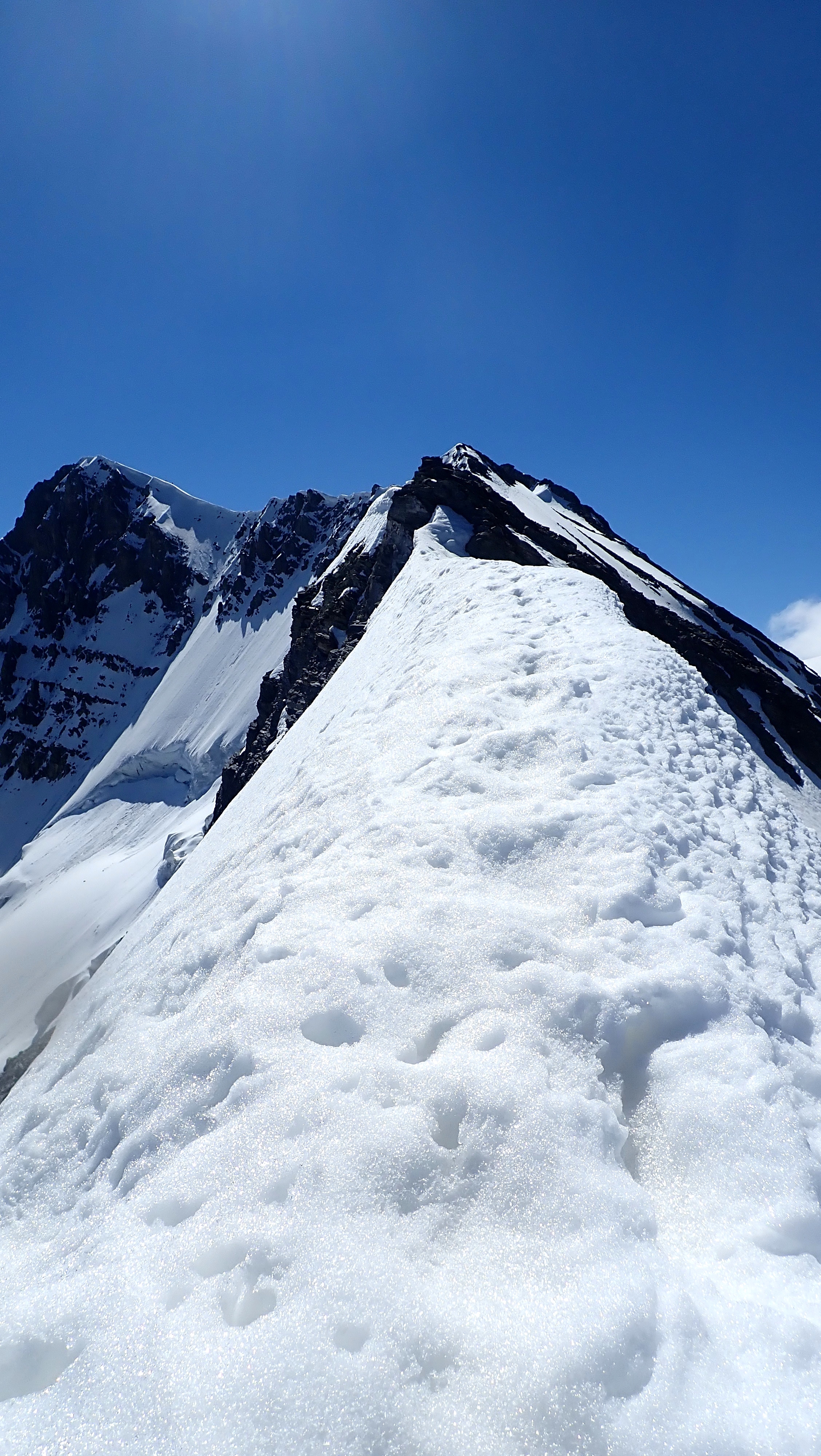 Olivier s’étant un peu fatigué à force de tailler marche sur marche, j’ai pris le relais dans la partie finale et me suis bien amusé à gravir les quelques dizaines de mètres terminaux, la neige étant à cette altitude redevenue suffisamment molle pour que l’ascension ne soit que pur plaisir.