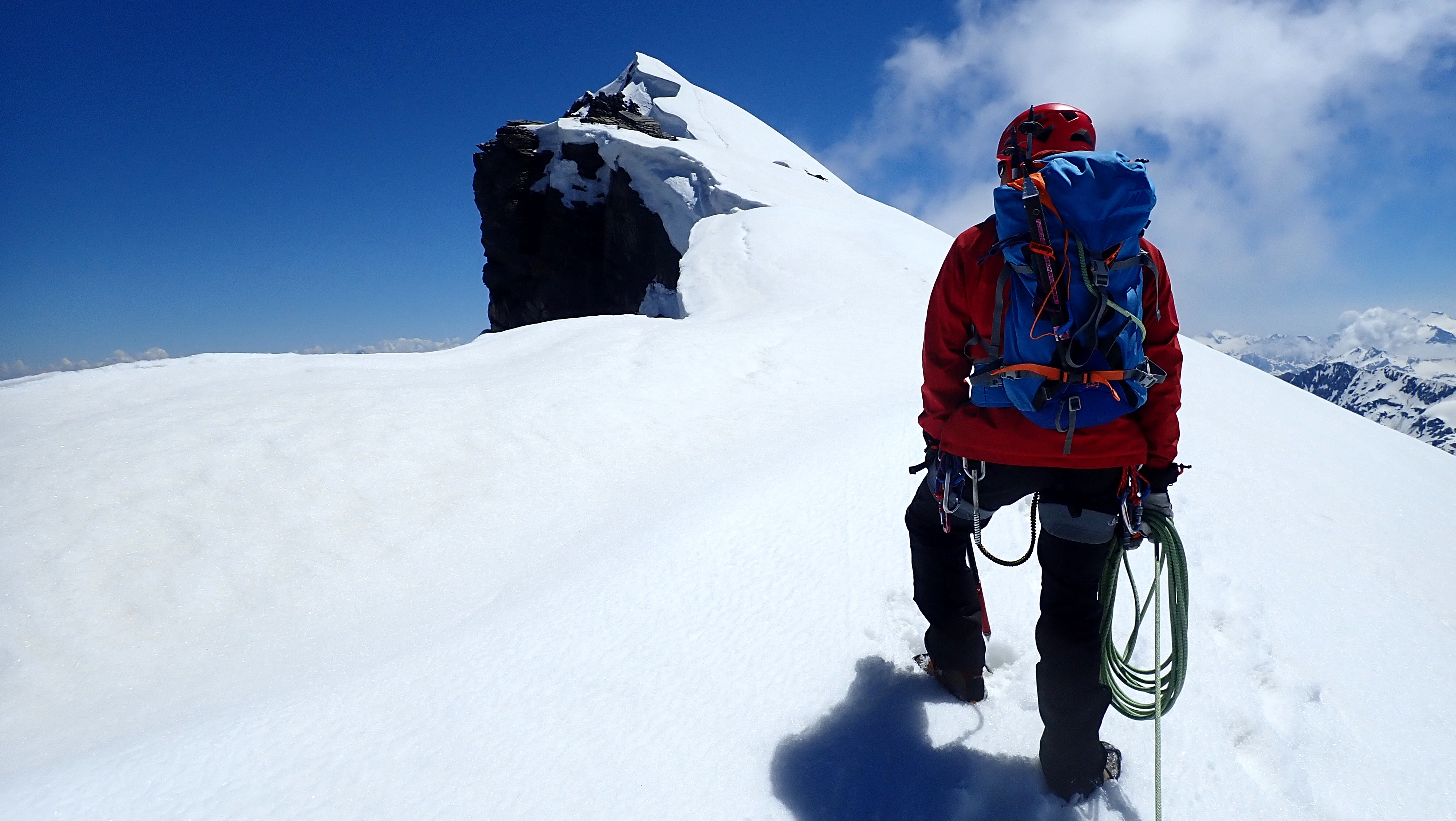 OLYMPUS DIGITAL CAMERANous avons débouché sur la fine arête neigeuse sommitale et somme restés assis là un petit moment, entre ciel et terre, le vide de part et d’autre. C’est alors que l’hélicoptère du PGHM a fait son apparition pour venir en aide au sénior infortuné (la vidéo du secours ici : https://goo.gl/L2AuTJ). Nous avons ensuite repris notre route sur le fil en direction du sommet après plusieurs passage de mixte, rocher, neige, etc. Le point culminant de la Grande Casse est un belvédère exceptionnel d’où émergent les grands de la Vanoise et d’ailleurs (Mont Pourri, Charbonel, Albaron, Mont Blanc…).