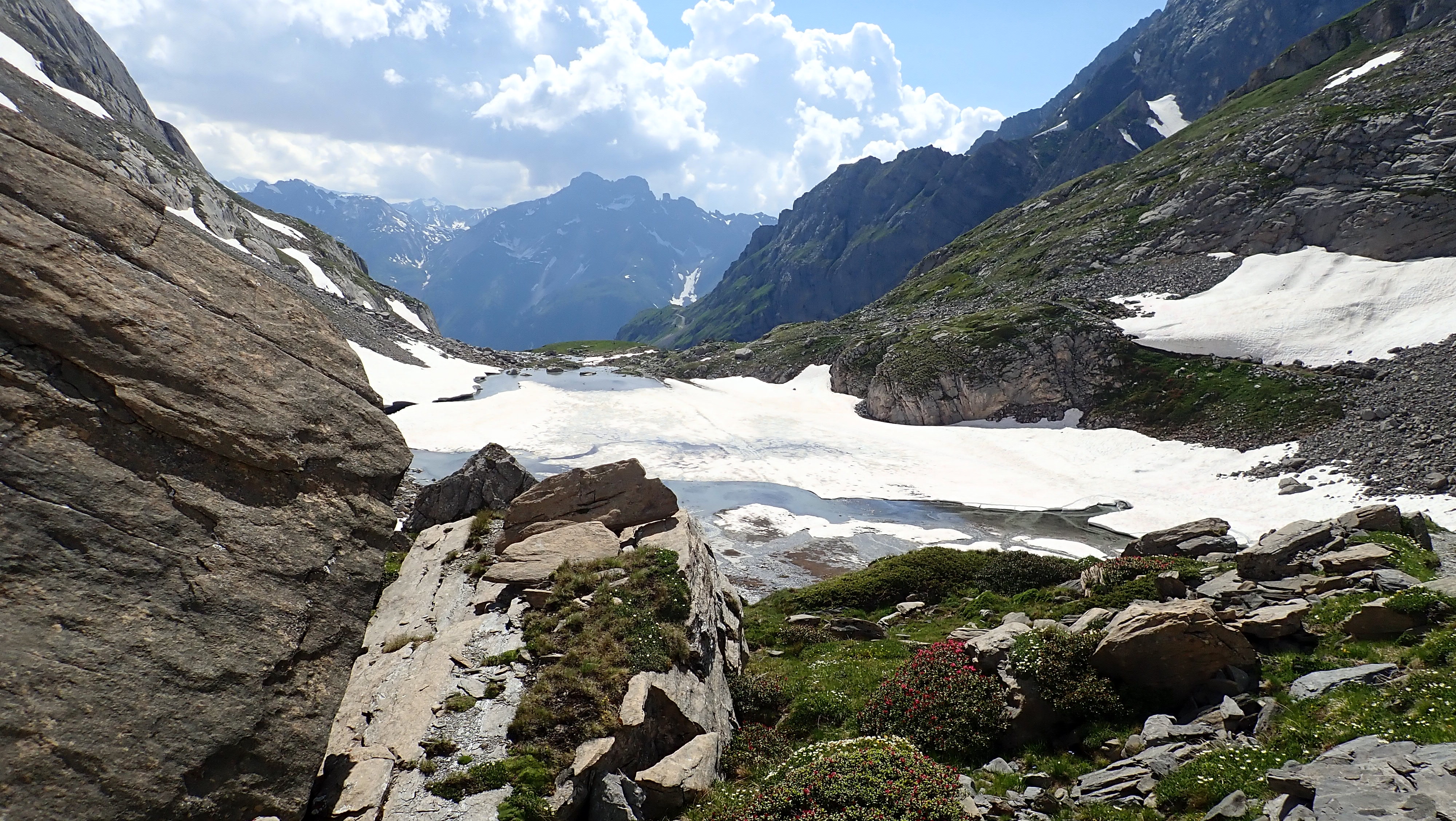 La neige ayant en partie fondue en juin sur le chemin menant au refuge du col de la Vanoise, nous eûmes moins de dénivelé à effectuer, la route des Fontanettes étant de nouveau ouverte. De plus, le 4×4 d’Olivier nous a transporté au-delà du parking officiel réduisant encore un peu plus la distance tout en polluant une bonne partie du parc ! L’approche vers le refuge est de toute beauté. La fonte n’étant pas achevée, nous avons traversé plusieurs névés et marché sur l’eau… le premier lac étant encore partiellement recouvert.
