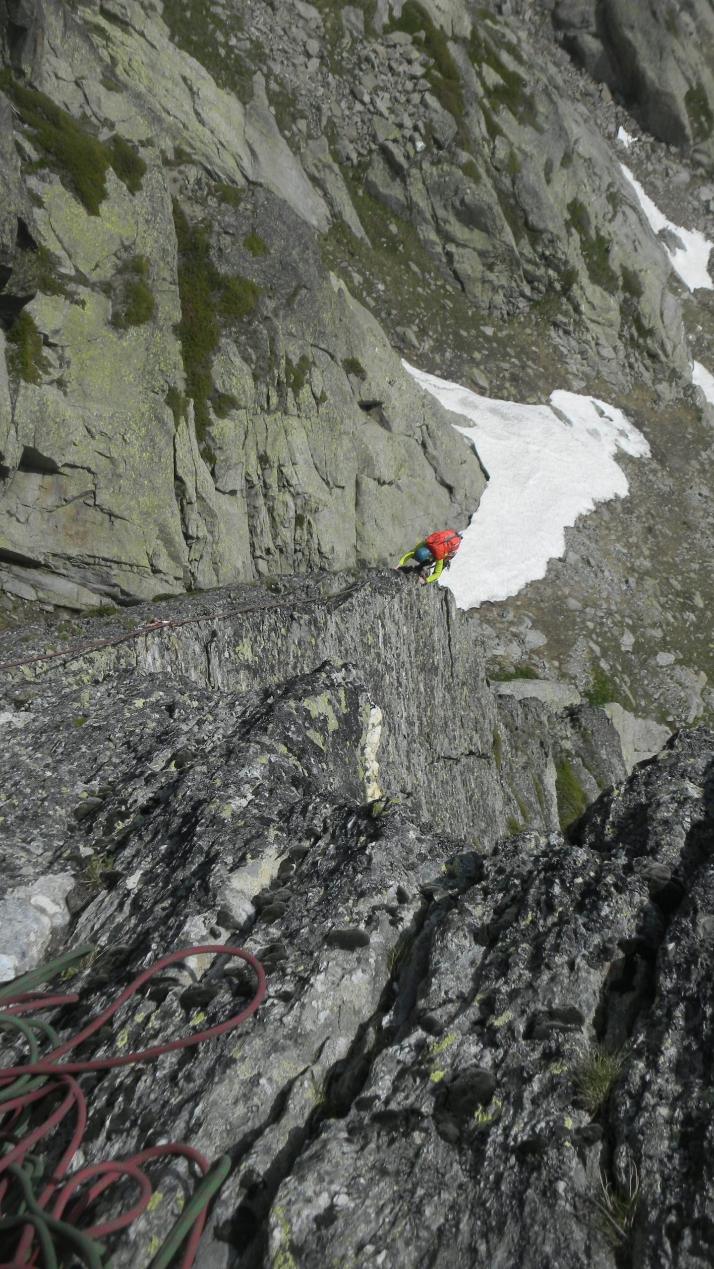 La voie Emprin en est la voie historique. Elle permet de gravir la petite Oeillasse avant de se poursuivre sur la grande après un rappel dans une brèche. Cette ascension entièrement équipée est tout bonnement magnifique avec un degré de difficulté ne dépassant pas le 5. Ses longueurs sont très variées, la seconde, plein gaz, nous imposant d’escalader le fil de l’arête avec le vide de chaque côté. Puis vient comme l’on dit le crux de la voie, un surplomb bien protégé qu’il s’agit de passer un peu physiquement ! La suite est de toute beauté jusqu’à l’accès à la dite brèche et à son rappel de 25 m environ. S’en suit une superbe longueur en dalle fine pour remonter le long de la grande Oeillasse avant de poursuivre en corde tendue jusqu’au sommet. La vue de celui-ci est plongeante sur le lac du Petit, et au loin, sur l’un des monstres de la Vanoise qu’on a gravi en traversée il y a quelques années, le Mont Pourri. La descente de ce belvédère s’effectue par un grand rappel (ou deux plus courts) qui nous fait atterrir dans un couloir d’éboulis en face nord. Olivier se lance puis le temps passe… Jusqu’à ce qu’il me crie « on a un problème !! ». Oups, quel problème ?