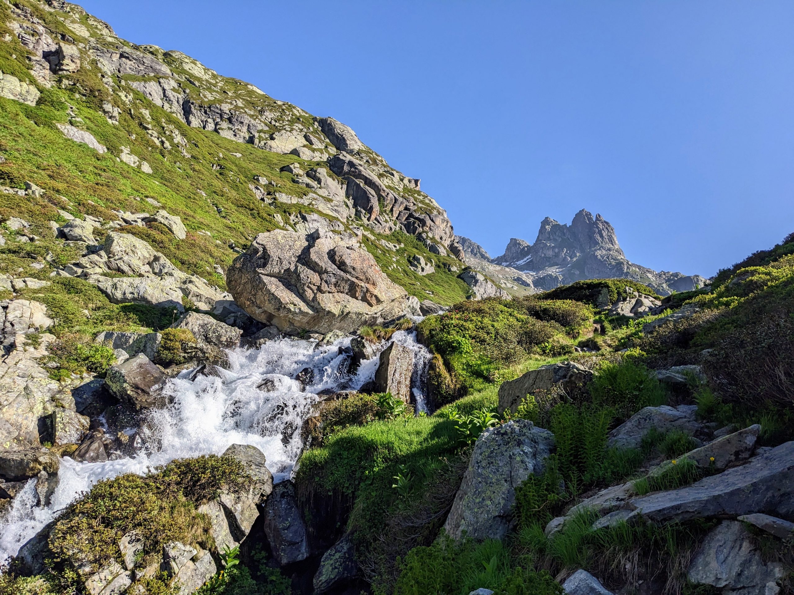 Alors que le cheminement semblait simplissime jusqu’au début de la moraine, nous avons été infoutus de traverser un cours secondaire de la rivière principale que nous longions en rive droite. Nous avons fini par faire demi-tour à la lueur de nos frontales pour nous engager sur un accès secondaire contournant la pointe de Piagnes et de l’Invernet pour déboucher au col du Grand à 3057 m d’altitude. Hélas, ce détour non prévu associé au fait que j’avais mal et peu dormi ont compliqué la progression. Je n’arrivais pas à trouver un rythme et Olivier n’était pas en grande forme non plus. De plus, le petit jour s’accompagnait de quelques nuages commençant déjà à masquer les sommets. Nous avons donc décidé de faire demi-tour vers 2600m pour nous retrouver au refuge sur les coups de 8h. Après un café apprécié, nous avons plié bagage et sommes rentrés plus tôt sur Paris. C’est ça l’alpinisme, il faut savoir douter, s’adapter, et parfois renoncer !
