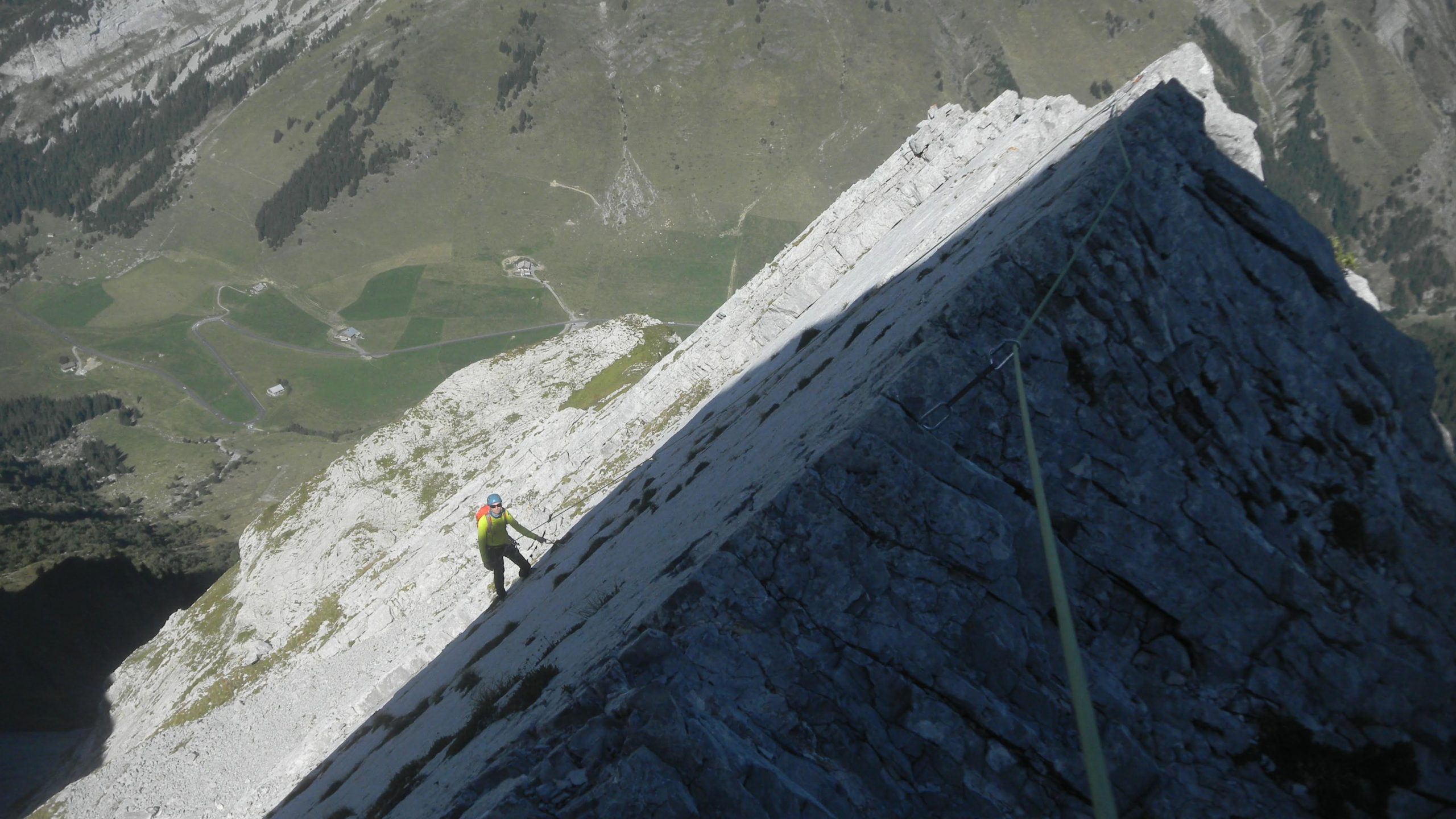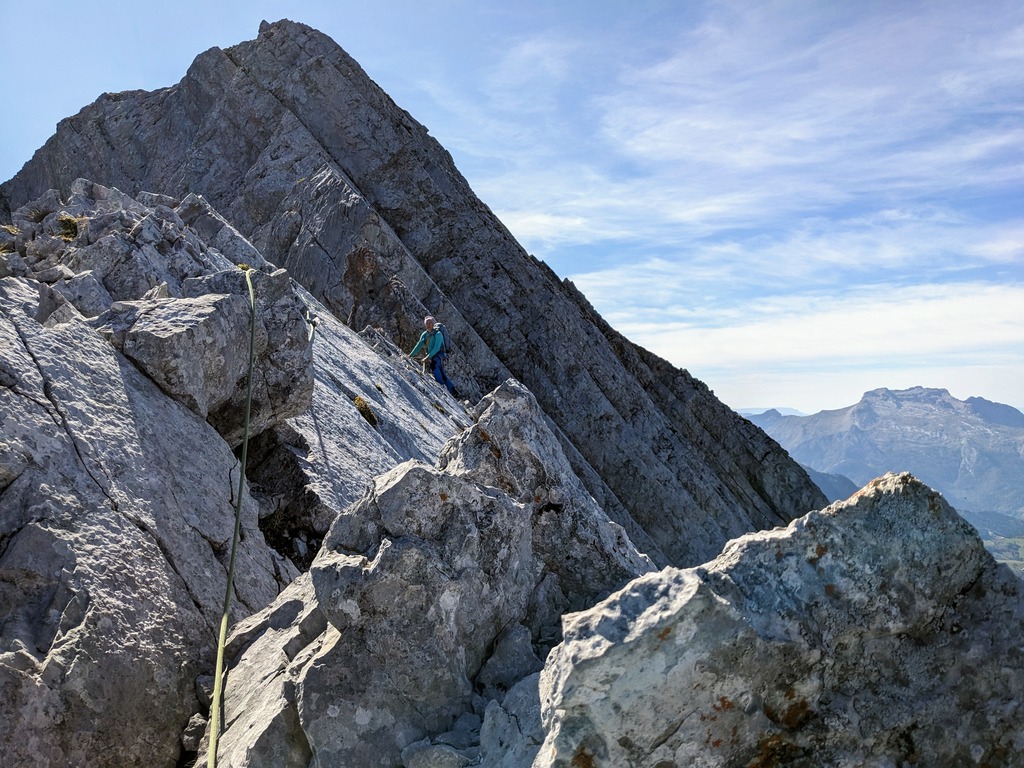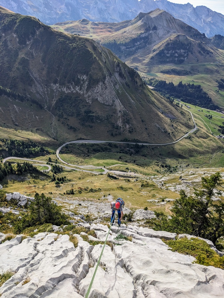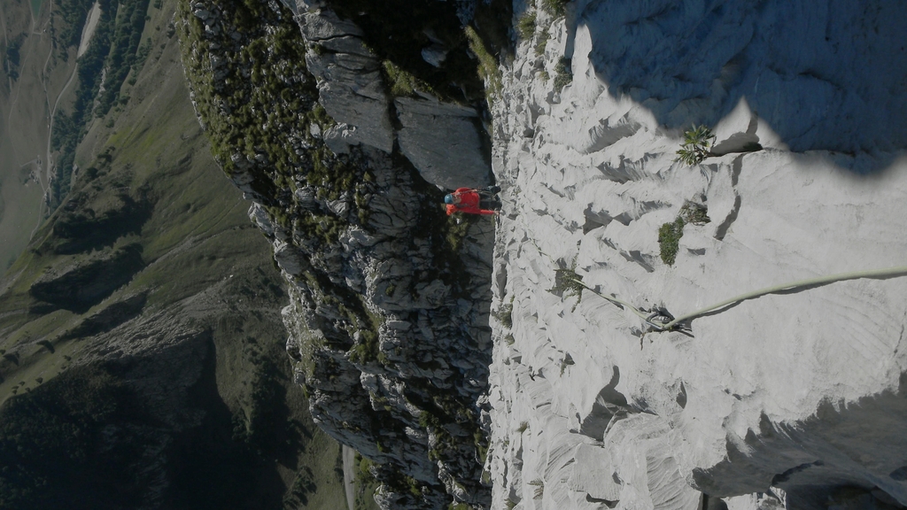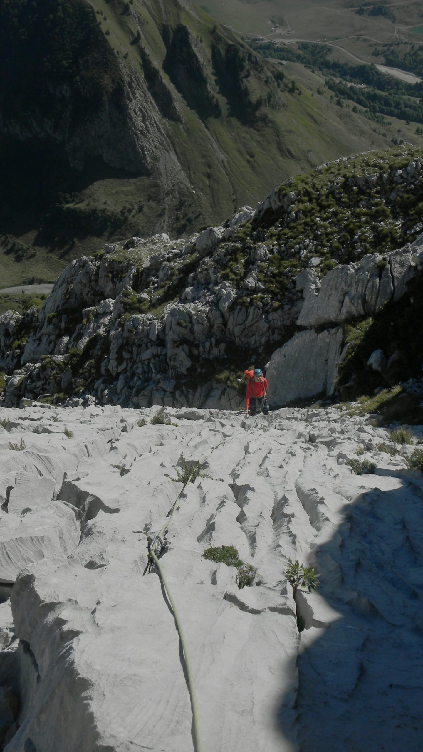 La longue bavante de plusieurs centaines de mètres de dénivelé a alors débuté jusqu’à l’attaque de la voie, une belle dalle couchée qui donnait très envie. Elle s’est poursuivie par deux autres longueurs dont la dernière est formée d’un court ressaut en cheminée. Le rocher est ici patiné, preuve que tout le monde passe par cet endroit ! Cela nous a amenés à un replat herbeux puis au pied de ladite arête. Et c’est ici que débute le voyage vers le ciel. 10 longueurs au total principalement sur le fil, que nous avons parcouru pour une bonne partie à corde tendue. Mention spéciale pour les deux dernières, composée pour la première d’une dalle exceptionnelle, puis pour la seconde d’un court passage à même le vide avant un rétablissement en direction du sommet. Restait maintenant à redescendre les quelques 900 m de dénivelé ! Ce qui a nécessité un court rappel qu’on a eu du mal à trouver, puis une désescalade où il a fallu mutuellement nous protéger pour ne pas atterrir quelques mètres en contrebas. La suite des festivités ne fut pas de tout repos non plus pour nos genoux, tant le terrain est délité et pentu, tout du moins dans sa partie haute. D’ailleurs, lorsque nous progressions sur les premières longueurs, nous pouvions entendre des cordées redescendre dans la combe en entraînant avec elles de la caillasse. On a rejoint notre nid cahin-caha pour nous refaire une santé en vue du dernier jour qui, ouf, fut constitué d’une escalade facile et ludique.