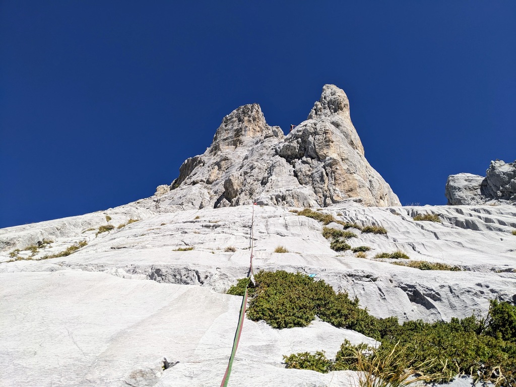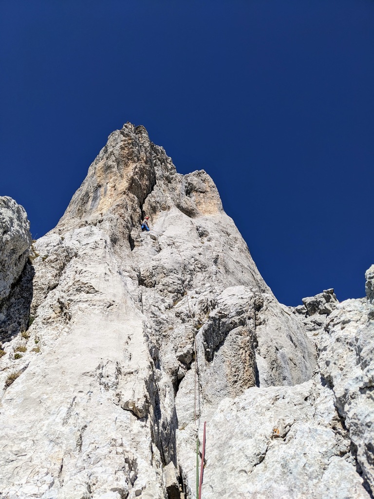 Olivier s’est lancé sans trop de difficulté jusqu’au premier relais. La longueur suivante, grimpante, a finalement déroulé sans encombre après un peu de recherche de placement de pied. Nous avons rejoint la première cordée après un cheminement facile menant à un petit collu, et en avons profité pour nous remplir la panse. Nos confrères grimpeurs ont rebroussé chemin à cause de l’horaire, et aussi du fait qu’ils n’avaient pas trouvé les spits de la longueur suivante. Après avoir lesté nos estomacs, nous sommes repartis en direction de la suite des festivités.