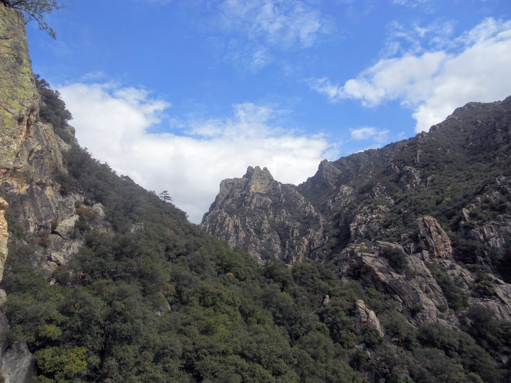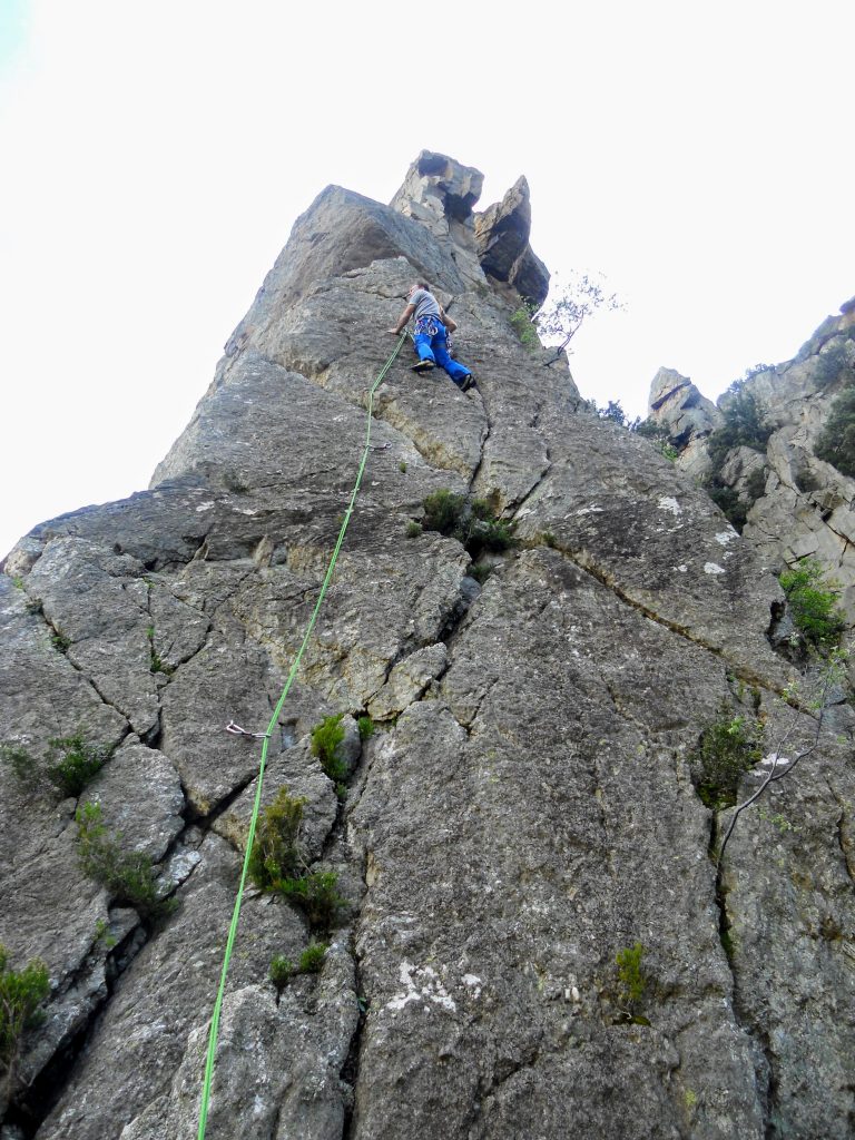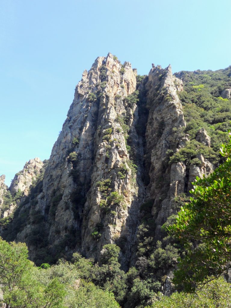La dernière journée fut consacrée à gravir le Pilier du Bosc (https://bit.ly/3bo7ZCz) par son arête Sud. Excepté qu’on a bien failli ne jamais y arriver ! L’accès n’est pas marqué si bien que nous nous sommes trompés de gorge après nous être garés à Colombières-sur-Orb. Il a fallu se frayer un chemin dans la végétation touffue pour parvenir finalement à récupérer le tracé marqué ça et là de petits triangles orange agrafés aux arbres. Le pilier se laisse désirer et ne s’entrevoit qu’une fois bien engagé sur les hauteurs du ruisseau de Madale. Il s’impose dès le premier regard, les contreforts de l’arête Sud étant bien visibles et annonciateurs d’une superbe ascension. Nous sommes finalement parvenus à l’attaque de la voie après avoir traversé le ruisseau qui est plus exactement une rivière, au beau milieu d’une nature sauvage.