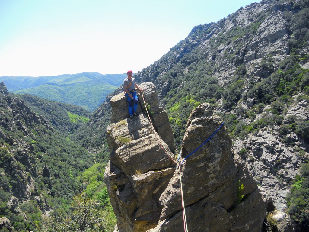 Bref, de l’escalade plaisir dans un terrain d’aventure au beau milieu d’un cadre grandiose. Nous sommes redescendus sans trop de difficulté par un ravin qui mène au départ de l’arête sud de l’Aiguille à Marcel (https://bit.ly/3p89Cty) que nous envisagerons la prochaine fois. Car nous reviendrons, les richesses du Caroux méritant plusieurs visites !