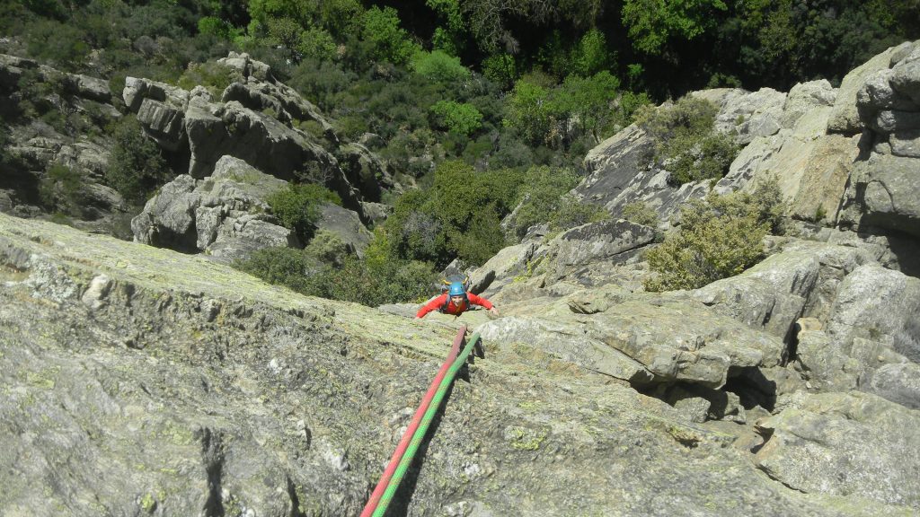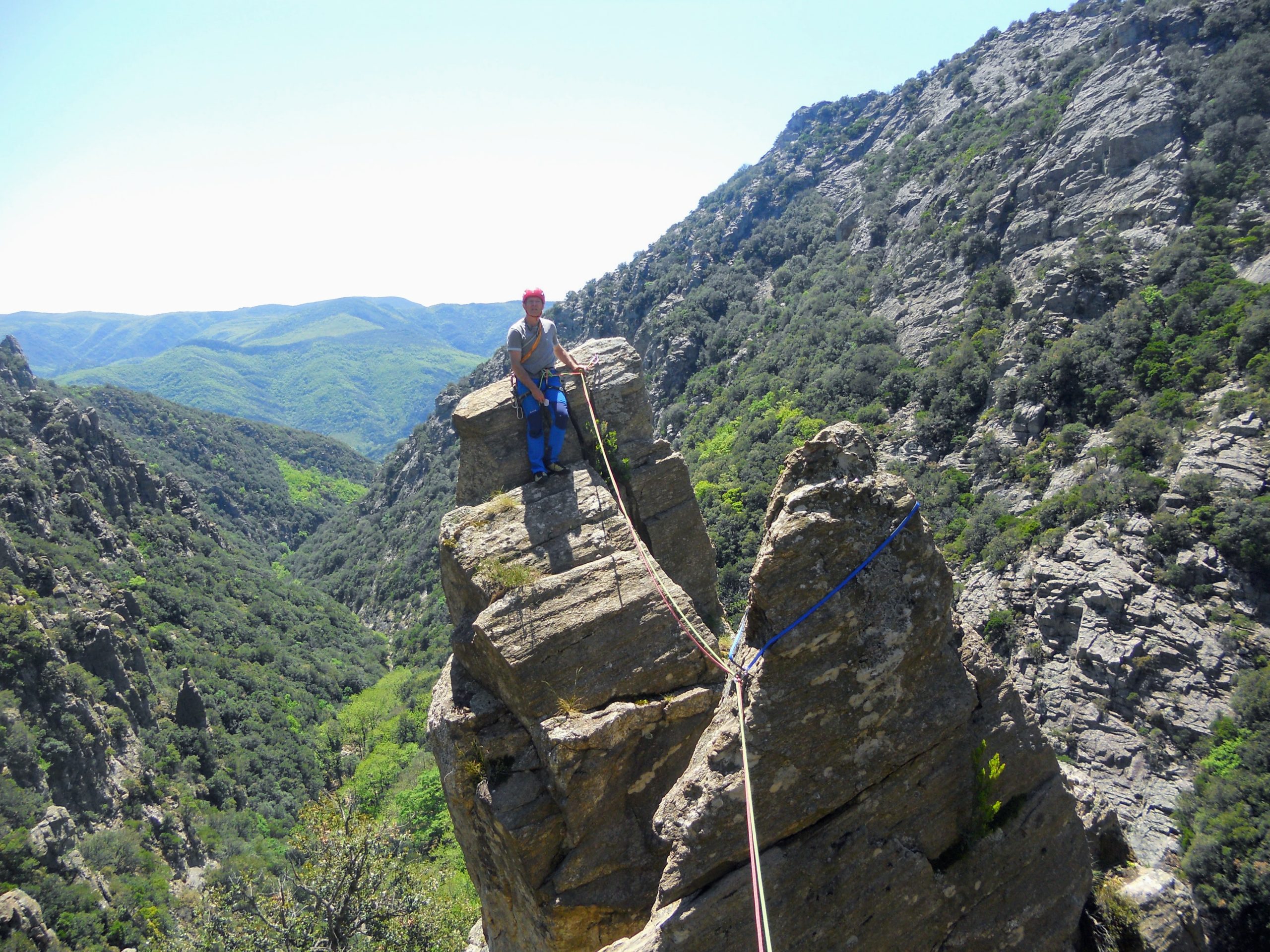 La suite est très belle qui utilise les faiblesses de la paroi pour progresser dans un niveau de difficulté acceptable pour nous. Jusqu’à la base du grand gendarme légèrement déversant et qui nécessite un pas athlétique avant de se poursuivre jusqu’à son sommet où mieux vaut ne pas avoir le vertige ! En effet, la jonction avec la suite de l’aventure exige de se hisser sur un bloc avant de se sécuriser avec une sangle. Puis en redescendre avec précaution, le vide étant partout, avant de se rétablir sur la paroi non sans avoir enjambé ce même vide. Autant dire qu’il s’agissait d’être concentré jusqu’au relais suivant ! Les deux dernières longueurs sont exceptionnelles qui passent par une fissure et une cheminée puis continuent directement dans la face avant de déboucher au sommet.