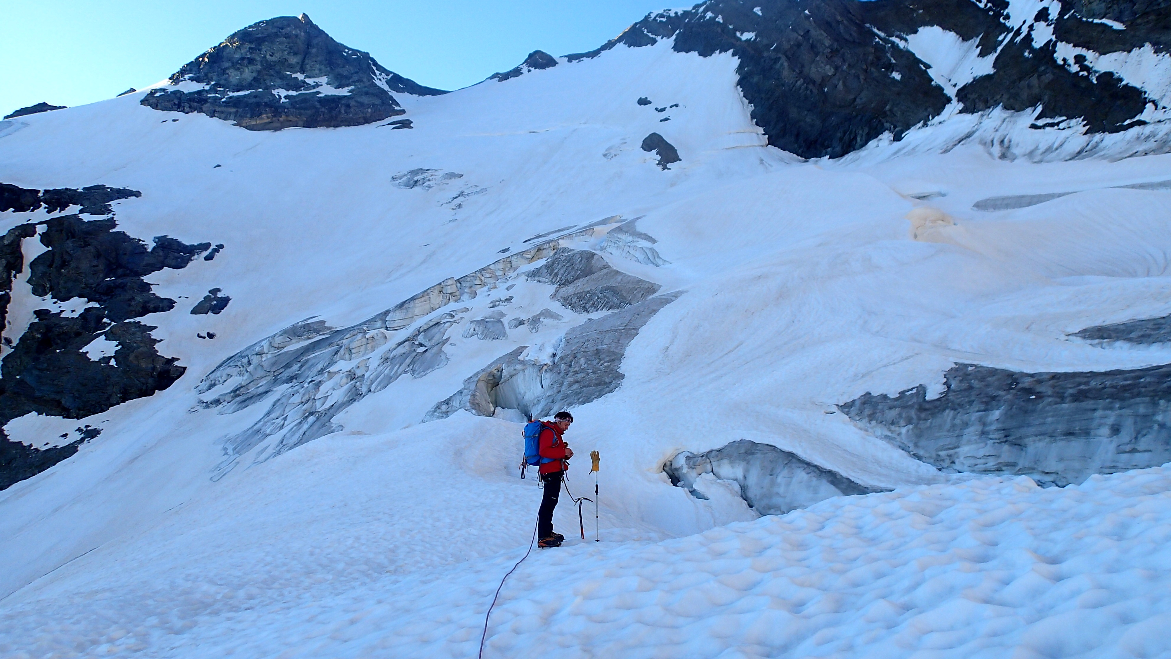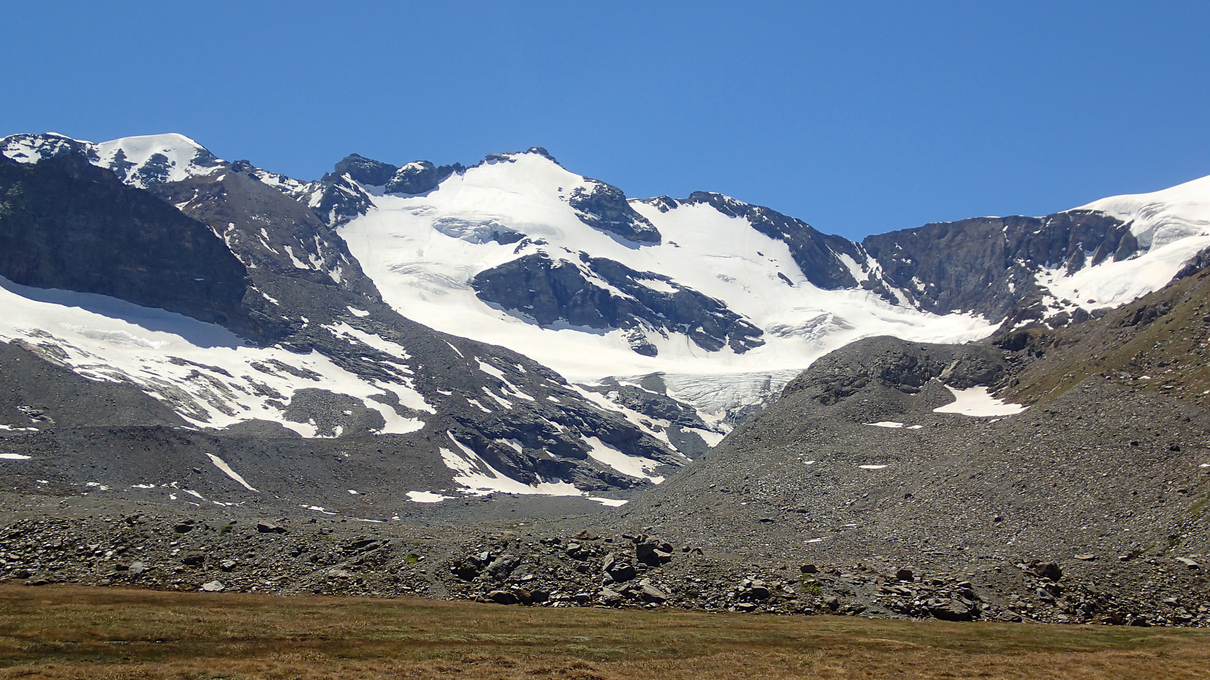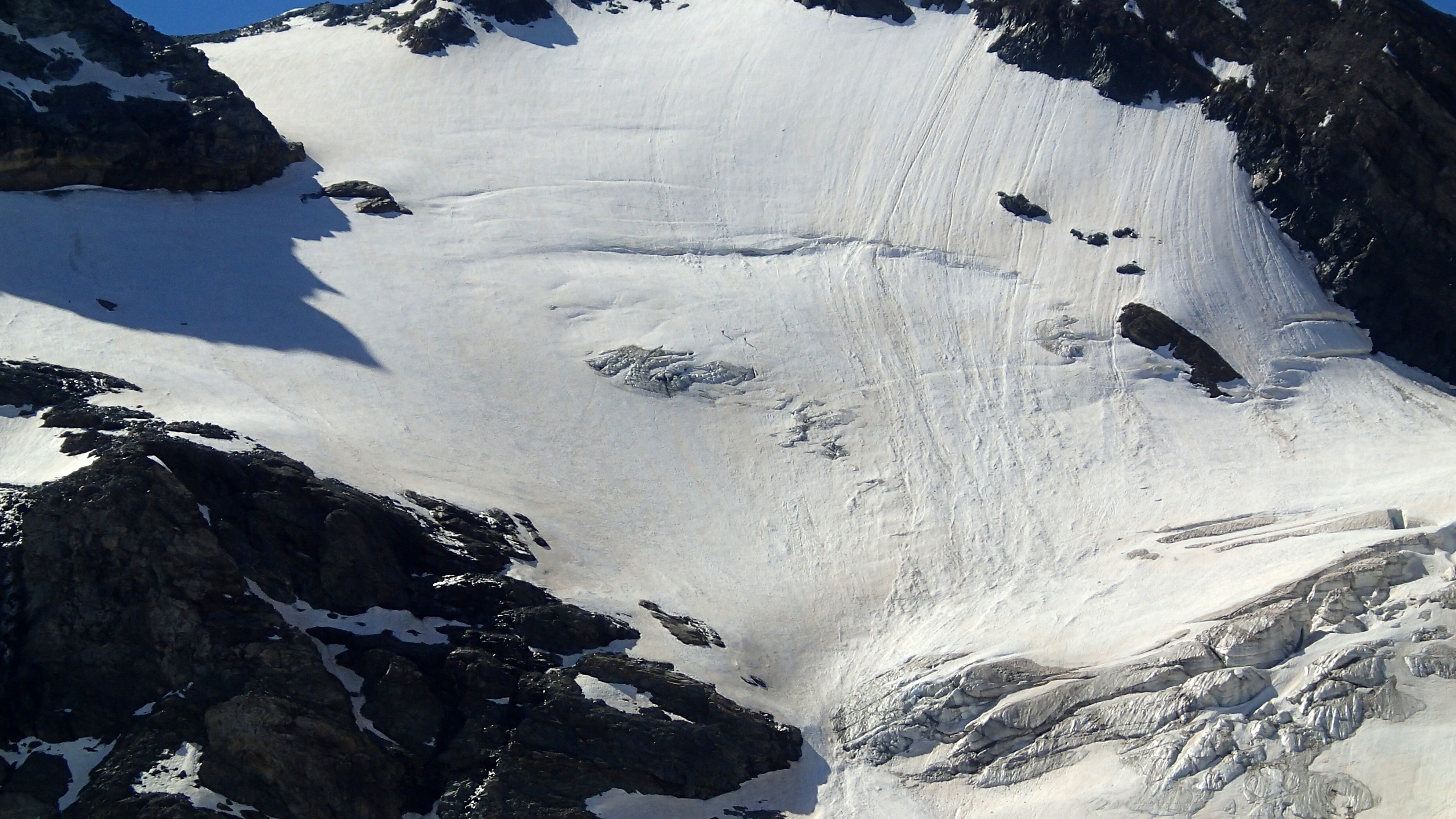 OLYMPUS DIGITAL CAMERANous empruntons un chemin surplombant le cirque et qui a le mérite d’éviter l’énorme tourbière où nous aurions peut-être fini les pieds dans l’eau. Nous rattrapons finalement les filles au bas des langues neigeuses et tout ce petit monde enfile les crampons. Vu le regel effectivement excellent, elles ont finalement pris le parti de gravir la Petite Ciamarella par la voie de gauche (http://goo.gl/FsqxDS), plus ardue et se terminant par une progression sur arêtes. Notre ascension commune débute par un raidillon permettant d’accéder à la base du glacier qui a énormément reculé ces dernières années. Elles partent ensuite à gauche et nous à droite. Du bas du glacier, on s’aperçoit que la montée sera facile, les séracs peu menaçants et les crevasses bien visibles.