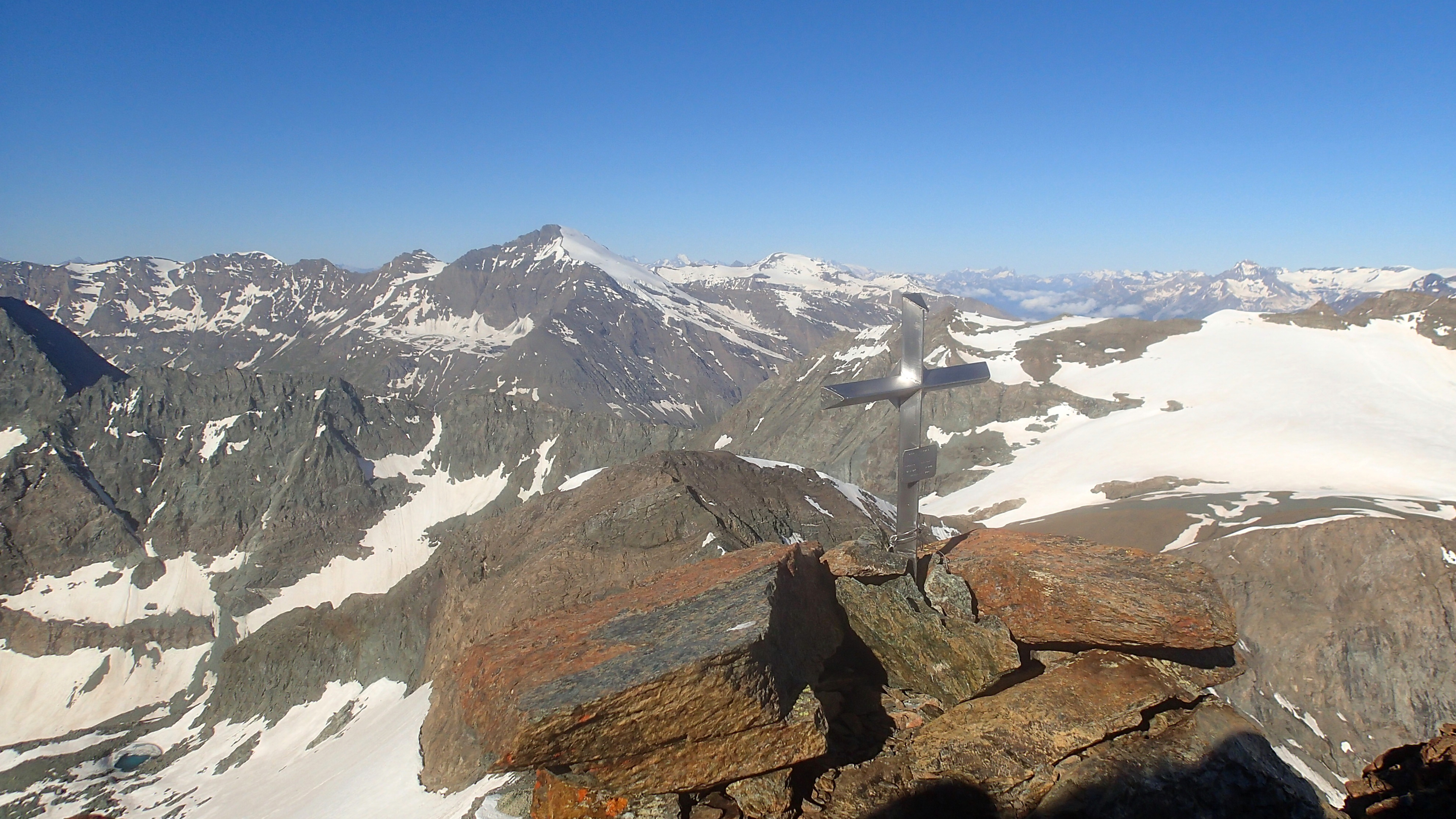 OLYMPUS DIGITAL CAMERAOn le savait du reste : le sommet de la Petite Ciamarella est un belvédère majestueux à 360°, Mont Blanc compris bien sûr. Certes, nous n’y sommes pas encore mais arrivons facilement au col avant d’entamer l’ultime grimpette sur du mauvais rocher crampons aux pieds. Un pas nous attend : il faut se positionner à califourchon sur un bloc, le vide à nos pieds, avant d’atteindre le faîte. Olivier s’y engage et m’assure du haut. Ce sera l’inverse au retour.