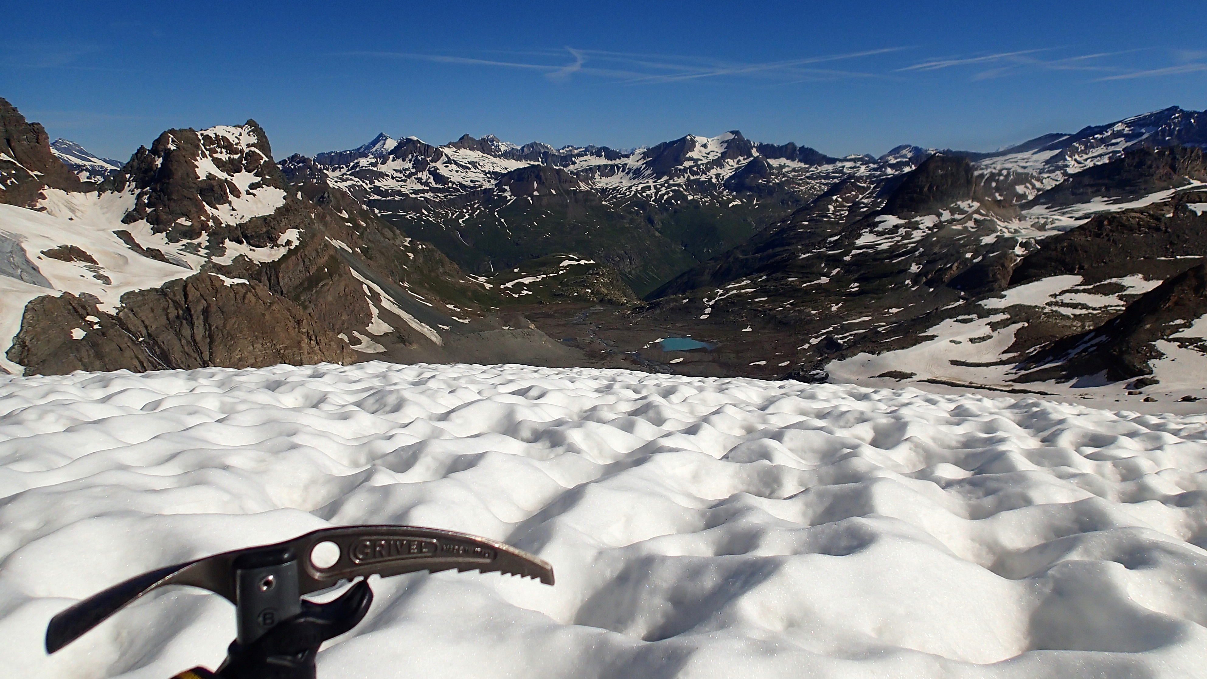 OLYMPUS DIGITAL CAMERANous nous attendions à rencontrer les Catalanes mais nulle trace d’elles. La ligne d’arêtes est désespérément vide, aucun habit fluo ni aucune voix ne trahit leur présence. Ont-elles abandonnées ? Toujours est-il que nous restons là un bon moment à profiter de la vue et à se restaurer avant de rebrousser chemin. Ce n’est qu’une fois de retour au col que nous les apercevrons au sommet.Nous sommes déjà loin et retrouvons la base du glacier après une descente attentive, car pas question de glisser dans ces pentes.