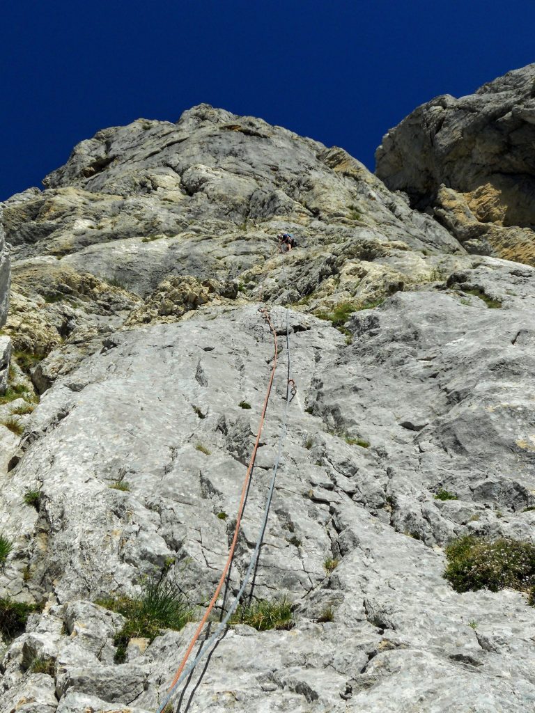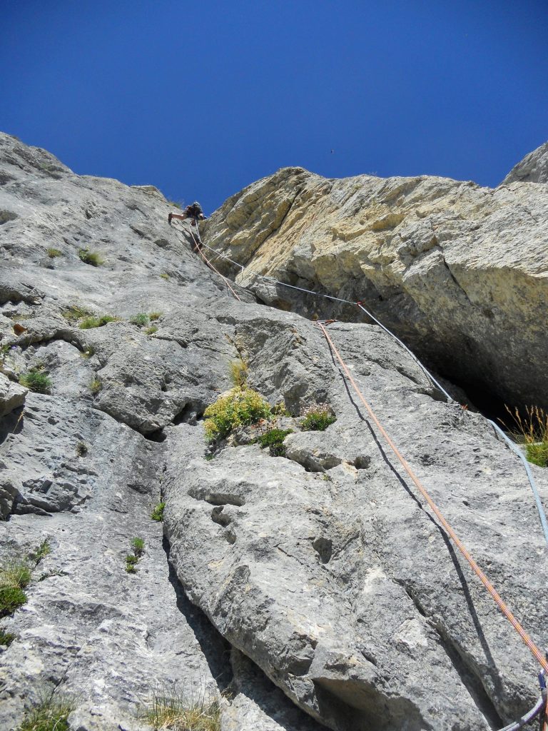 En observant ce large dièdre quasi-vertical se transformant en cheminée sur sa partie haute, je n’ai pas su trop quoi penser. Pierre s’est lancé en usant de techniques d’escalade en opposition puis en dulfer plus haut. En le regardant consciencieusement évoluer, je me suis dit que somme toute, cela devait passer sans trop de problème. Sauf que je ne suis pas guide ni n’ai son niveau d’escalade ! Je suis parti à mon tour en tentant de répéter les mêmes gestes. Les 2 premiers tiers du dièdre sont passés sans trop de souci. Mais arrivé à la partie terminale, je me suis aperçu que le rocher de gauche était pas mal patiné. Heureusement qu’une sangle coincée dans une faille m’a permis de me hisser, de même que les dégaines posées par Pierre. J’ai fini par m’en sortir tant bien que mal, le cœur battant la chamade. Les deux dernières longueurs (dont une de nouveau dans un très beau dièdre) permettent d’en terminer avec la partie verticale. Nous avons débouché dans des pentes herbeuses qui peuvent s’avérer glissantes et dangereuses lorsque mouillées. C’est d’ailleurs non loin de là que se sont tués Lionel Terray et Marc Martinetti le 18 septembre 1965, certainement après avoir glissé sans pouvoir se retenir.