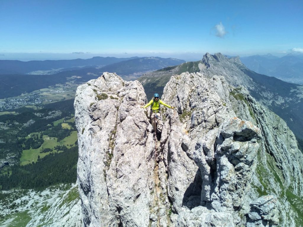 Comme nous avancions vite, nous avons continué pour effectuer la traversée intégrale qui comprend quelques passages olé-olé comme le Rasoir ou le Peigne (côté 3c). Il s’agit d’attraper les réglettes sommitales avant d’effectuer une avancée horizontale face à la paroi. L’arête est dans ces passages tellement fine qu’il est impossible de s’y tenir à califourchon ! Le cheminement se complique légèrement par la suite. Il comprend notamment un rappel facultatif et une descente sur des pentes rocheuses avant de pouvoir prendre pied sur les alpages de haute altitude. Il ne reste plus alors que se rendre au pas de l’Oeille, sorte de brisure de la paroi qui autorise le passage du GR en direction de Prélenfrey. Nouvelle sortie esthétique et un bel enchainement à conseiller sans modération. Merci Pierre !