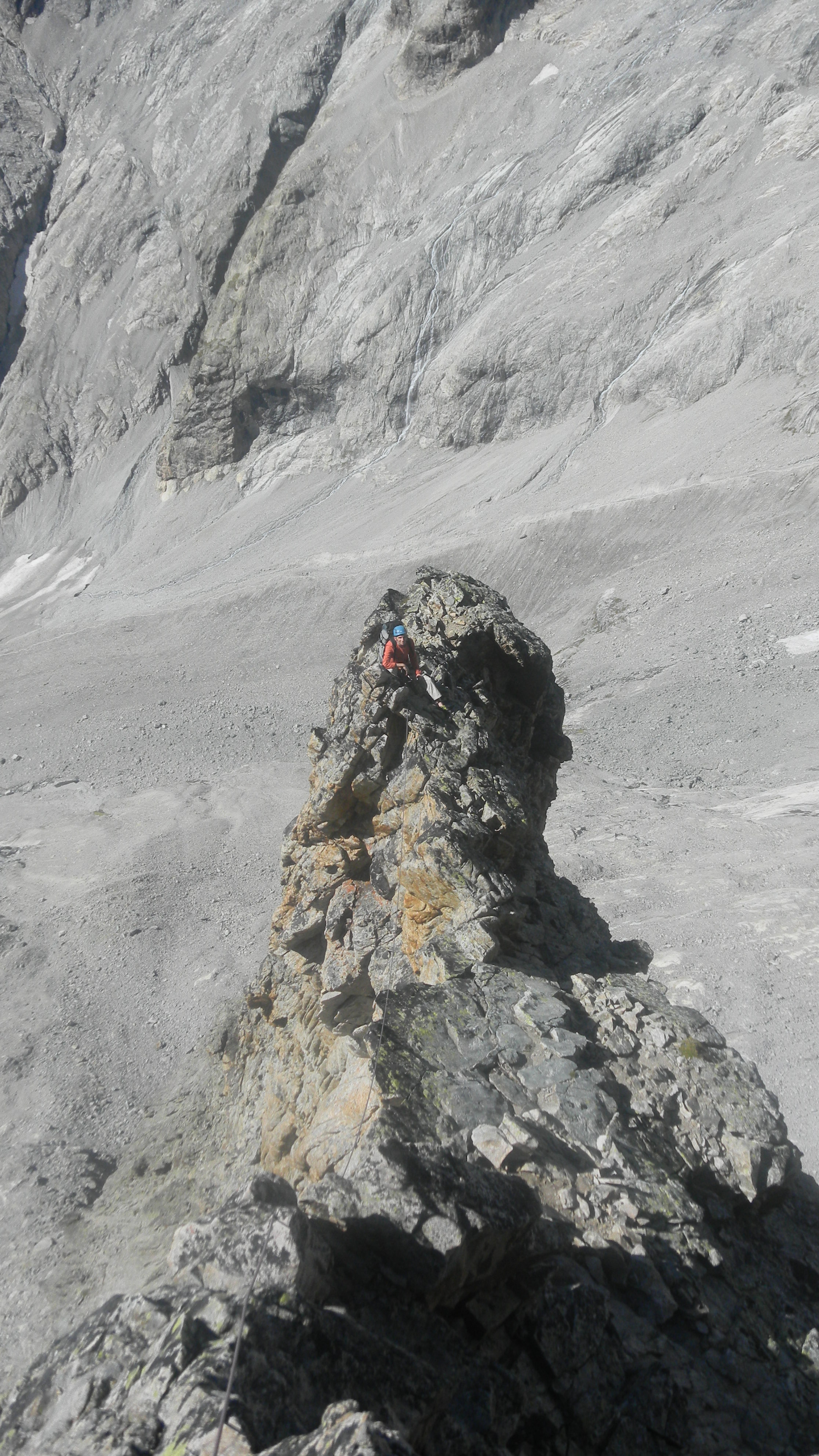 Nous, l’horaire, nous le tenons ! Départ de bon matin en direction de l’attaque de la Pointe des Aigles, après avoir remonté et traversé la vallée avant d’atteindre l’approche de la voie. Il fait beau, le rocher est une pure merveille, l’ascension pas vraiment difficile, bref, tout se passe pour le mieux. Sauf qu’au troisième ressaut (En montagne, on appelle ressaut le passage brusque d’un plan horizontal à un autre, et par extension, une zone escarpée (voire verticale ou surplombante) séparant deux zones d’inclinaison nettement plus faible«  (Gautrat 1970). Des montagnes trapues (…) sans ressauts, comme d’un seul jet (Vidal de La Bl.,Tabl. géogr. Fr., 1908, p. 188), Olivier hésite. Le cheminement n’est plus vraiment marqué. Tandis qu’il recherche l’itinéraire en examinant plusieurs topos, je l’assure à plusieurs mètres de distance, confortablement installé sur la crête. Pourtant, je ne suis que moyennement rassuré : en tournant la tête à droite et à gauche, j’aperçois le vertigineux vide qui s’étend sur quelques centaines de mètres. Impossible de faire marche arrière, il faut passer ! Ce que finit par faire Olivier en s’élevant quelque peu puis en disparaissant subitement de ma vue. Après quelques minutes, à moi de m’élancer, tandis qu’il me guide à la voix.