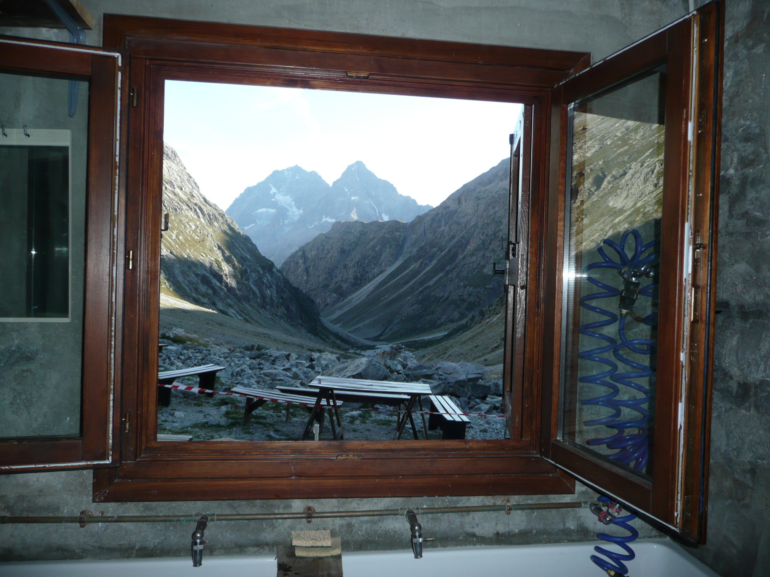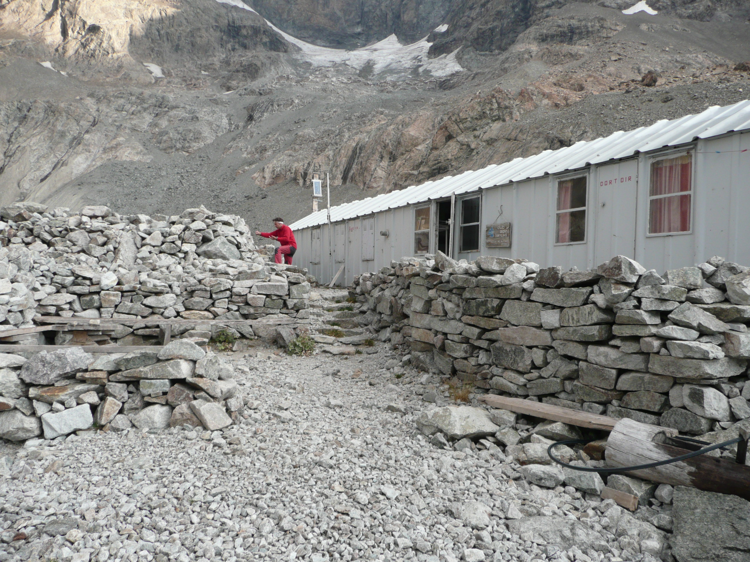 La descente ne nous pose pas de véritable souci et nous arrivons au refuge du lac du Pavé alors que le soleil se couche. Le refuge est vide à cette époque de l’année. Pourtant, on découvre en y entrant, de quoi tenir un siège : œufs, fromage, tomates, vieux pain ainsi qu’une gazinière en état de marche et, comble du luxe, du vin blanc en carton ! Autant dire que nous avons avons superbement gueuletonné en duo à 2700 mètres d’altitude à la lumière de la bougie, un moment que je ne suis pas près d’oublier !
