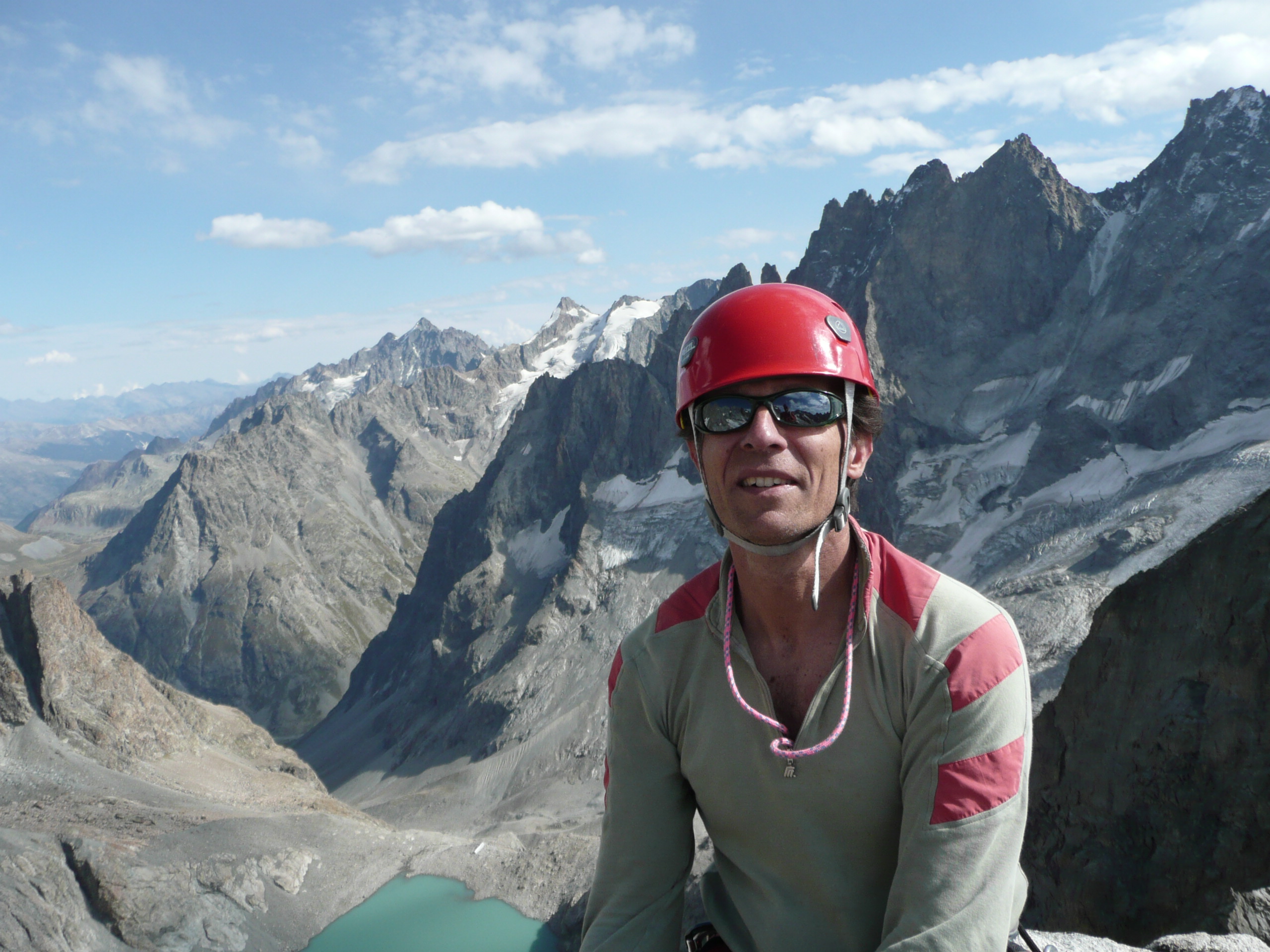 Je n’en même pas large. Il s’agit d’effectuer une traversée en courbe et donc s’engager dans un passage sans apercevoir ce qui se cache derrière. Olivier me crie qu’il y a une belle prise pas loin. Je me lance d’autant que les prises de pied sont bonnes. Résultat, un beau moment de trouille et d’extase en même temps ! Olivier me réceptionne sur une petite vire (Replat étroit le long d’un escarpement montagneux. Du sommet de la gorge où nous étions maintenant arrivés, une étroite vire contourne le rocher à pic et permet de descendre dans la gorge vertigineuse, à deux cents mètres au-dessus du torrent (Abellio, Pacifiques, 1946, p. 329). La suite est sans réelles difficultés et nous finissons par arriver sur l’étroit sommet duquel une vue à 360° nous laisse admirer la Meije, le refuge du Chatelleret et désormais celui du lac du Pavé, puisque nous redescendons sur le versant opposé de la Pointe des Aigles. En dessous de nous, à peu près 900 mètres de vide.