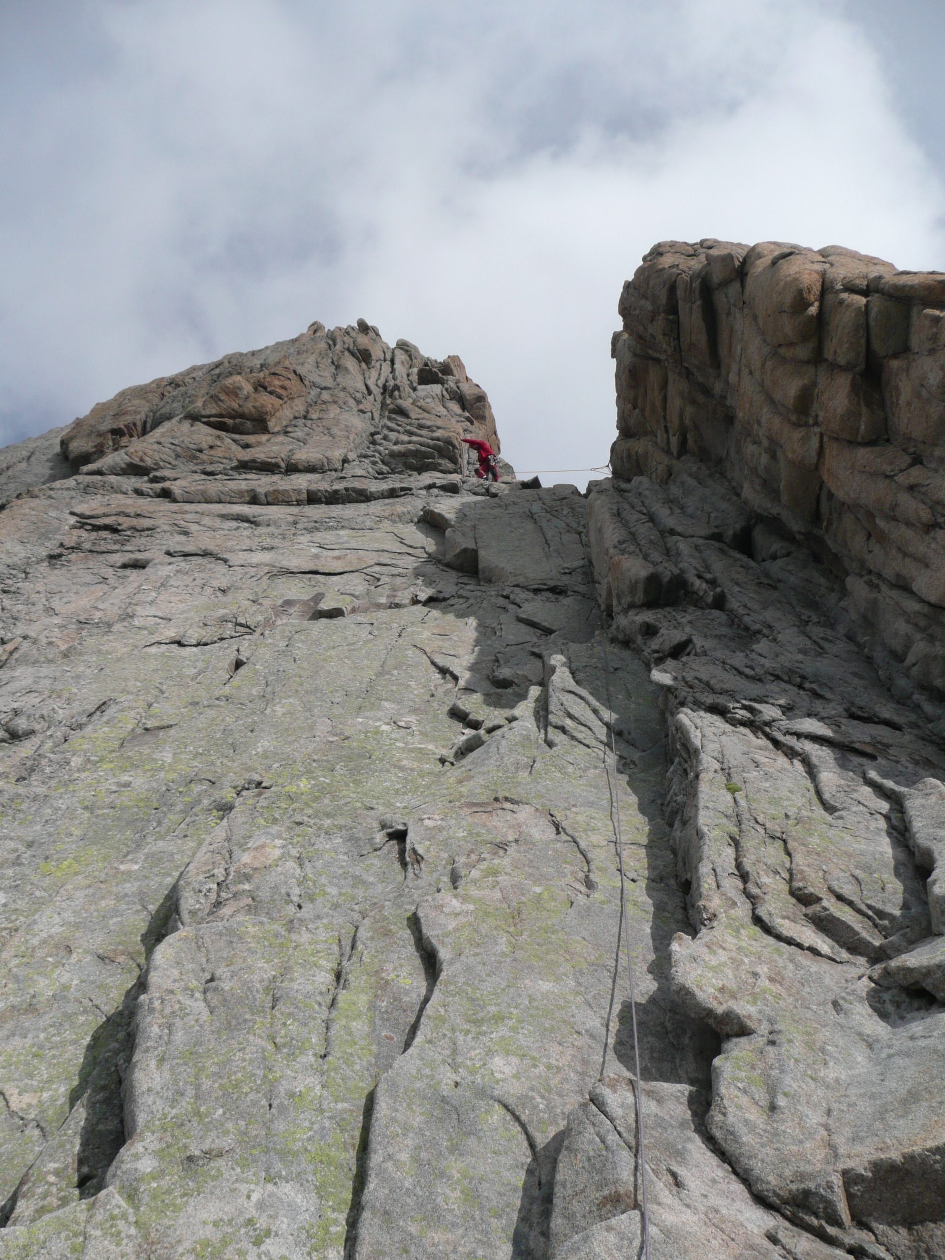 Au petit matin, retour à la varappe. Le temps s’est couvert durant la nuit. Olivier me dit, avant d’avoir mis le nez dehors, que le paysage est peut-être tout blanc ! Il faut dire que nous sommes à la mi-septembre. Fort heureusement il a tort, si bien que nous attaquons en sens inverse le même chemin que la veille, en direction cette fois-ci de l’arête Sud du Pic Nord des Cavales puisque le temps le permet, une ascension plus courte et plus facile que l’arête Ouest de la Pointe des Aigles. Arrivés au début de la voie, le temps se couvre de plus en plus. Nous déposons nos sacs sous un rocher et nous voilà partis à l’attaque d’une très belle paroi, effectivement peu difficile. Le clou de cette escalade est sans conteste un superbe dièdre (Passage de rocher constitué de deux plans, généralement sans prises, formant un angle obtus dont le fond est parcouru par une fissure qui permet l’escalade. Comme une somnambule, elle gravit le dernier dièdre, largement ouvert, très lisse, sans prises, incliné à soixante-dix degrés (Frison-Roche, La Grande crevasse,Paris, 1948, p. 59) que nous franchissons sans problème.