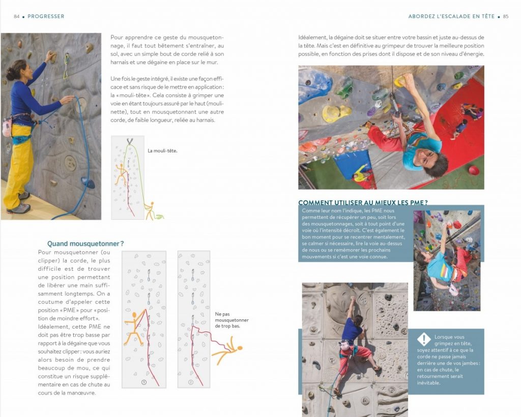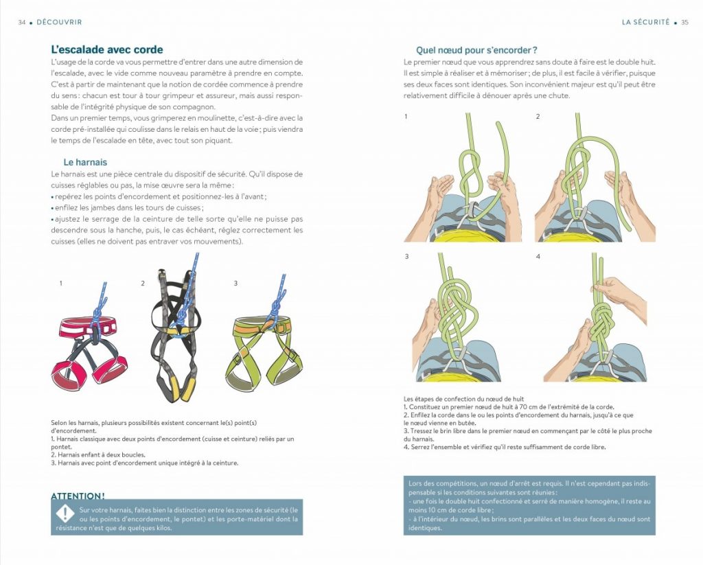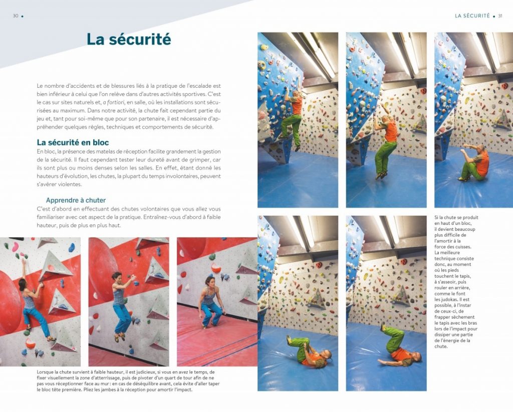 L’ouvrage aide également le débutant à partir à la découverte de ce sport dans ses moindres détails. Il revient sur les différences entre une salle de « bloc » et d’escalade, explique quelles sont les différentes structures et prises, avant de distiller des conseils sur le choix du matériel, dont les fameux chaussons ! Avec au passage un conseil très avisé : « Beaucoup de grimpeurs martyrisent leurs pieds dans des chaussons très serrés (…). Les gains de performances sont inversement proportionnels au confort et, passé un certain stade, la douleur dément l’équation chaussons serrés = efficacité !« . Un vaste chapitre consacré à la sécurité revient par ailleurs sur la manière de « bien chuter » sur les matelas de réception des salles de bloc, à réceptionner un grimpeur qui part en tête, à effectuer la bonne gestuelle pour assurer en « moulinette », à entreprendre un nœud de 8 parfait, etc. Certains termes étant abscons, les lecteurs néophytes pourront se référer à un glossaire en fin d’ouvrage pour comprendre ce qu’est une longe, la grimpe à vue, le double check ou encore la virole d’un mousqueton.