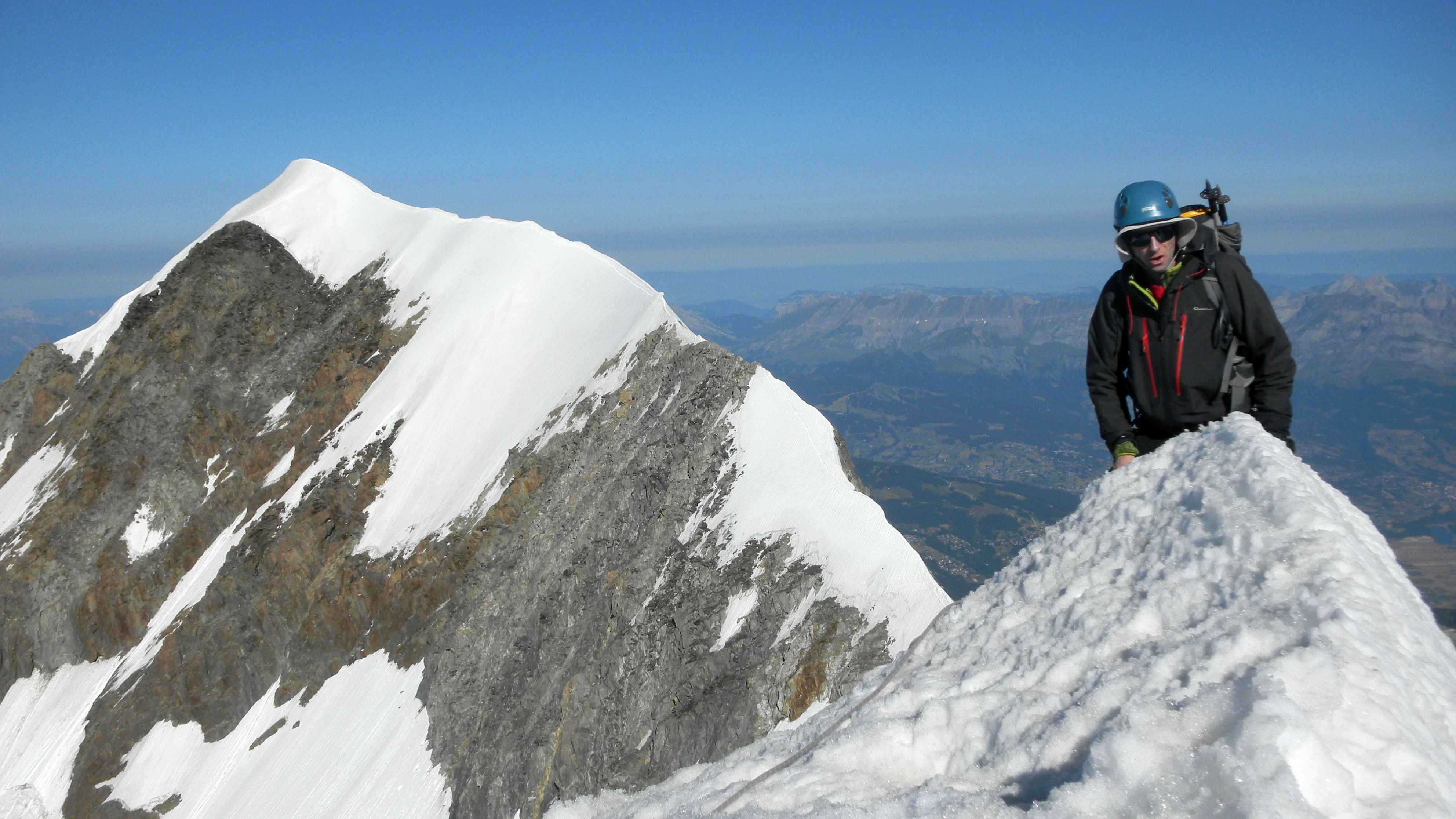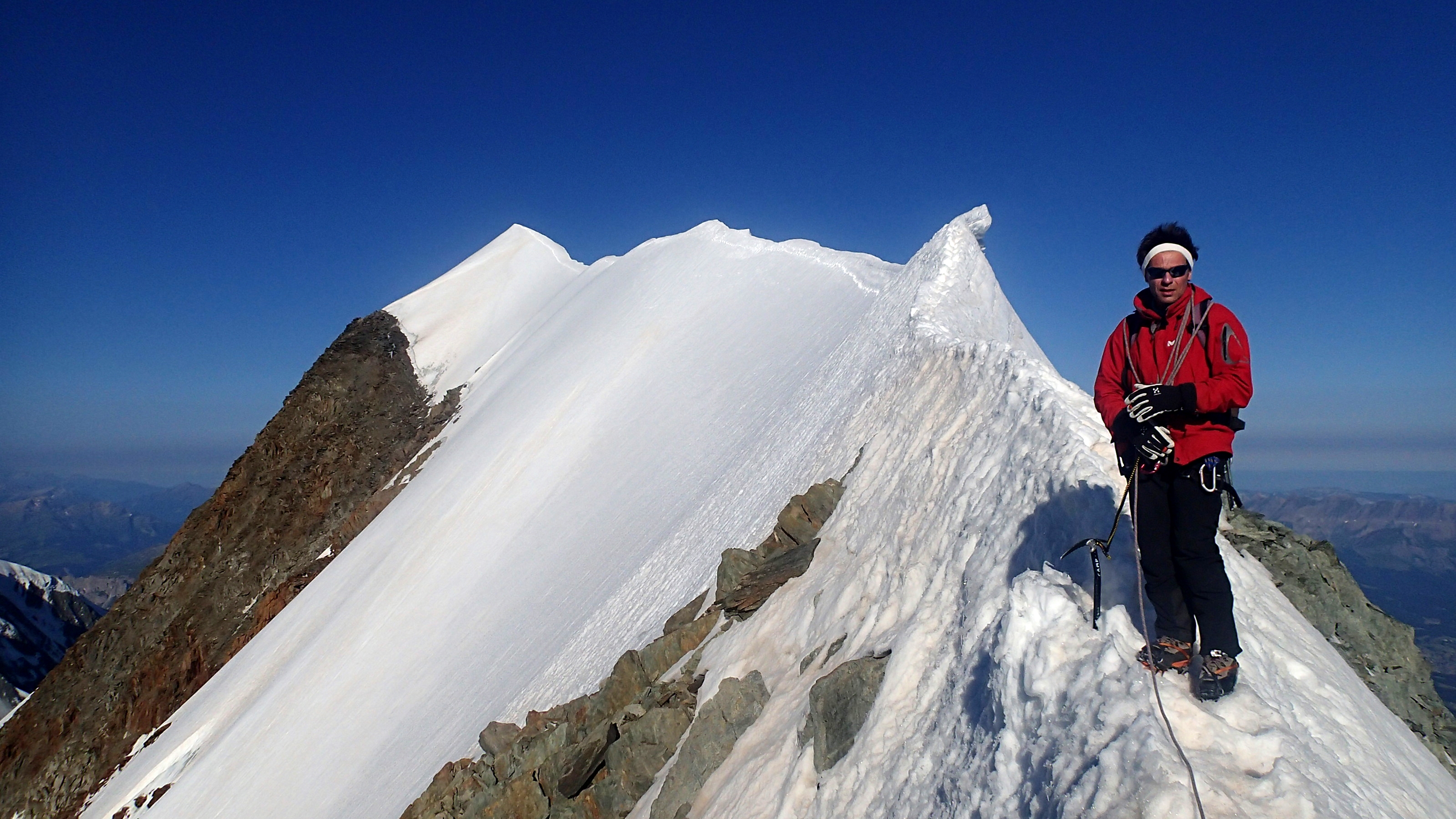 Bref, cette première partie de l’ascension s’effectue en rocher puis en remontant de longues pentes de neige jusqu’à un premier bastion rocheux vite gravi. Elle continue ensuite vers le plat de résistance après une nouvelle fine arête en neige. Nous avons fini par rejoindre la cordée du docteur au moment où celle-ci s’apprêtait à s’engager dans le bastion. Nous ne devions les croiser par la suite qu’au Mont Blanc. Ce fameux bastion, nous y avons passé un bon petit moment, l’itinéraire n’étant pas toujours évident même si le guide à Durier nous avait bien dit de « rester sur le « fil ». Oui, mais encore faut-il savoir où se trouve le fil, parfois impossible à gravir en plus ! Toujours est-il que voilà une belle escalade sur du bon rocher dans l’ensemble, composé notamment de fines écailles dont la plupart tiennent bien, tant mieux ! Peu de temps après un passage délicat, nous avons fini par rejoindre la partie en neige. Nous étions sortis du bastion et un belle trace conduisait tout droit au sommet.