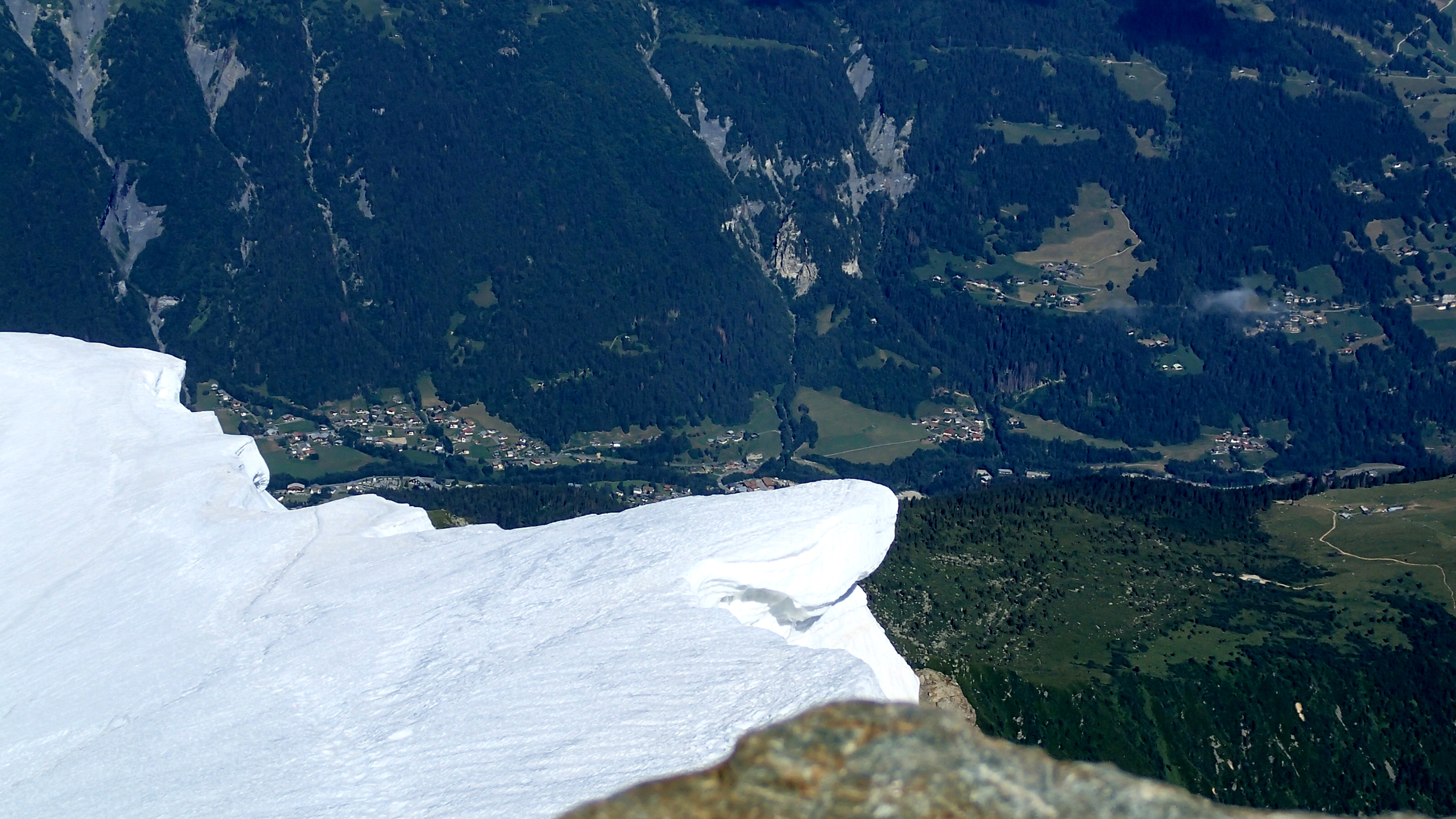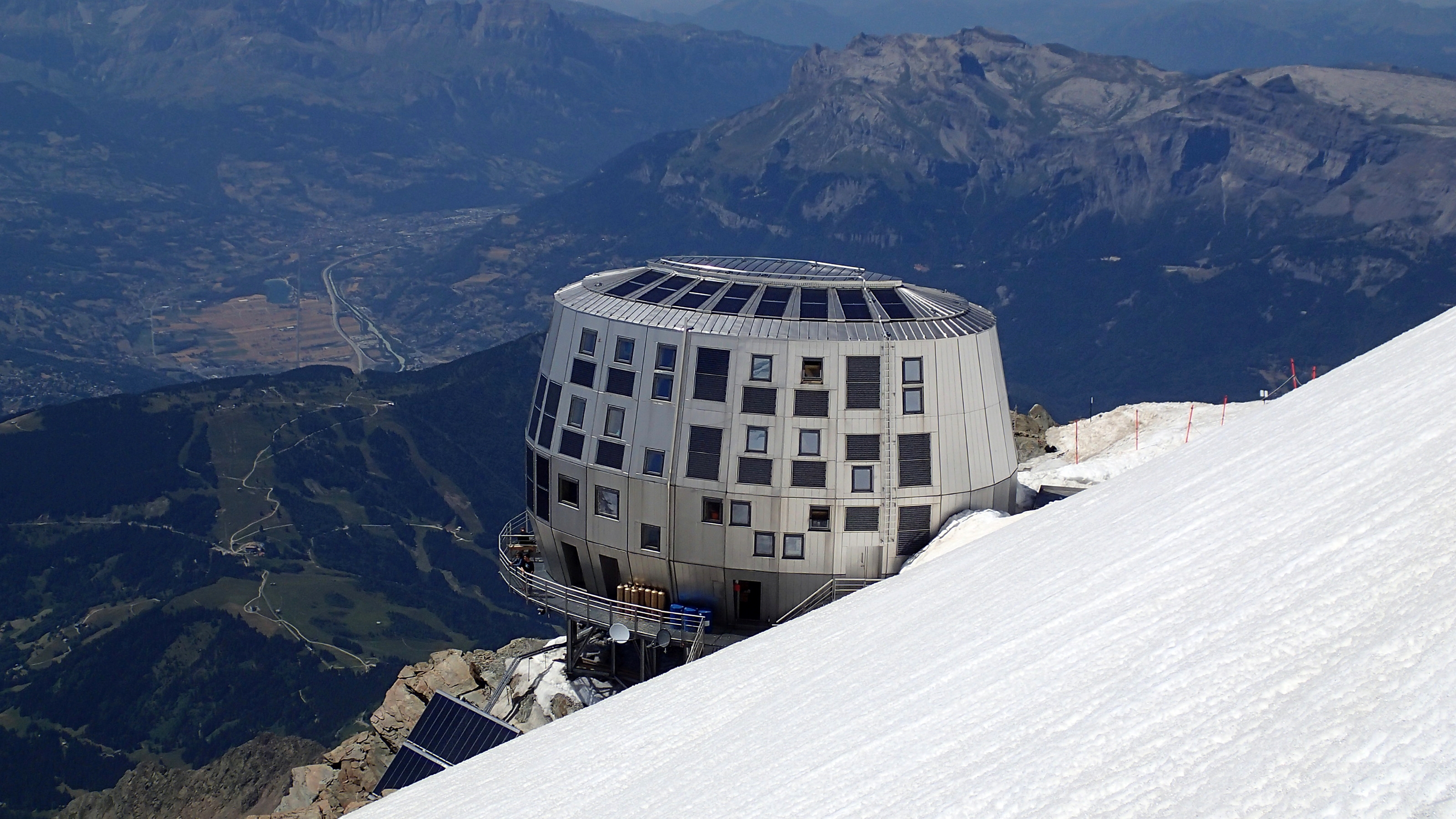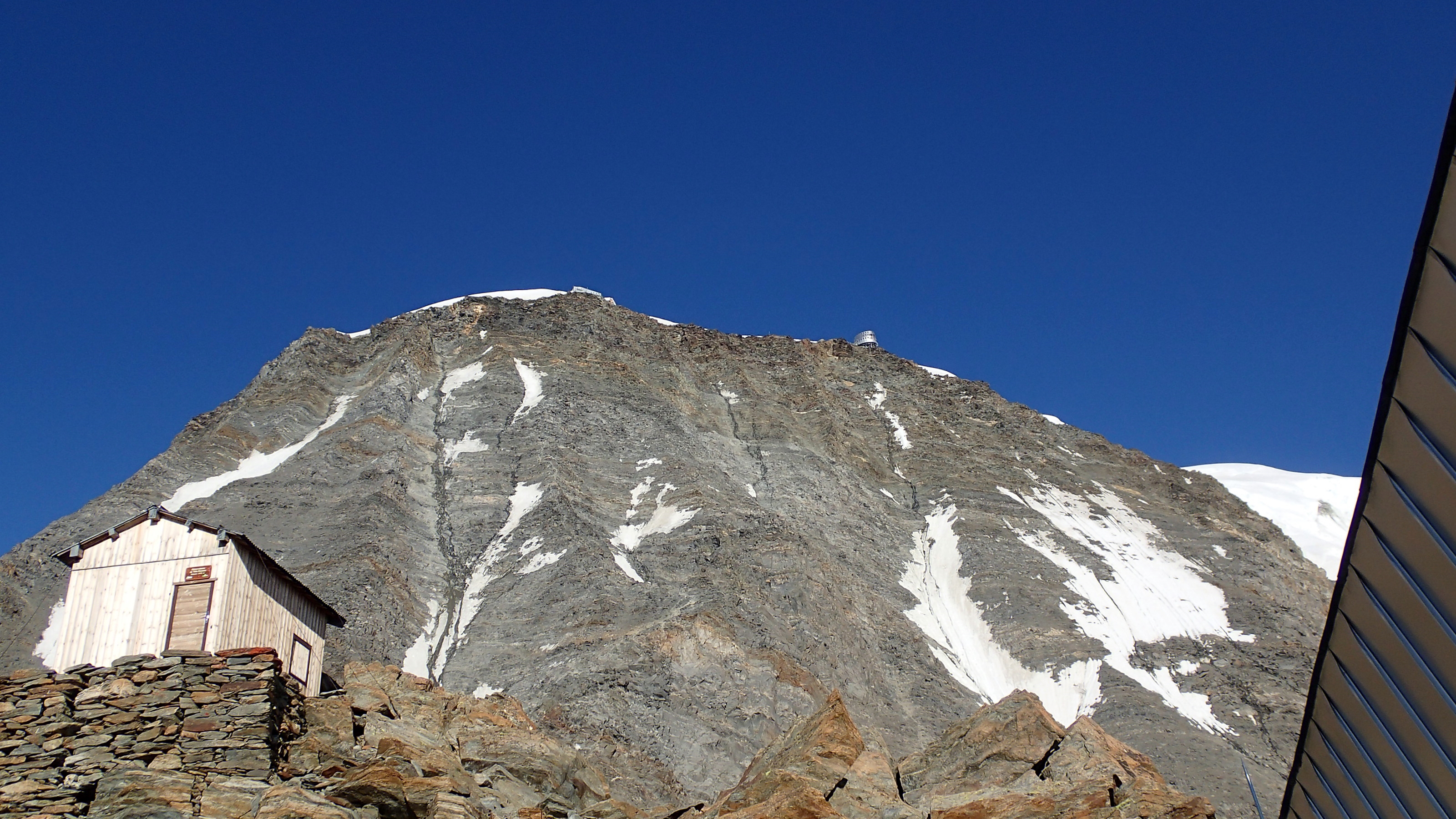Fort heureusement, il ne restait ensuite plus qu’une longue et sage pente inclinée jusqu’au nouveau refuge du Goûter qui, il faut bien le dire, est une merveille architecturale suspendue on ne sait trop comment au-dessus du vide. Son large balcon circulaire s’avère une vue imprenable sur la vallée verte en contrebas ainsi que sur la face nord ouest de Bionnassay. Nous y fîmes une halte bien méritée – véritable tour de Babel où se croisent des alpinistes du monde entier – jusqu’à même envisager d’y passer la nuit. Mais les tarifs prohibitifs nous ont vite faits reculer malgré la trentaine de places disponible ce jour-là. Du reste, nous avions encore largement le temps de parvenir jusqu’au refuge de Tête Rousse sans rater l’heure du repas. Aussitôt dit, aussitôt fait. Voilà un parcours olé olé, un plongeon pas loin de la verticale, assez souvent dans un dédale de pierrailles où les passages les plus dangereux sont assurés au moyen de câbles. Il faut dire qu’il s’agit de désescalader ni plus ni moins qu’une montagne et ainsi perdre près de 700 m de dénivelé en 3 heures environ.