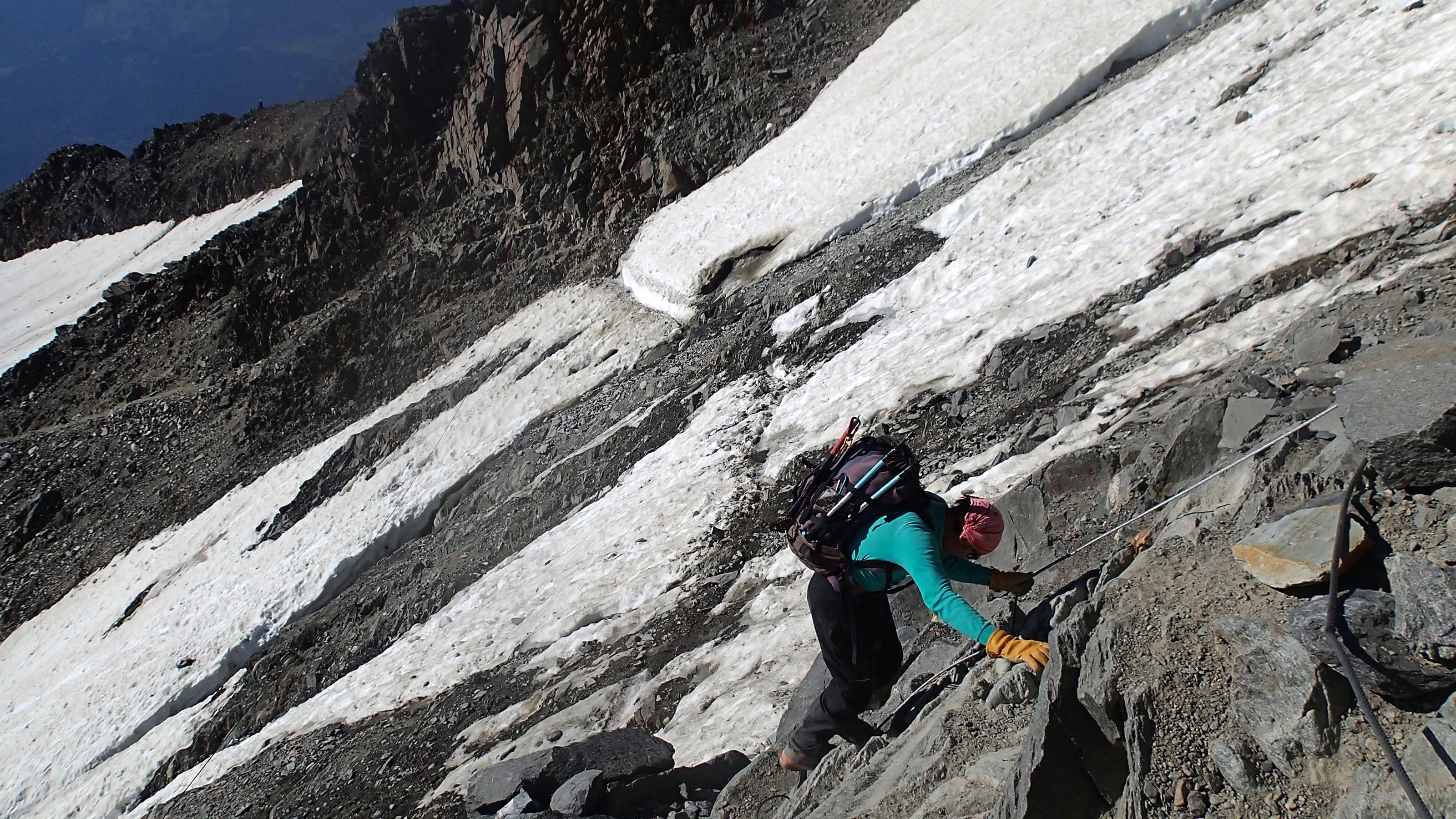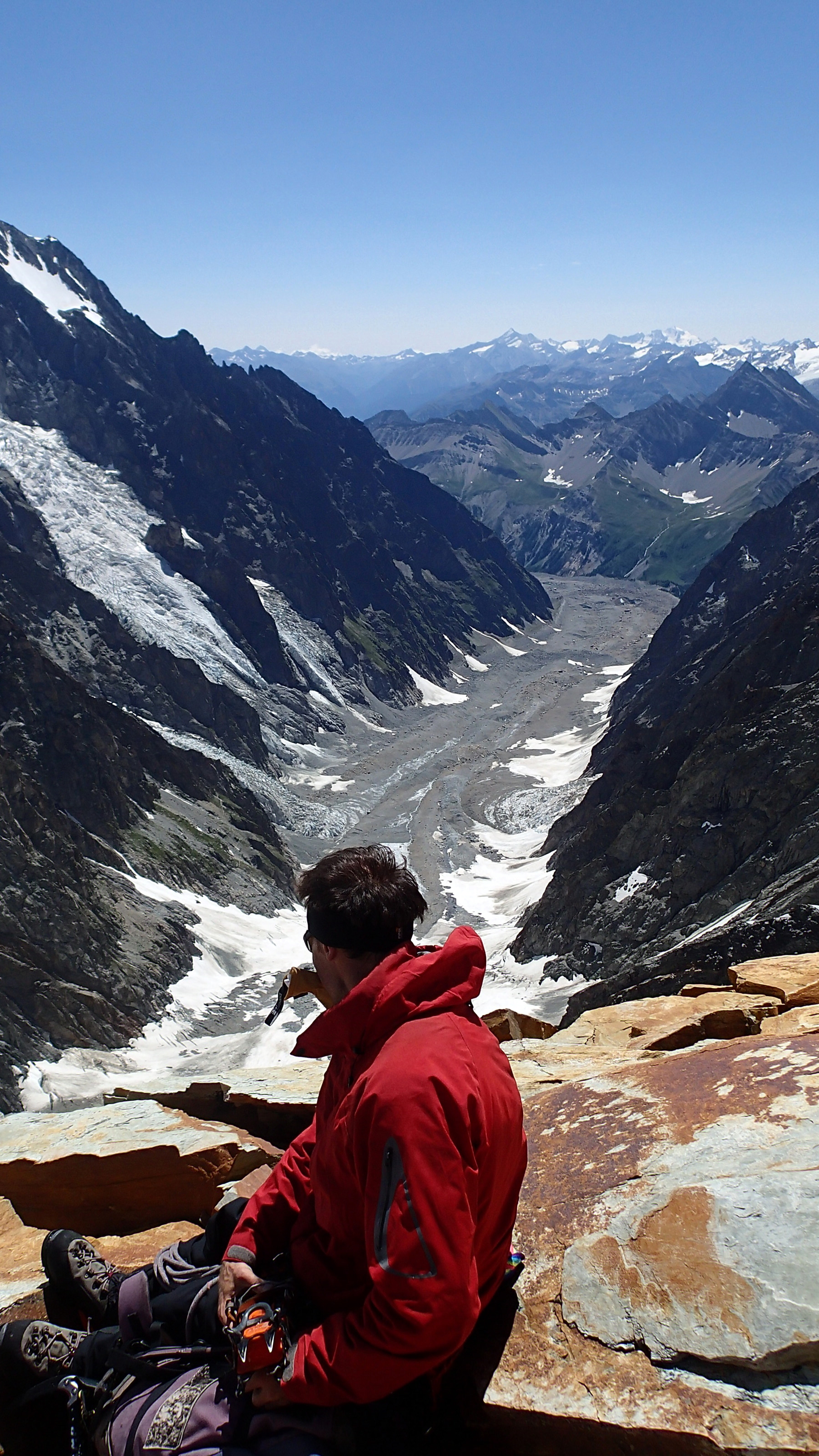 Une halte (ma quatrième en un an !) au sommet de la facile aiguille de la Bérangère s’avérait profitable avant d’attaquer la longue ascension vers le premier dôme après une première descente vers le col du même nom. Les dômes resteront à jamais un chef-d’œuvre de la nature. Quel plaisir de les fouler à nouveau même si, à un endroit, le réchauffement avait poursuivi son lent travail de sape : une crevasse s’était formée en versant ouest de la trace. Un trou béant qui n’augurait rien de bon pour la suite de l’été. Arrivés au cinquième dôme en suivant au loin la cordée du médecin, nous allions finalement quitter cette fine et agréable arête saupoudrée de neige pour aborder un mix composé tour à tour de caillasse et de neige, jusqu’à un rappel caché mais néanmoins repérable grâce à des traces de peinture rouge.