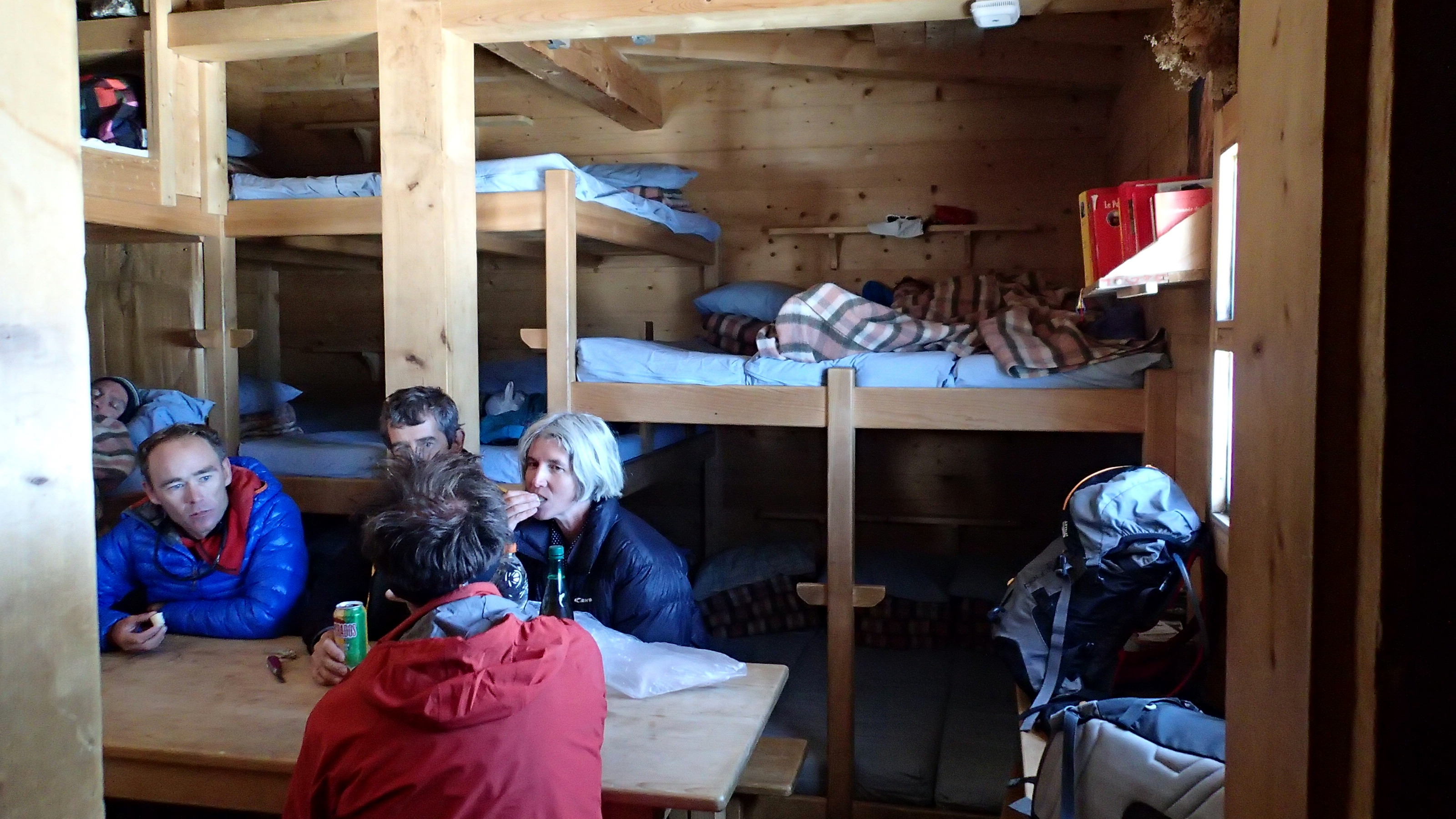 A cet endroit, d’immenses blocs de pierre semblaient posés les uns sur les autres prêts semble-t-il à se disloquer tel un château de cartes au moindre coup de vent ! Il ne fallait pas trop traîner dans les environs. Nous avons continué à descendre en direction de Durier dans un capharnaüm de pierrailles et autres rochers de toute taille où Olivier a laissé échapper un gant qui n’est heureusement pas allé bien loin. Puis, ce fut une nouvelle arête en neige très fine où j’ai dû remettre mes crampons pour plus de précaution. Et enfin l’arrivée au refuge à la mi-journée où, c’est le cas de le dire, nous allions trouver refuge pour la nuit. Un peu affamés, nous avons eu droit à une excellente omelette de la part de Marion, exemplaire jeune gardienne depuis plusieurs saisons déjà, très au fait de la montagne et de ses alpinistes de passage ! Durier, sorte de minuscule oasis perdu dans l’immensité minérale, est un refuge optimisé avec soin. La cuisine d’un côté, les couchages de l’autre, une table au milieu, les chiottes à l’extérieur, cela suffit à requinquer n’importe quel courageux avant l’attaque de Bionnassay tôt le lendemain matin.