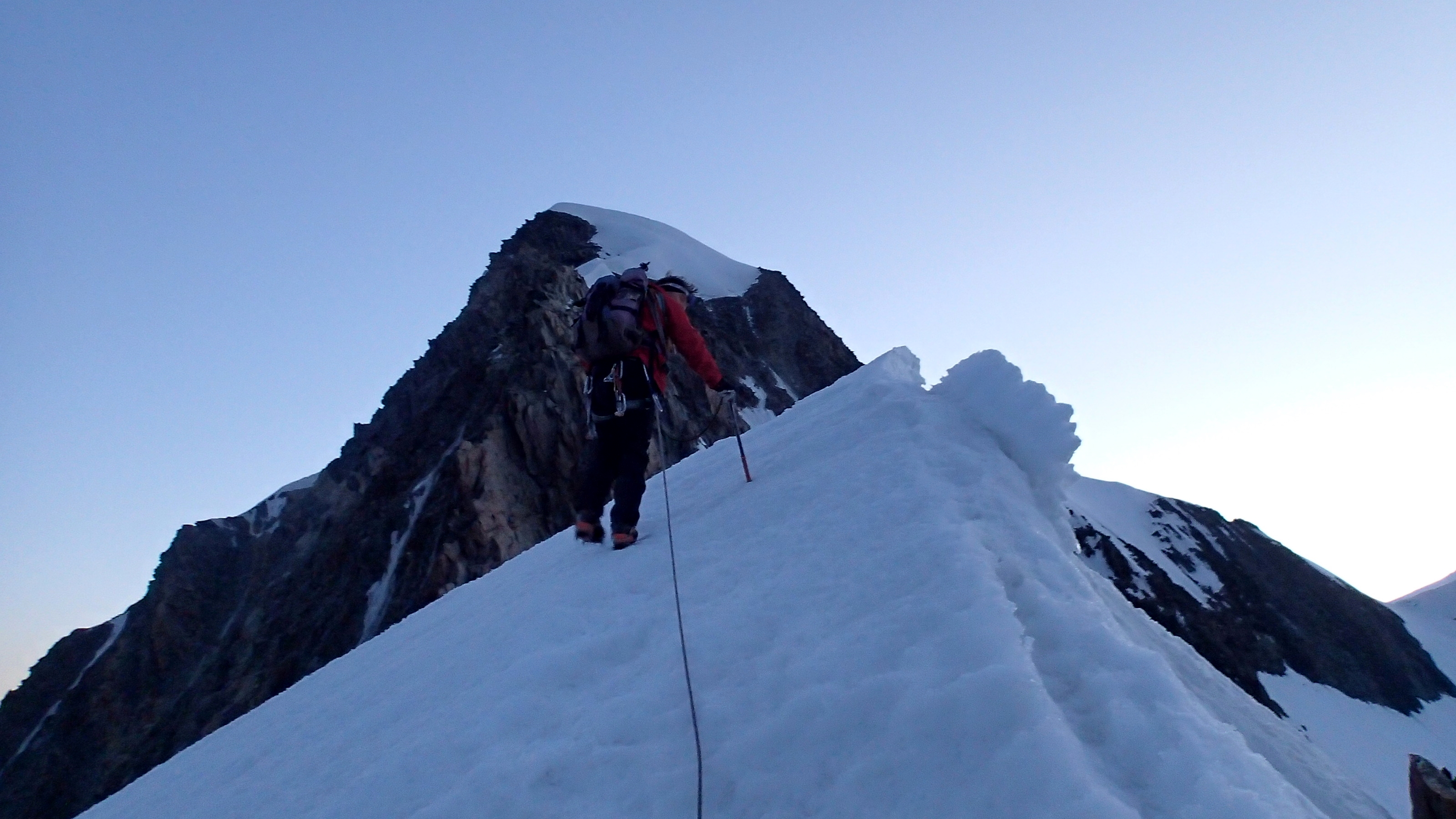 Quoi qu’il en soit, le clou du spectacle se situe bien là, à travers cette montée à Bionnassay depuis le refuge Durier au petit matin. De la caillasse, une crête en neige puis le fameux bastion rocheux où Olivier a un peu cherché l’itinéraire, et enfin cette ascension finale vers la fine arête, sorte de progression vers le ciel tout bleu ce jour là. Le lente descente vers le col du même nom puis la remontée vers le rocheux piton des Italiens fut également un ravissement.