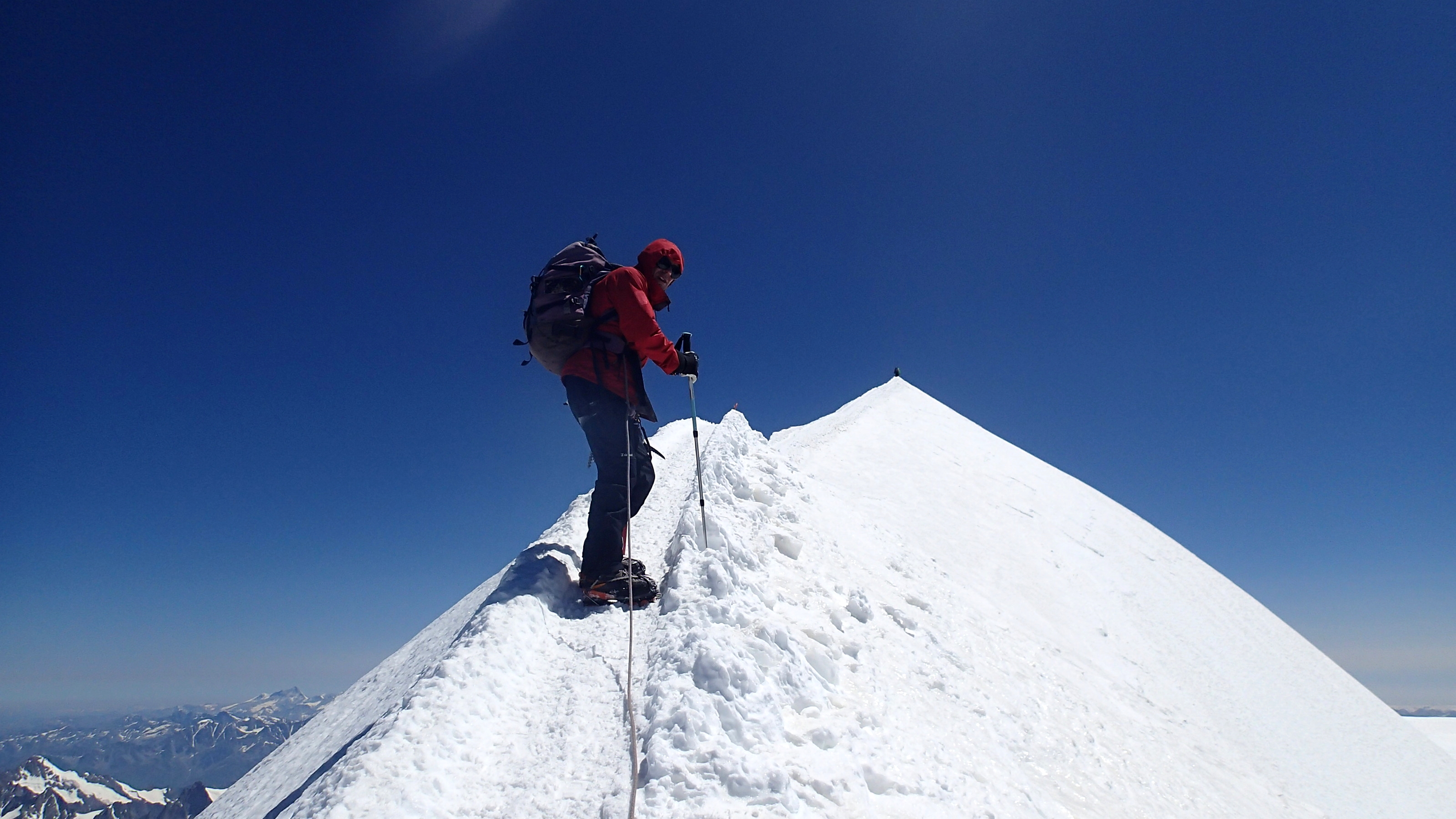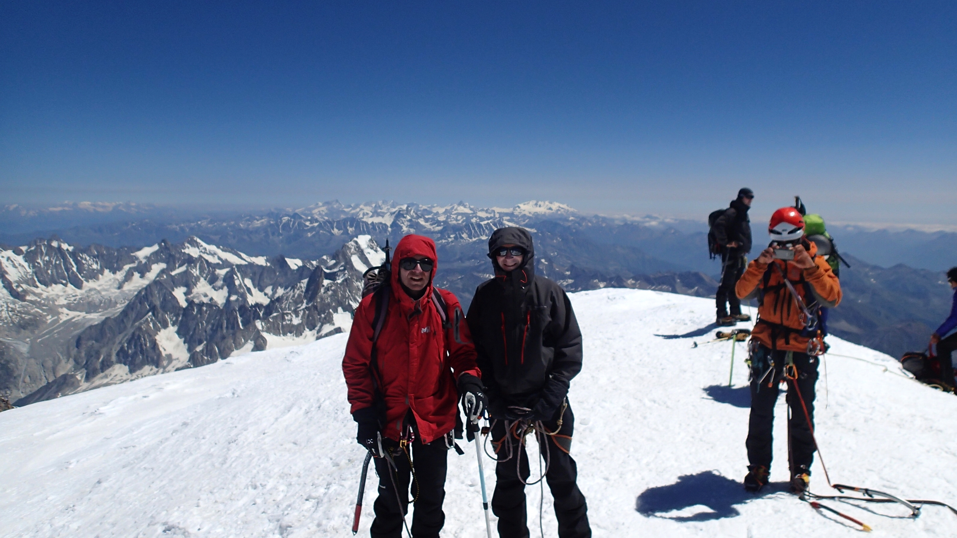 Le mental m’a certes aidé durant cette longue ascension, d’abord jusqu’au premier palier du refuge Vallot, puis lors de l’attaque de l’arête des Bosses et enfin durant la pente finale vers le large dôme du toit de l’Europe. Il y avait à ce moment-là une dizaine de personnes au sommet. Congratulations, prises de photos et tour d’horizon depuis ce belvédère évidemment imprenable, sans doute la plus belle vue des Alpes puisque la plus haute. Et pourtant, bien que très content d’être là, je songeai avoir été bien plus fier d’atteindre le sommet de l’aiguille Verte deux ans plus-tôt, une ascension qui se mérite et qui ne se laisse pas déflorer aussi facilement que celle du mont Blanc !