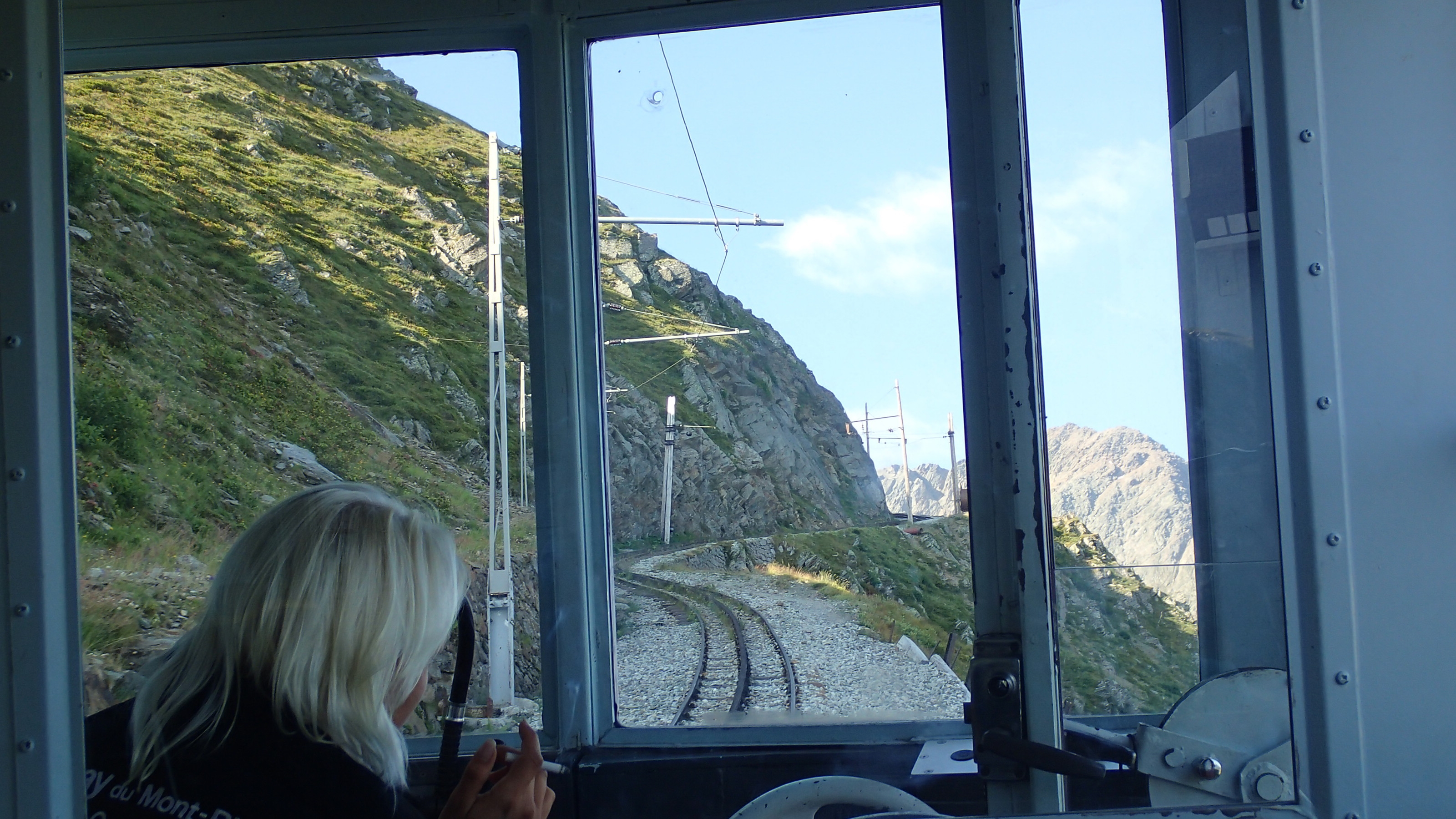 D’ailleurs, une semaine après notre traversée, cette voie « normale » (devenue anormale à cause du réchauffement) a été bouclée par les autorités à cause du danger devenu trop important : http://goo.gl/OMOnXx. Tête Rousse, ce donc fut le calme après la mauvaise tempête. Nous y avons dégusté avidement deux bols de soupe aux pois cassés, un régal après cette promenade de santé ! Couchés de bonne heure pour ne pas rater le premier départ du petit train, nous avons mis les voiles le lendemain vers 7 h. Après une dernière halte au refuge du Nid d’Aigle face à la langue glaciaire de Bionnassay, nous avons emprunté l’élégant tramway du Mont Blanc (http://goo.gl/v5cSjQ) qui, en un peu plus d’une heure, nous a transportés jusqu’à Saint-Gervais. Ce fut un grand bonheur que de se retrouver au beau milieu de la chlorophylle après 3 jours d’univers minéral. Il ne nous restait plus qu’à faire du stop afin de dégoter une âme charitable qui nous véhiculerait jusqu’au Cugnon, là où nous avions garé la voiture. Aussitôt dit, aussitôt fait ! Une brave dame, tenant chambres d’hôtes en vallée des Contamines, nous a gentiment emmenés à destination tout en pestant contre les impôts, le gouvernement et tutti quanti… vive la France !!!