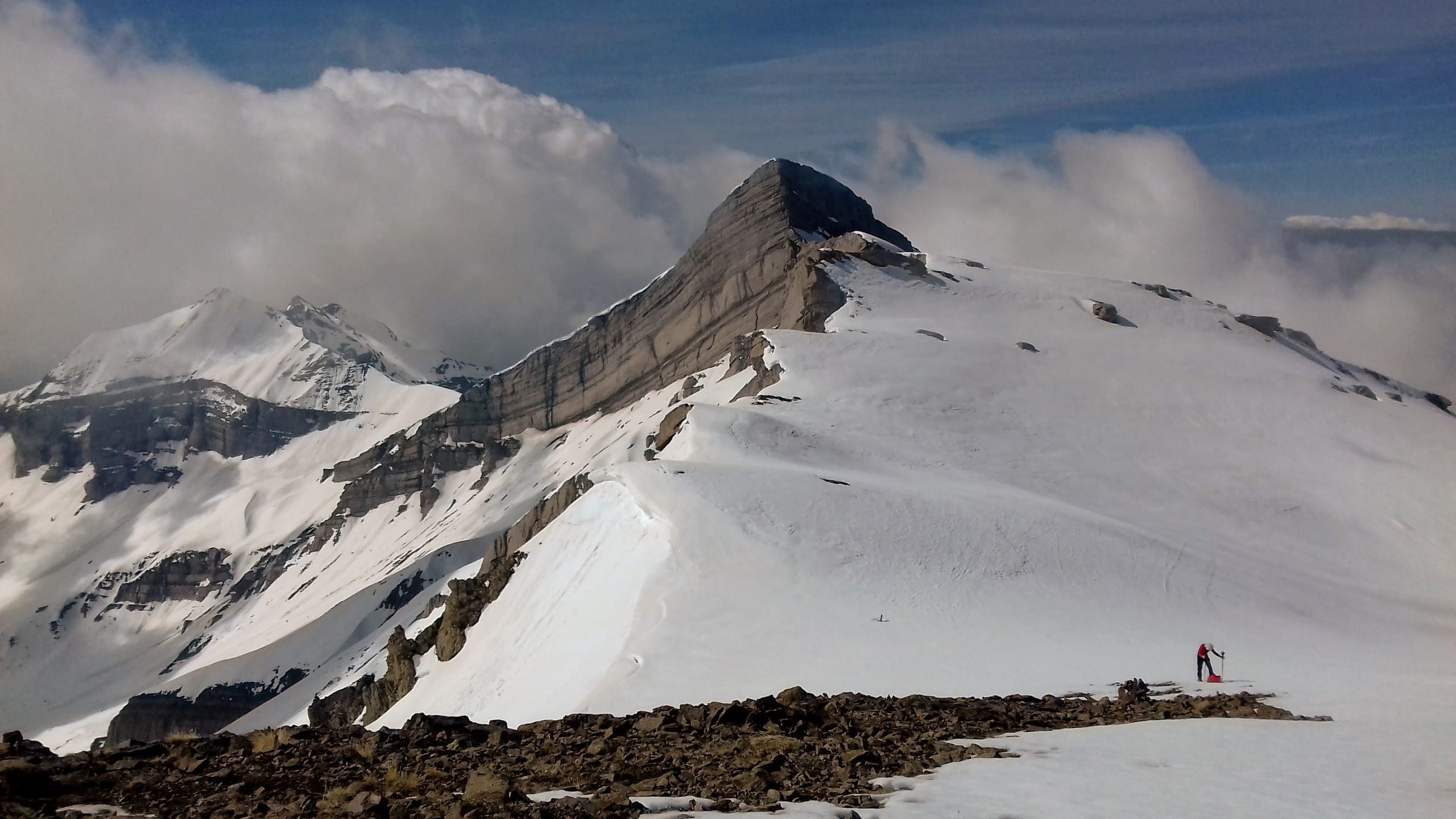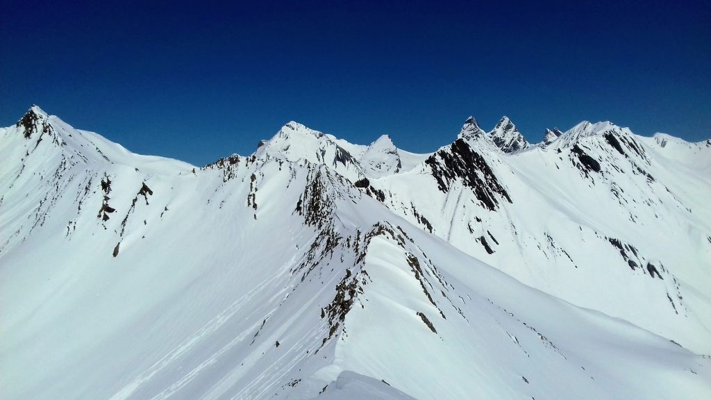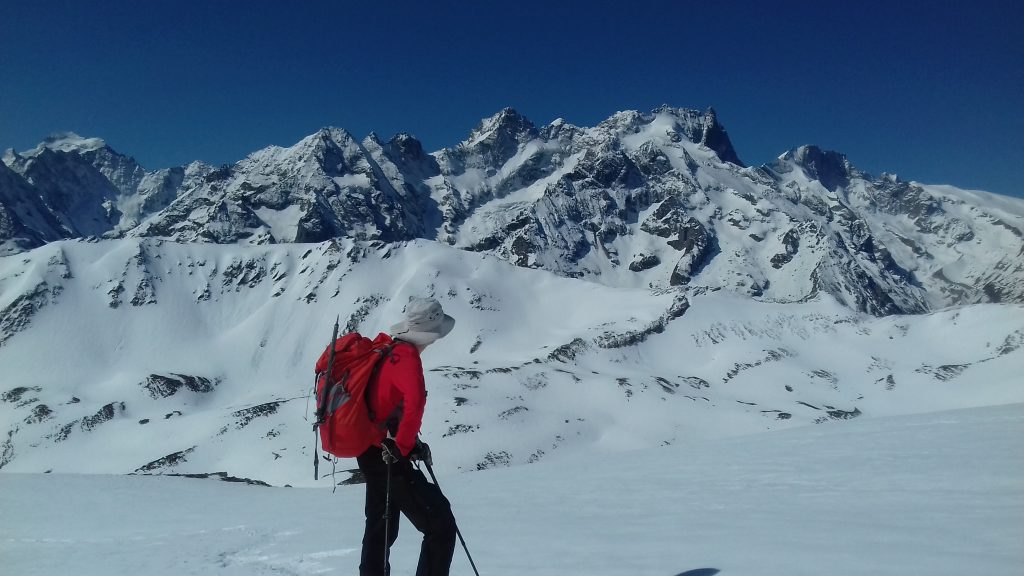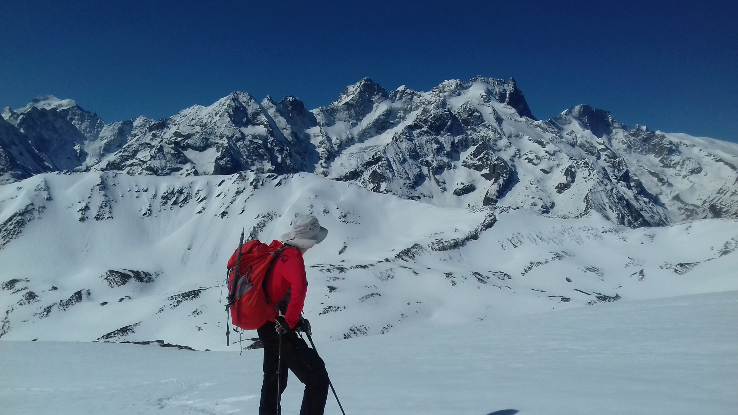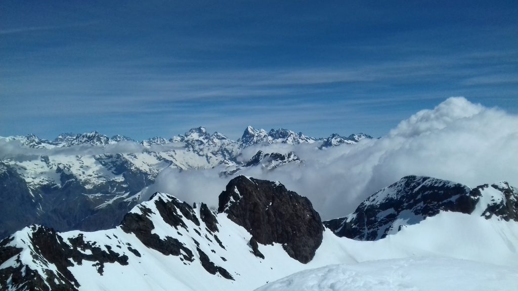 Pas de souci côté avalanche, les coulées ayant déjà eu lieu, et le risque sur Météo France restant bloqué sur 2 (échelle de 1 à 5). Un peu plus haut, la pente se raidit pour nous mener sur une superbe crête aux alentour des 2800 m d’altitude. Cette sorte de col permet aux skieurs de randonnée en provenance du nord de rejoindre également le Pic Blanc du Galibier par une dernière montée facile. Le point de vue du sommet est remarquable : nous sommes aux premières loges pour découvrir les géants de l’Oisans, de la Barre des Ecrins à gauche au Râteau à droite. Surprise, le sommet, étroit, est envahi de sympathiques septuagénaires skis au pied, et un dernier larron, 80 ans passé, est en train de les rejoindre en remontant la pente finale. Nous nous sommes dit que nous avions donc encore de 15 à 20 ans de pratique montagnarde devant nous ! Nous sommes redescendus par le même chemin avant de réintégrer nos pénates en Valjouffrey, le jour suivant étant consacré au gros morceau de cette sortie : le Vieux Chaillol dans le Champsaur.