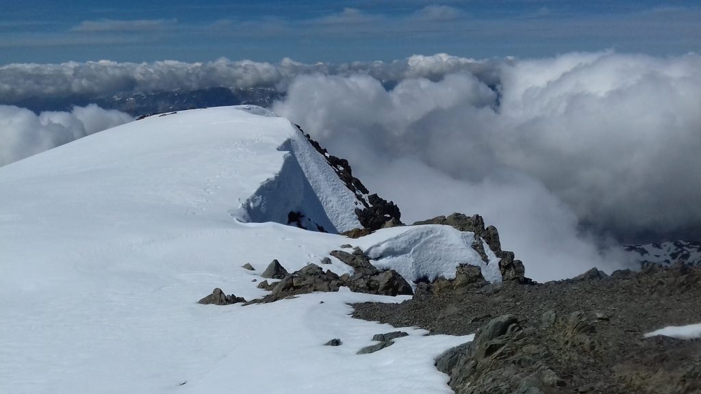 Durant notre progression, nous avons recroisé les trailers, et échangé des photos souvenirs. L’un portait des crampons hyper légers s’adaptant à ses chaussures de trail, et le second… pas grand chose, hormis des semelles ad hoc qui ne lui auront pourtant pas évité une chute sans gravité peu de temps avant de nous rencontrer ! Ils nous ont prévenu que la neige de la pente terminale était en bien moins bonne condition que celle que nous avions eu jusqu’ici. Ils n’avaient pas tort… Il nous restait un bon bout de chemin avant le sommet et ces quelques 500 m de dénivelée encore à venir pas données gratuitement ! Après avoir fait d’amples virages ou attaqué directement la face, nous avons fini par arriver à l’antécime. J’avoue avoir eu du mal à gravir la dernière pente, et ai débrayé en mode petite vitesse et grande lenteur. Finalement bien heureux d’être arrivé « at the top » sans âme qui vive (et on le comprend !), nous avons enfin pu apprécier le paysage du Champsaur du haut de ce Vieux Chaillol. Cependant, pas question de flâner sachant que le retour allait être long, très long.
